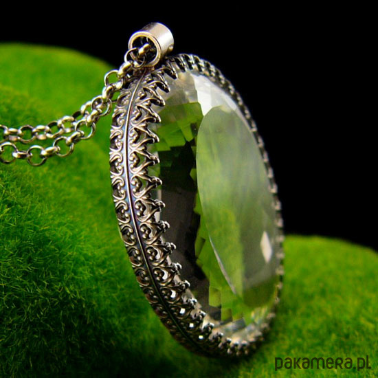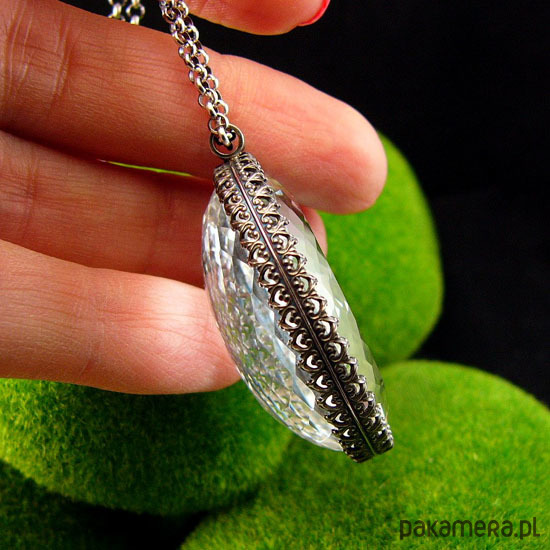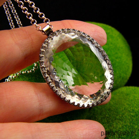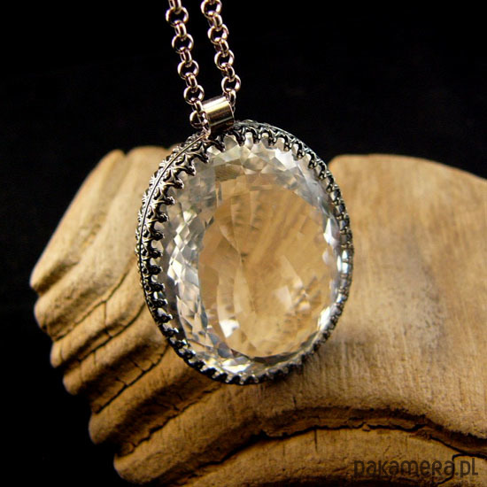 Wyjątkowy naszyjnik wykonany od podstaw ręcznie z przepięknej urody ogromnego naturalnego fasetowanego Kryształu Górskiego klasy AAA. Ma 39,5 ct. (karata). Wisior jest dwustronny. Kryształ Górski - zwany jest Królem Kryształów lub Solą Ziemi - ma najsilniejsze działanie oczyszczające. Jest naturalnym odpromiennikiem. Gdy masz już swój, dbaj o to aby nie był dotykany przez inne osoby. Polecany do wszystkich znaków zodiaku :), Srebro próby 925, przyczernione przetarte polerowane. Długość wisiora 4 cm a szerokość kamienia 2,8 cm – długi łańcuszek 70 cm w tym regulacja 5 cm. Manekin o rzeczywistych rozmiarach ludzkich. Nehesi Design.