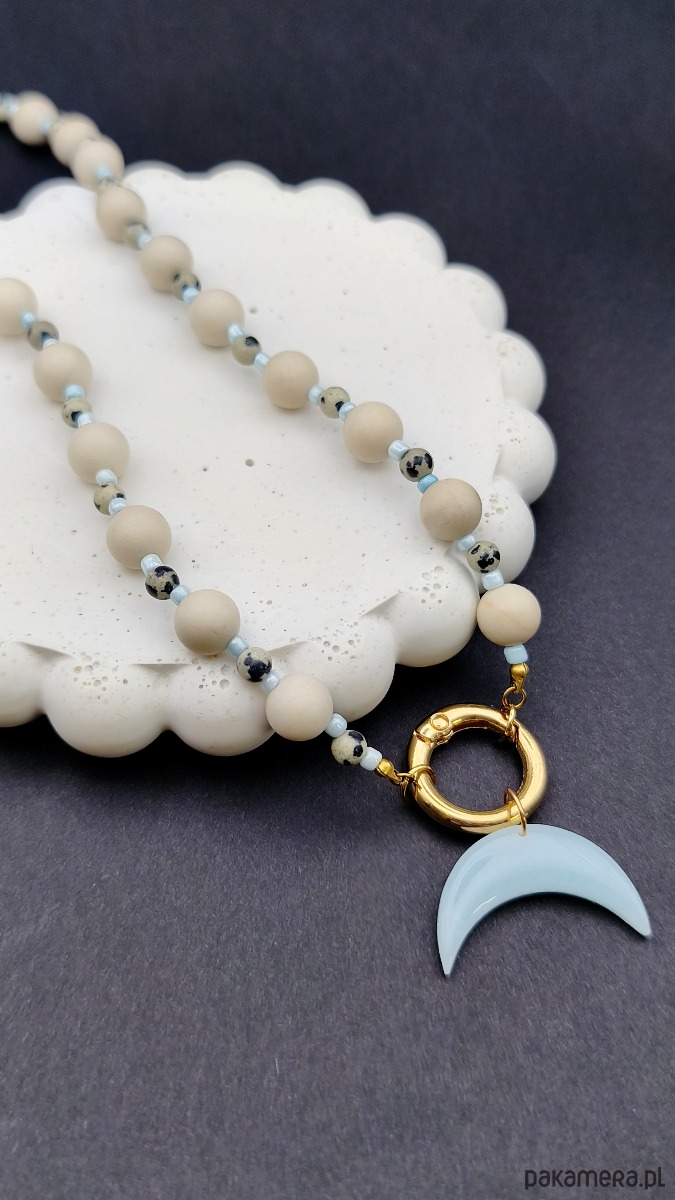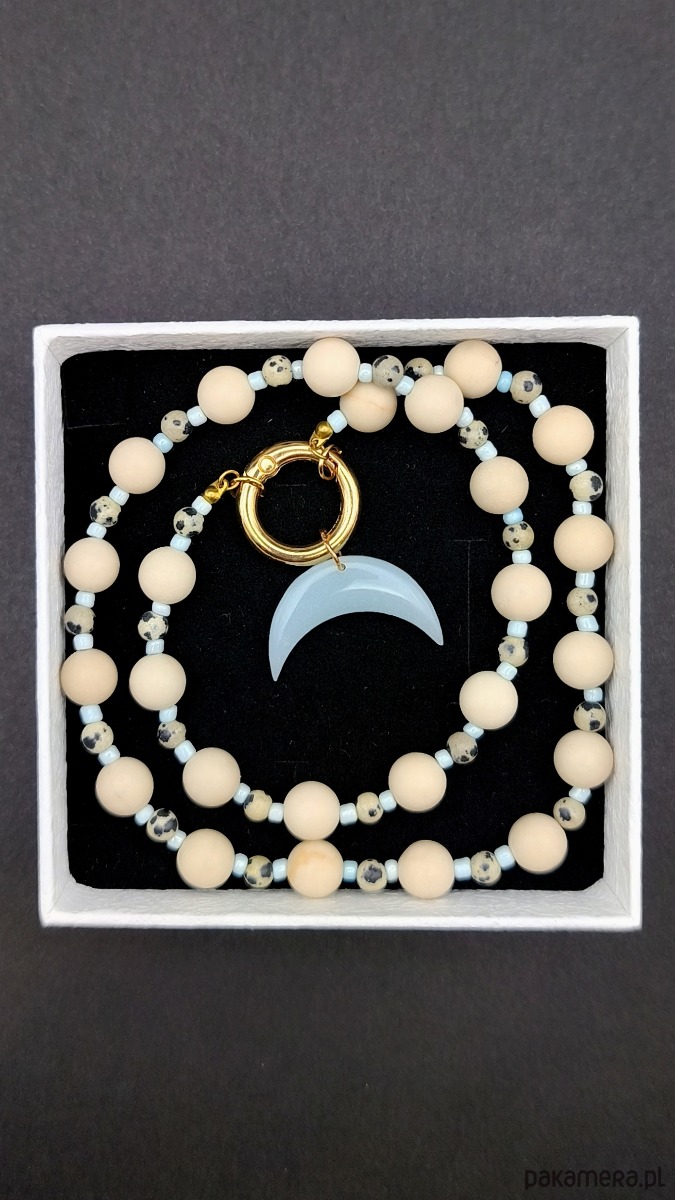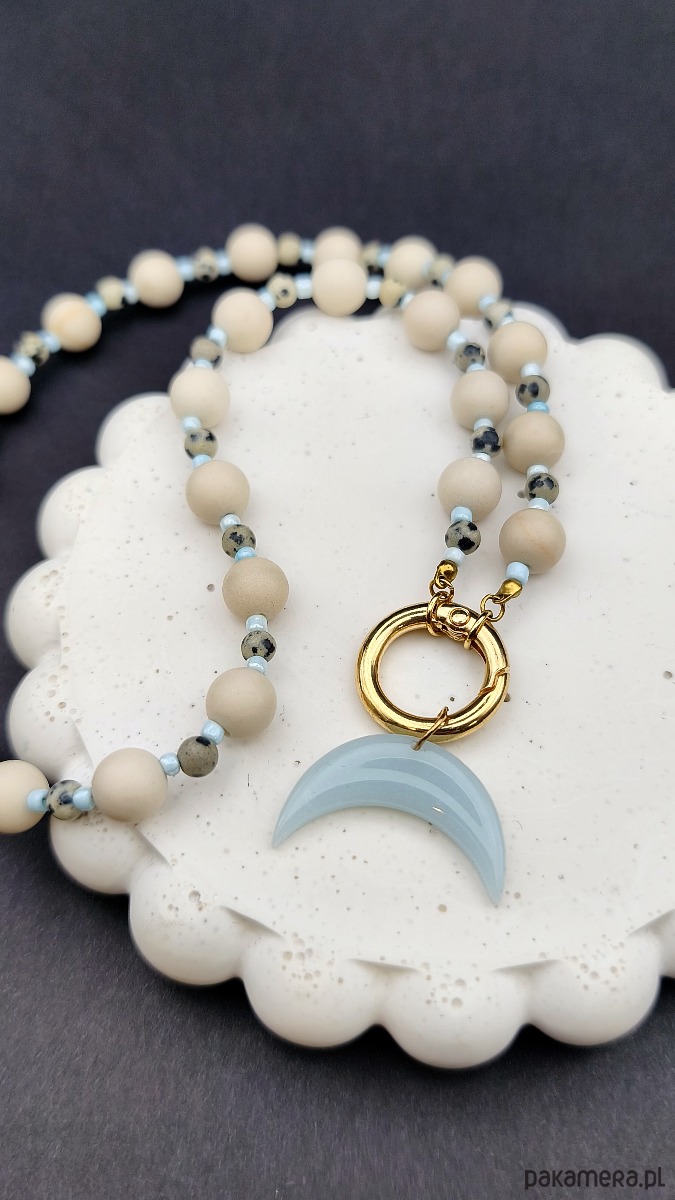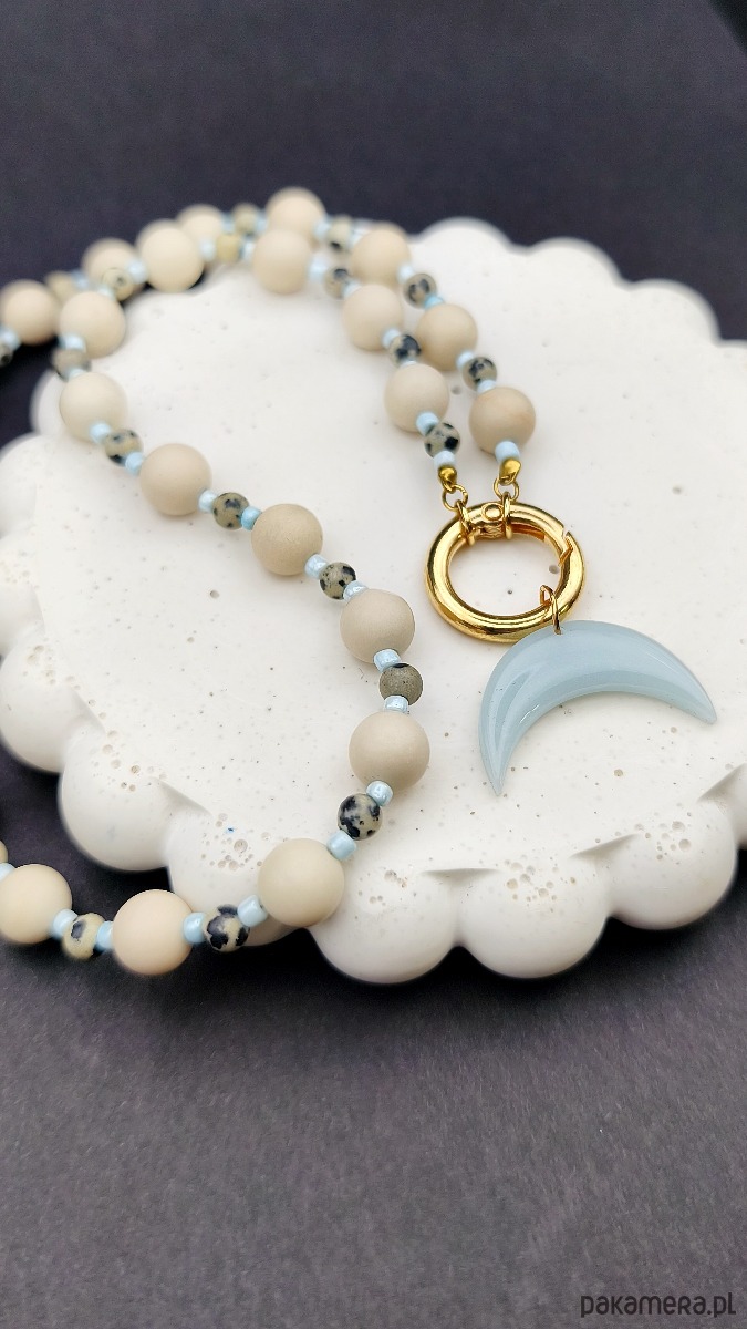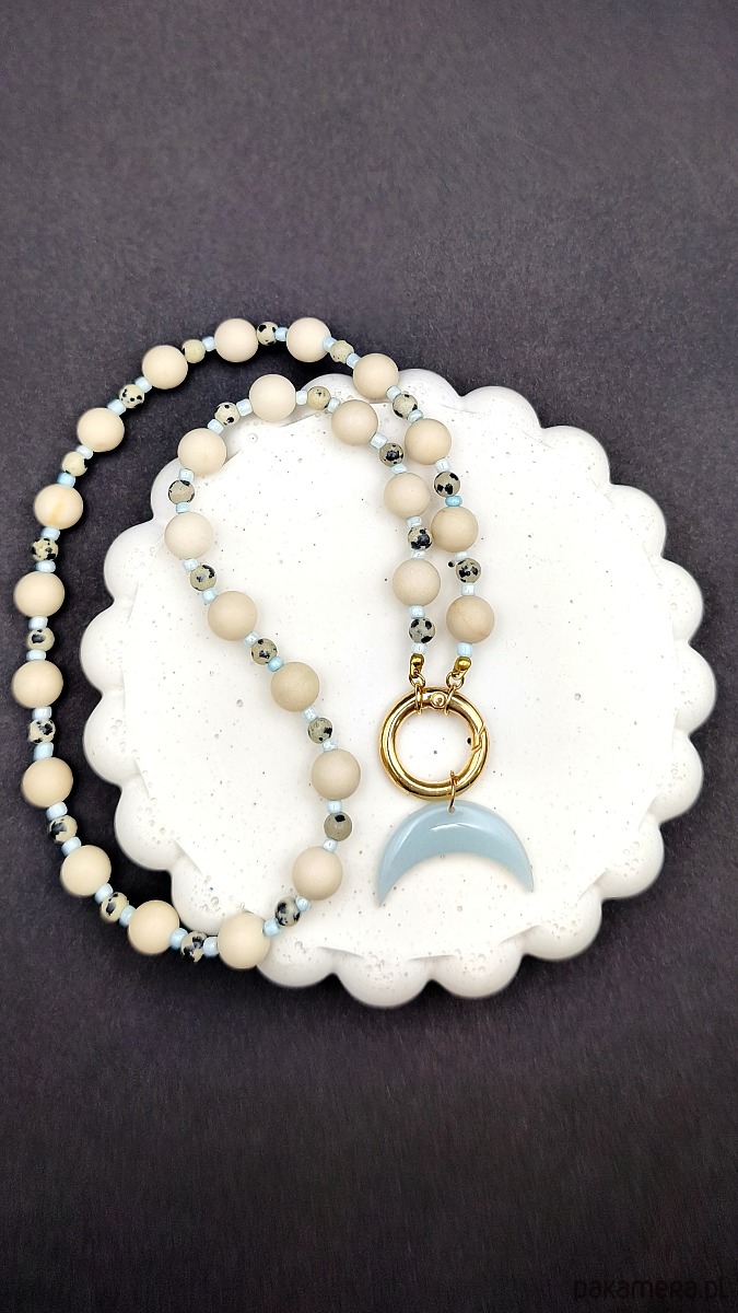 Naszyjnik z kamienia rzecznego oraz jaspisu dalmatyńskiego, uzupełniony koralikami w odcieniach błękitu.