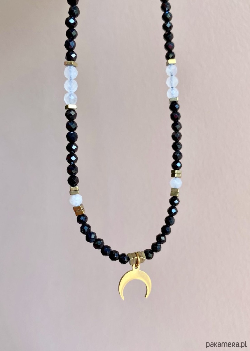 Naszyjnik z Czarnym Turmalinem i Kamieniem Księżycowym jest krótki, zrobiony na zasadzie chokera, w całości wykonany z czarnego turmalinu, kamienia księżycowego (3-3,5mm), złotych hematytów oraz ze stali szlachetnej w kolorze złotym. Wielkość Księżyca wynosi około 10mm. Długość naszyjnika to około 40cm.