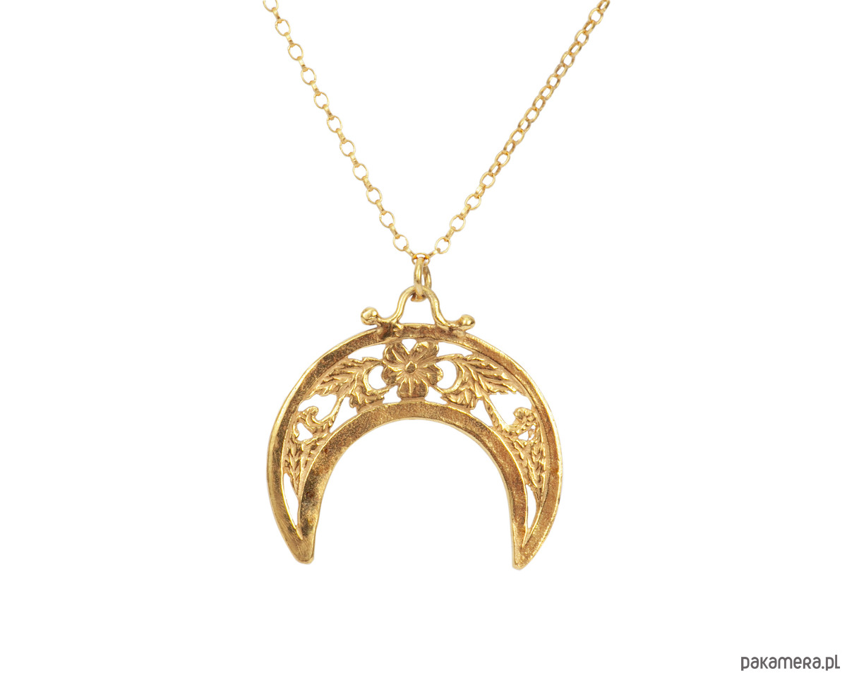 Naszyjnik z zawieszką z motywem Lunuli - symbolicznego półksiężyca z motywem kwiatowym. Wykonane ze srebra pokrytego 24k złotem.- rozmiar zawieszki ok 40mm- długość łańcuszka - 55 cm (Uwaga, na zdjęciu wizerunkowym naszyjnik jest nieco dłuższy niż w rzeczywistości)Biżuteria z kolekcji FLORA, zainspirowanej królestwem roślin i pięknem natury. W biżuterii zostały zaklęte delikatne wzory, modele vintage z motywem kwiatów, liści i symboli florystycznych, tak abyś mogła poczuć ich łagodną siłę i moc.