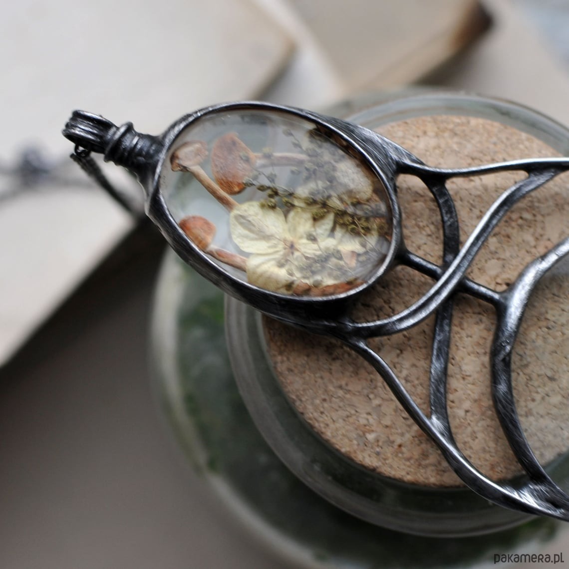 W ozdobnym szkiełku umieszczone zostały grzybki suszone.
