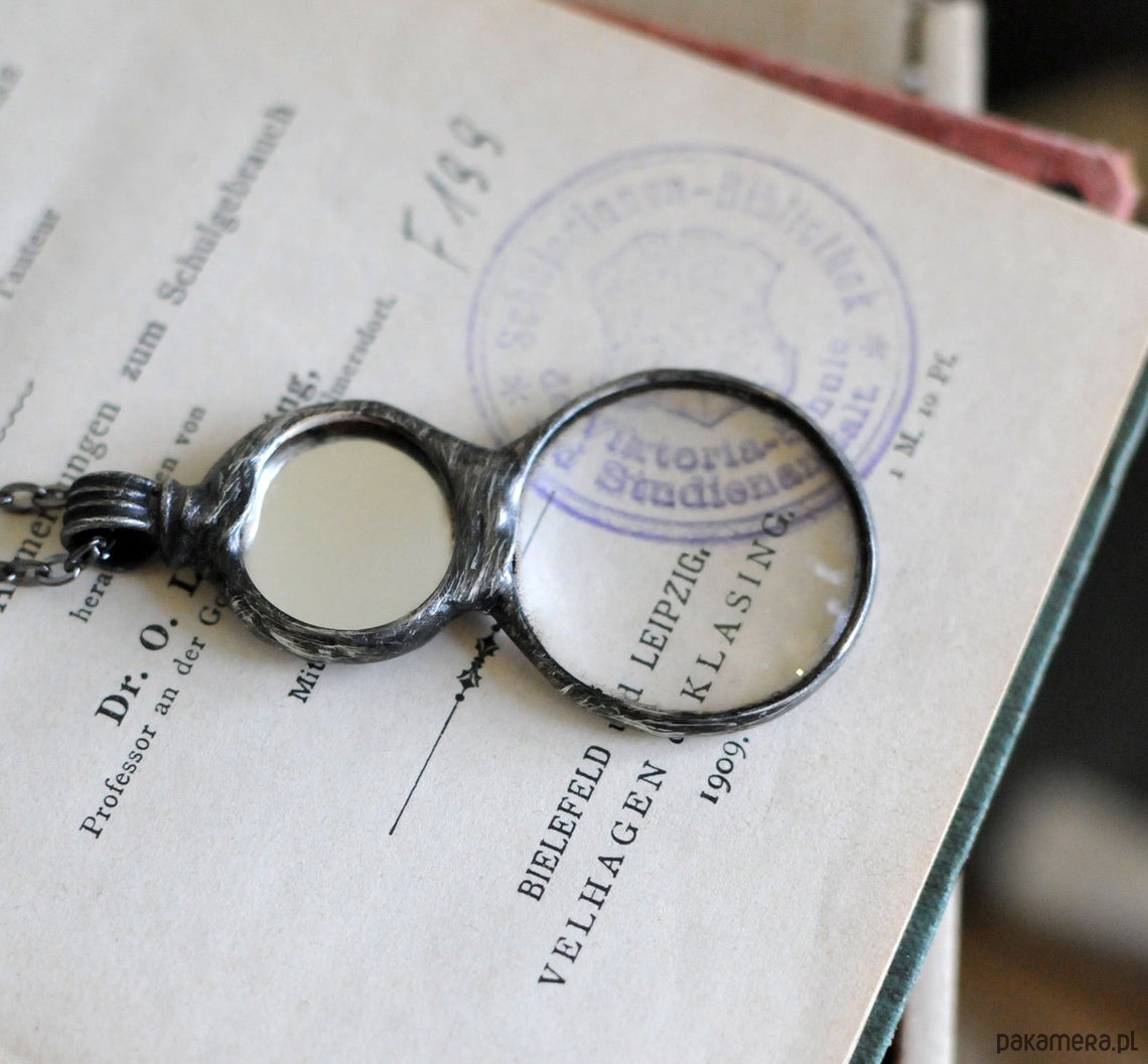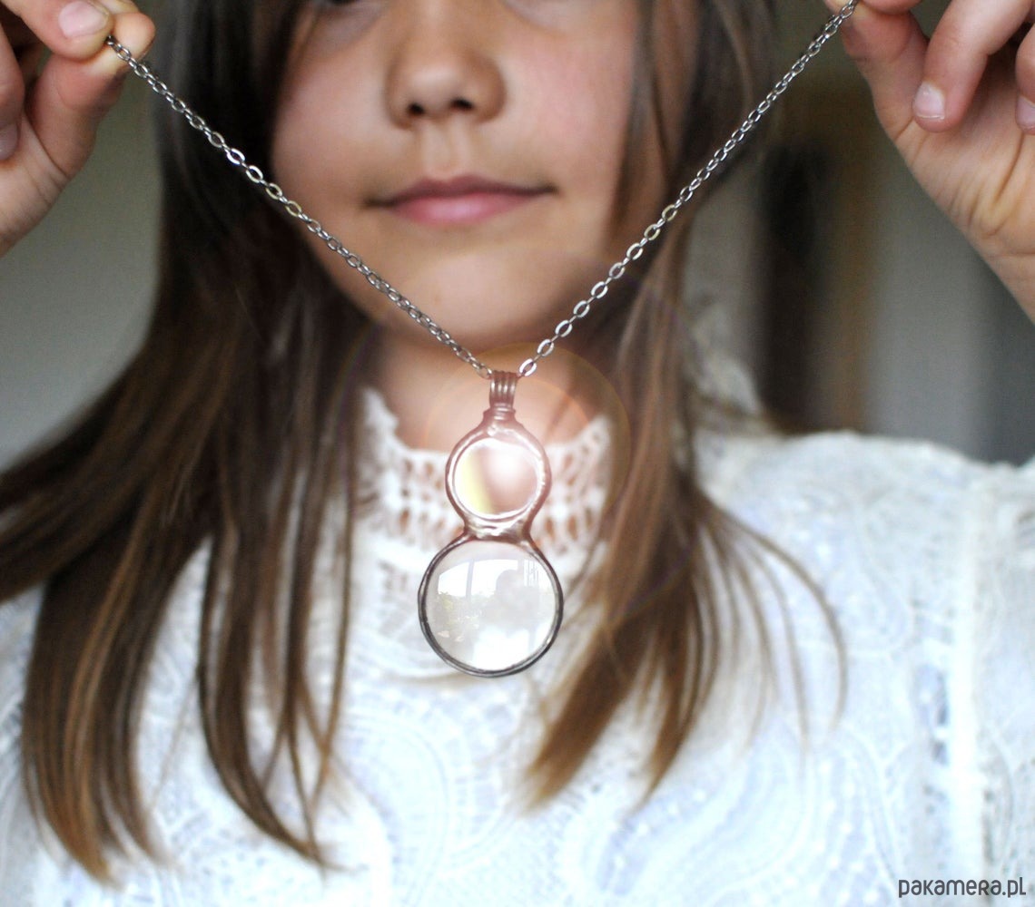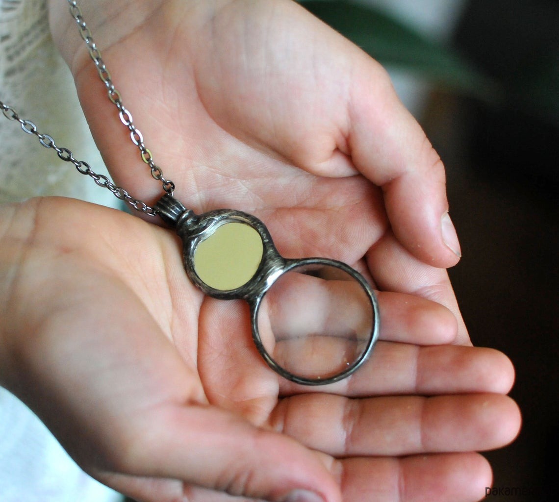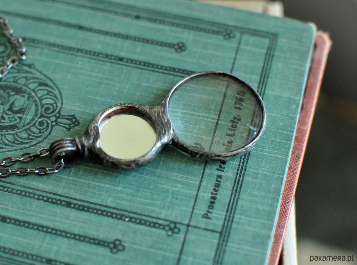 Wisiorek wykonany ze szkła powiększającego i małego lusterka.