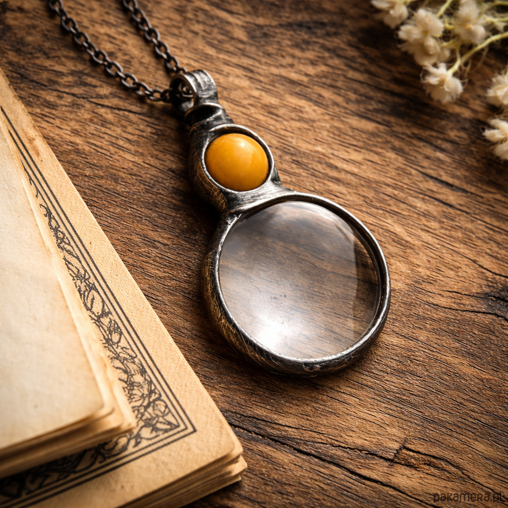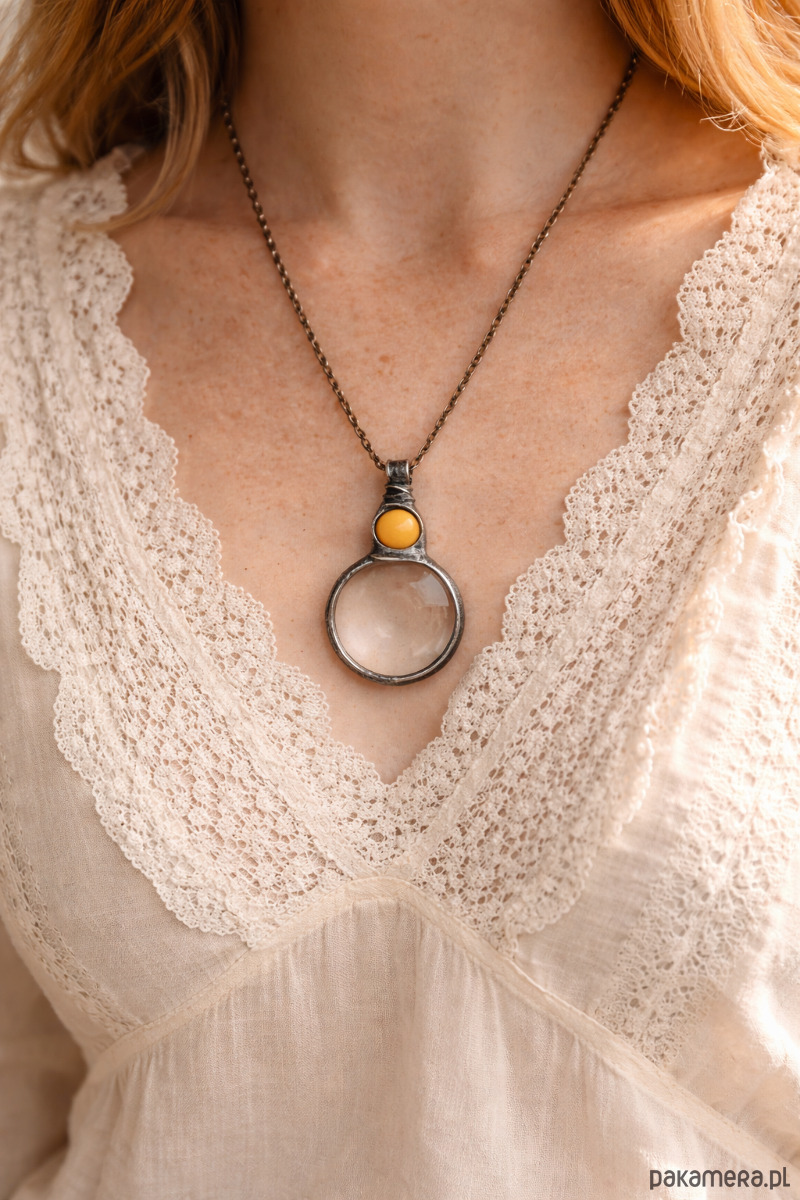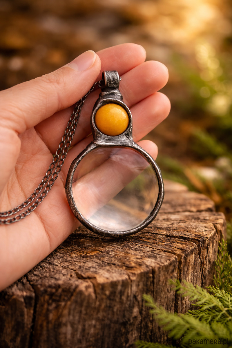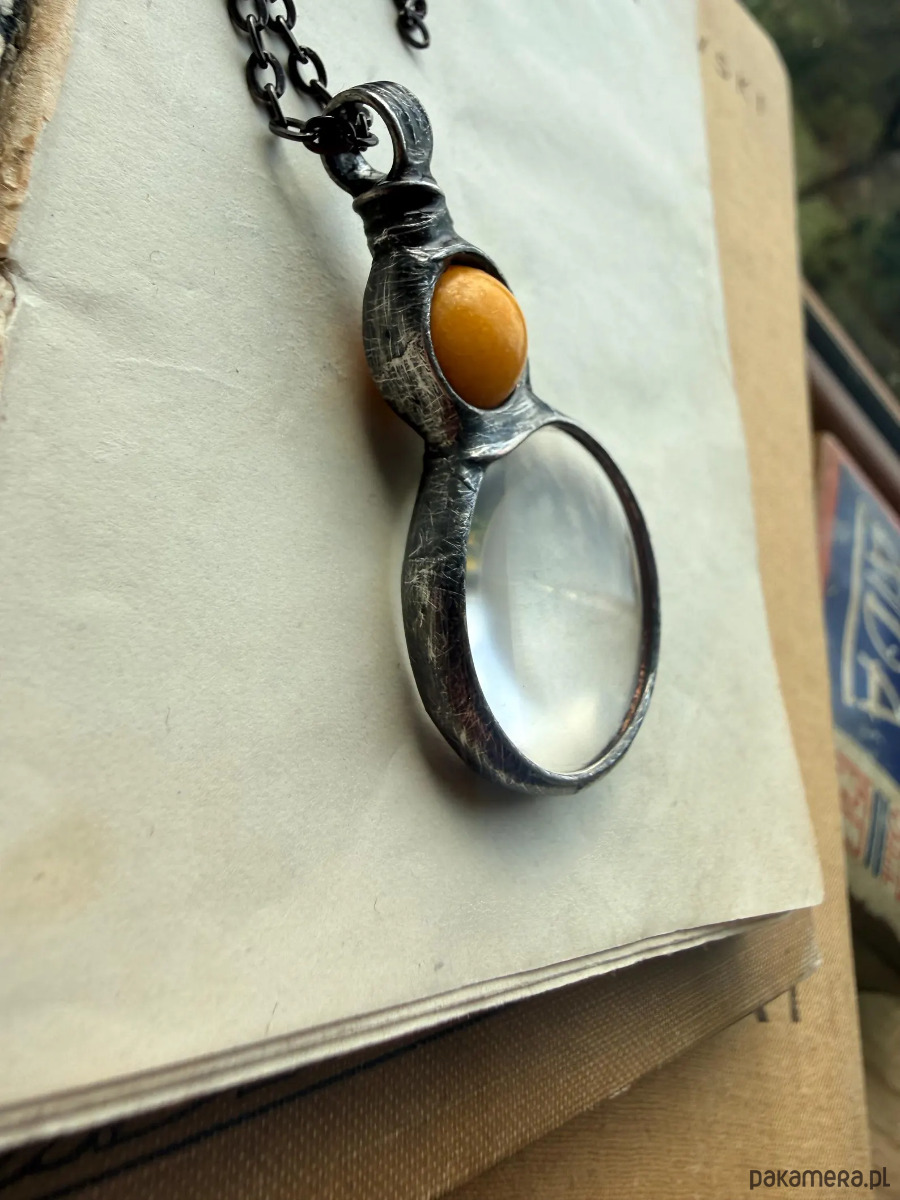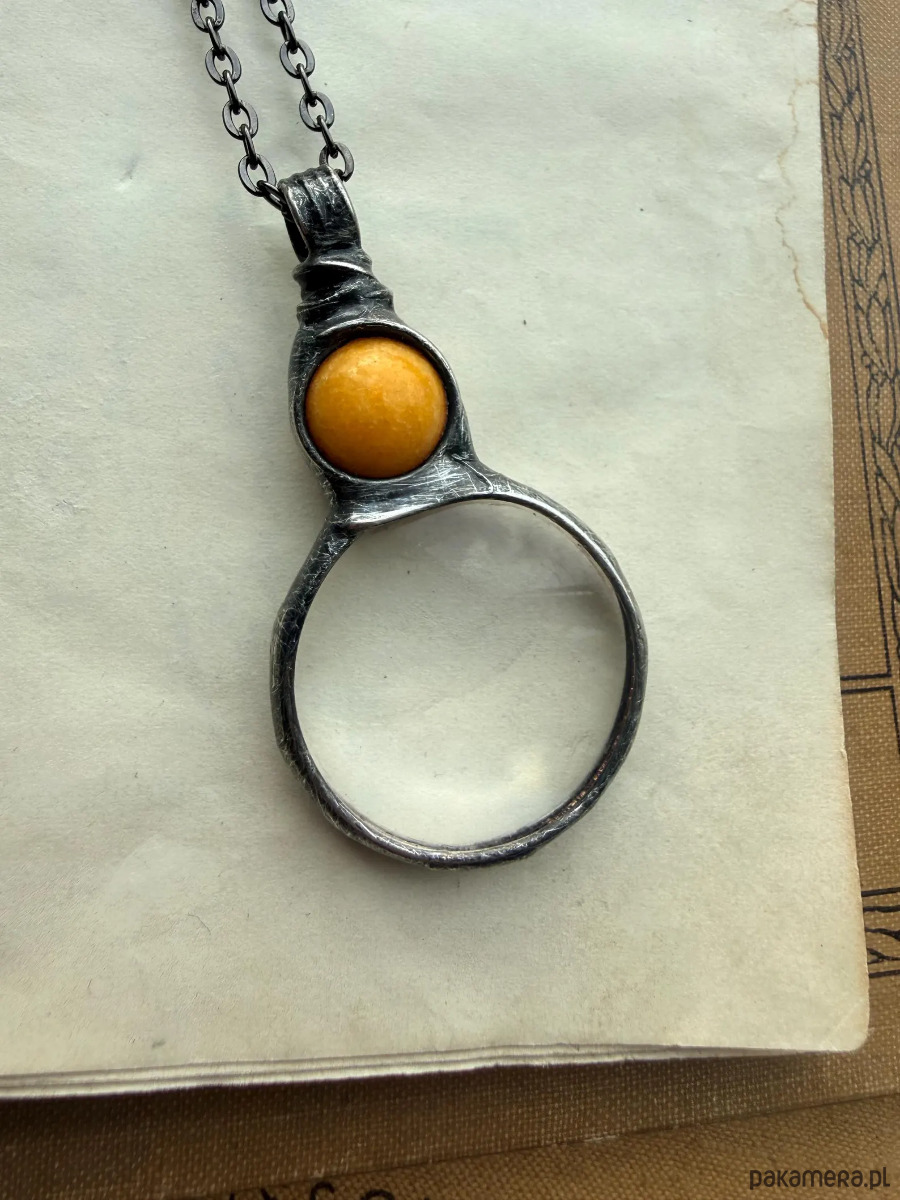 Ręcznie wykonany naszyjnik z lupą i naturalnym kamieniem nefrytu. Delikatny przedmiot, który łączy w sobie funkcję i spokojną formę biżuterii.