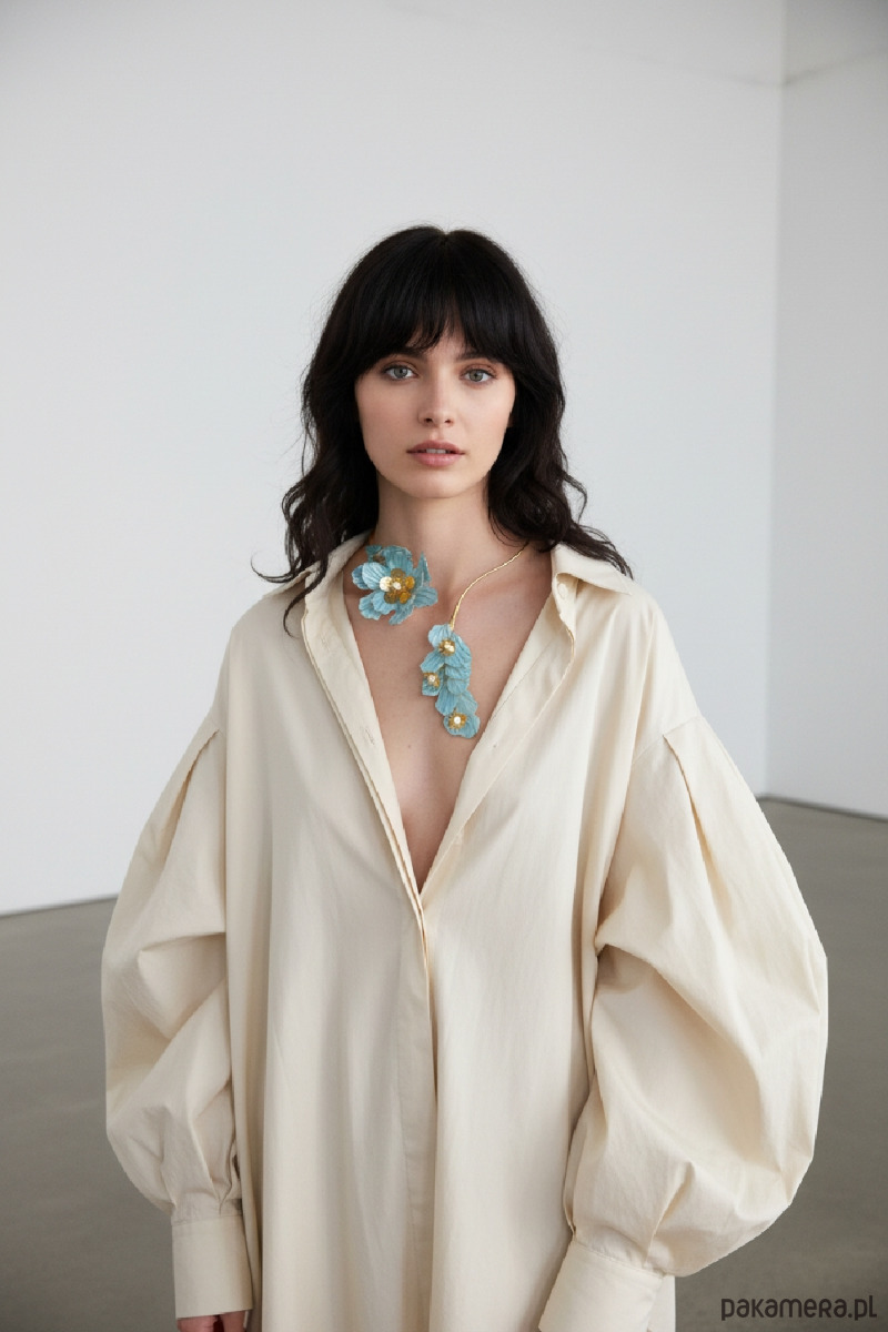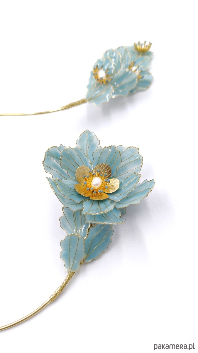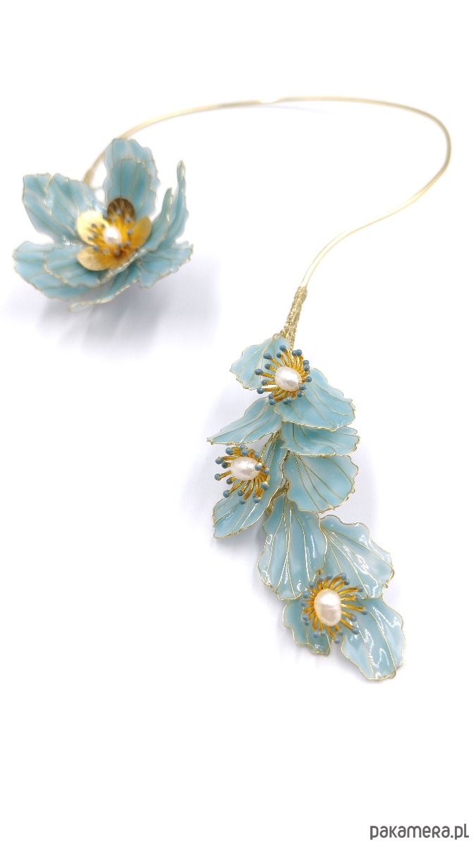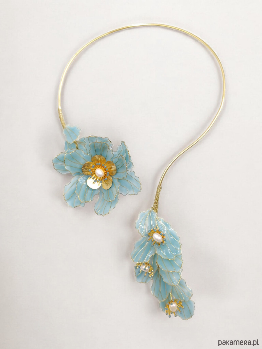 Ręcznie wykonany naszyjnik MAELI prezentuje kunsztowne kwiaty z drutu mosiężnego i żywicy w w kolorze jasnego Aubusson Blue zdobione złotymi akcentami i naturalnymi perłami. Smukła, metaliczna obręcz idealnie dopasowuje się do szyi, nadając całości lekkości. Niepowtarzalny dodatek, który podkreśli Twoją wyjątkowość i dopełni zarówno klasyczne, jak i nowoczesne stylizacje.