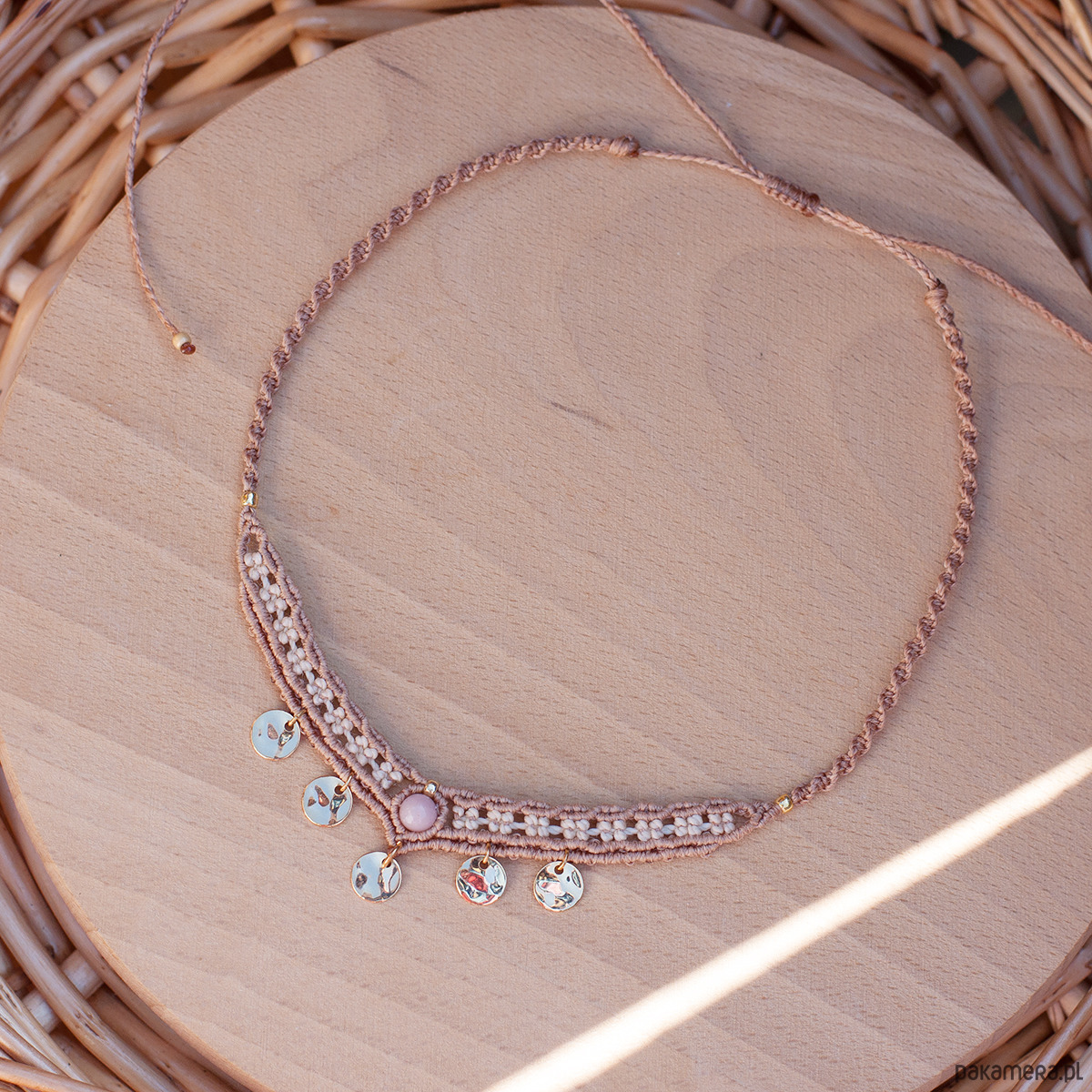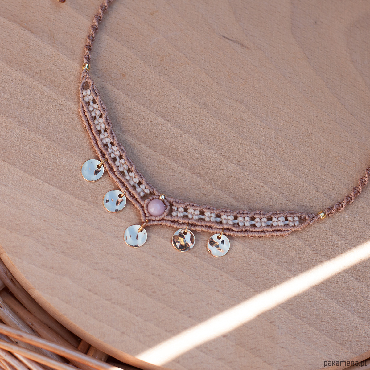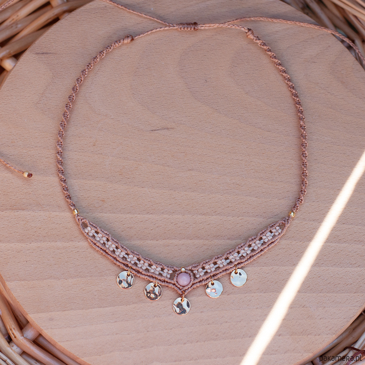 Pleciony naszyjnik stworzony metodą makramy. Kolia makramowa zdobiona zawieszkami z mosiądzu.