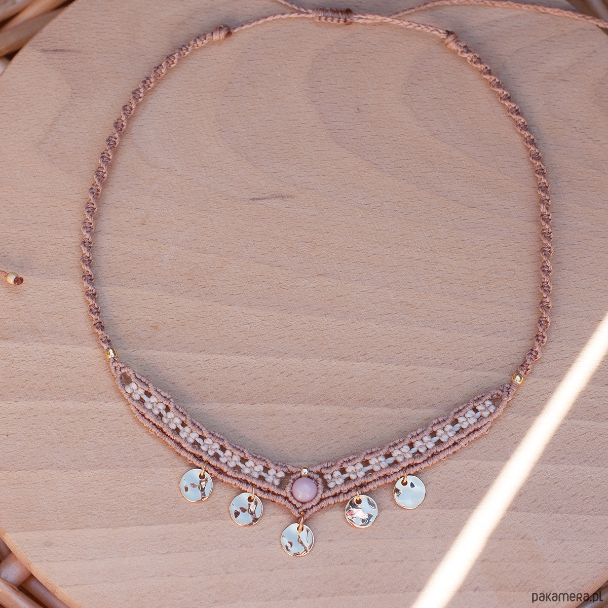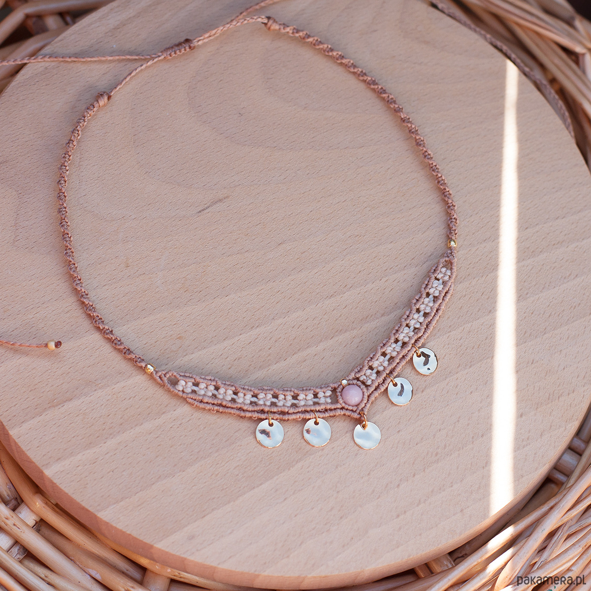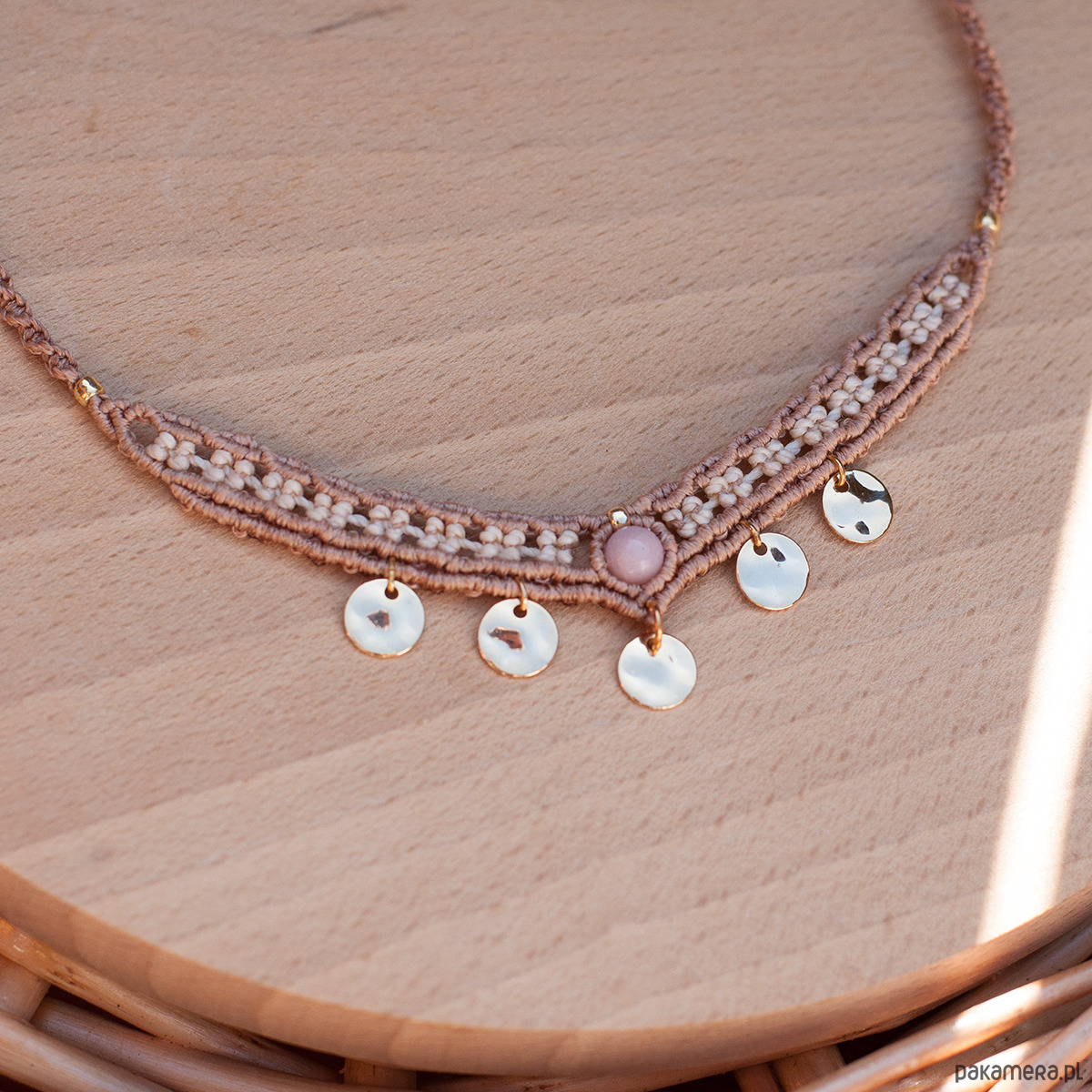 Pleciony naszyjnik stworzony metodą makramy. Kolia makramowa zdobiona zawieszkami z mosiądzu.