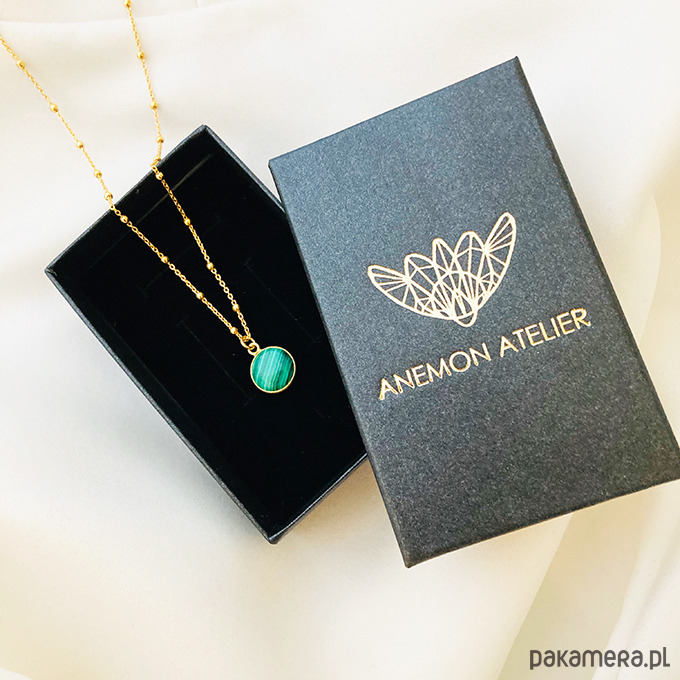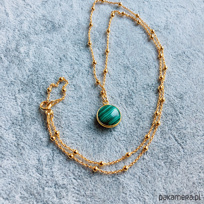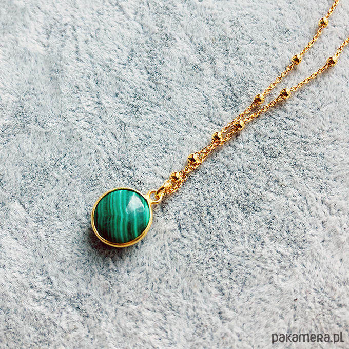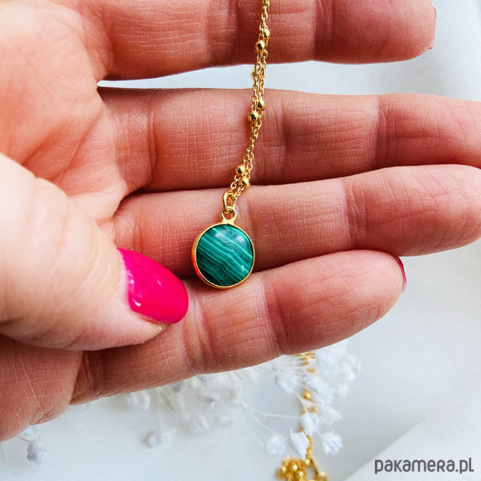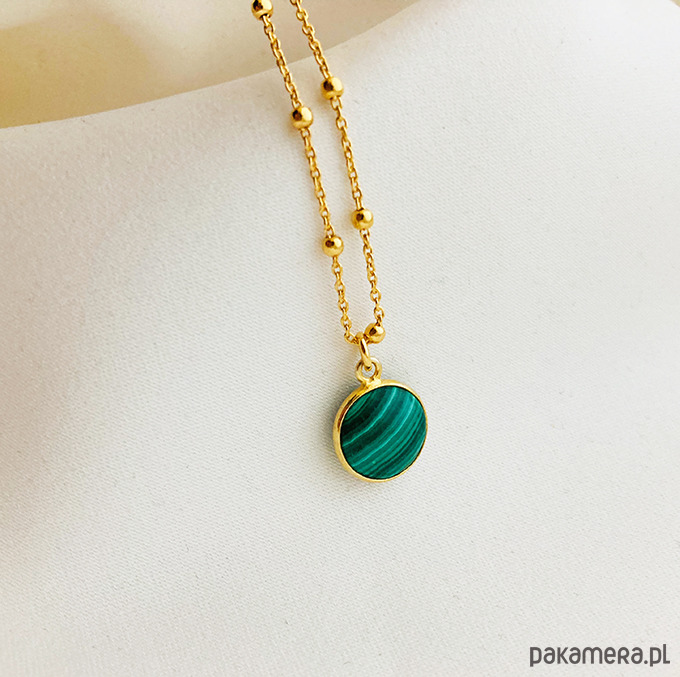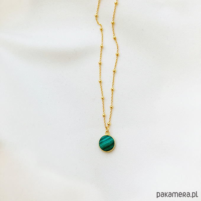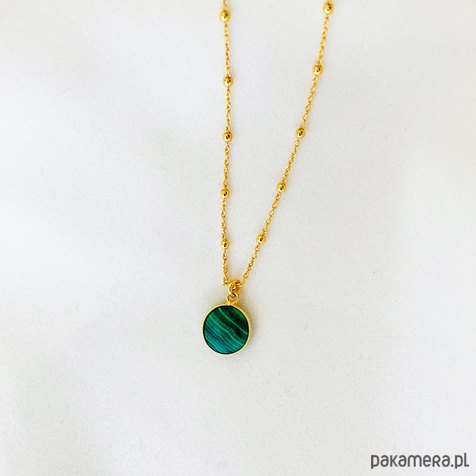 Delikatny naszyjnik z oprawionym zielonym malachitem zawieszonym na efektownym, kulkowym łańcuszku. Subtelny akcent w wyrazistej formie – idealny na co dzień i do eleganckich stylizacji.
