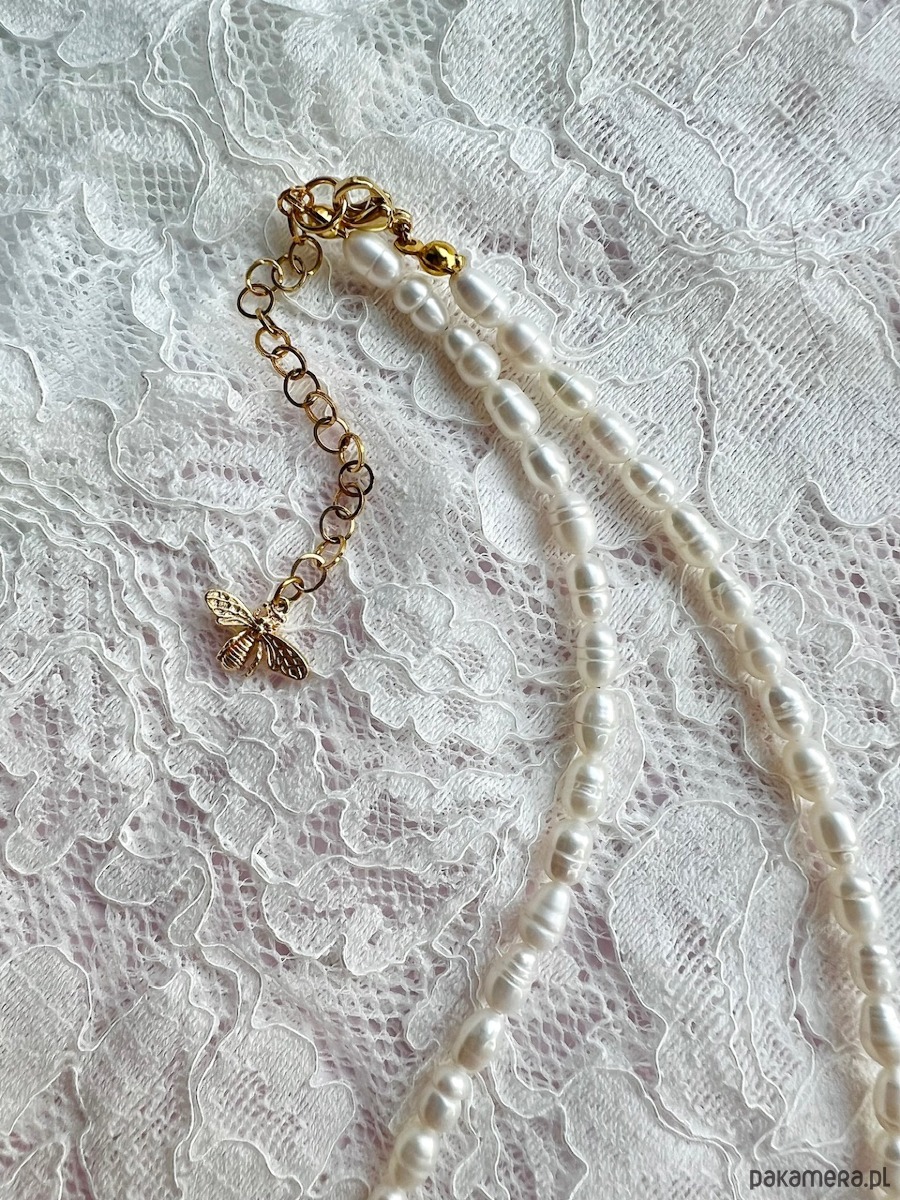 Białe perełki o nieregularnym kształcie dopełnione są niezwykłą, ręcznie wykonaną w polskiej pracowni szkła artystycznego malinką. Malinka jest bardzo realistyczna i pięknie odbija światło. Na końcu łańcuszka do regulacji zawieszona jest mała pszczółka ze złoconego mosiądzu.