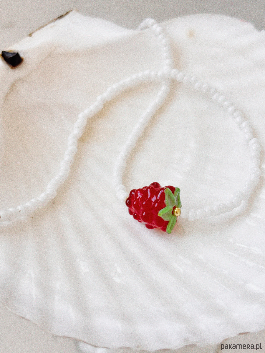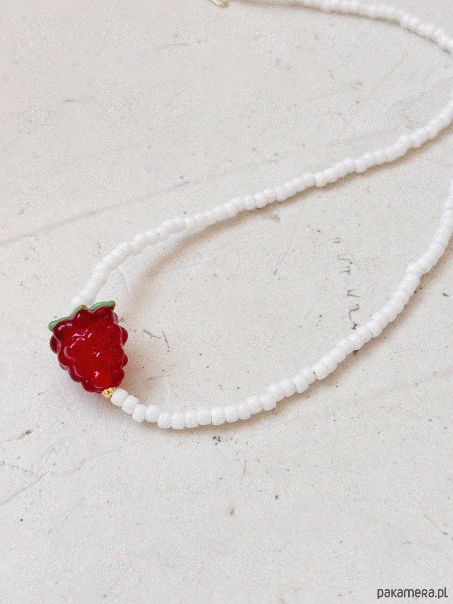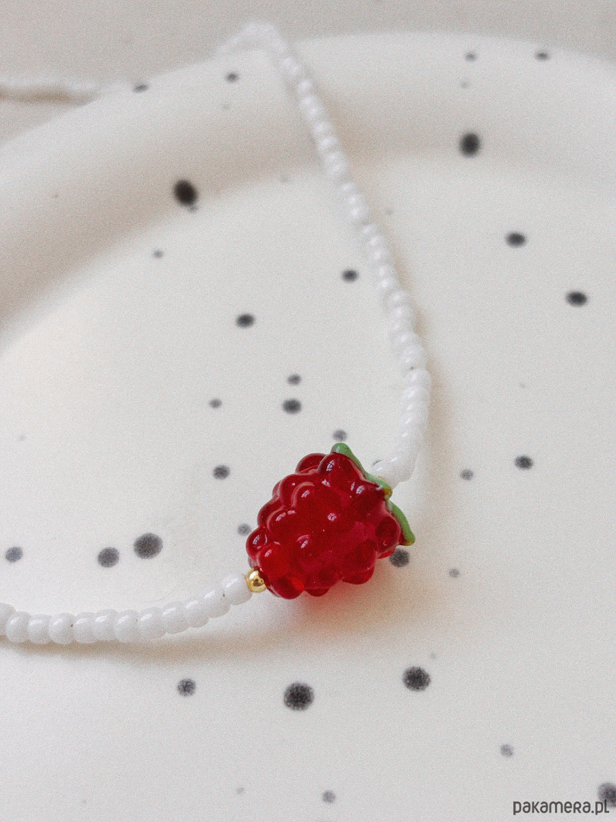 Naszyjnik wykonany jest na lince jubilerskiej z użyciem koralików toho, szklanej malinki i elementów ze st. chirurgicznej.