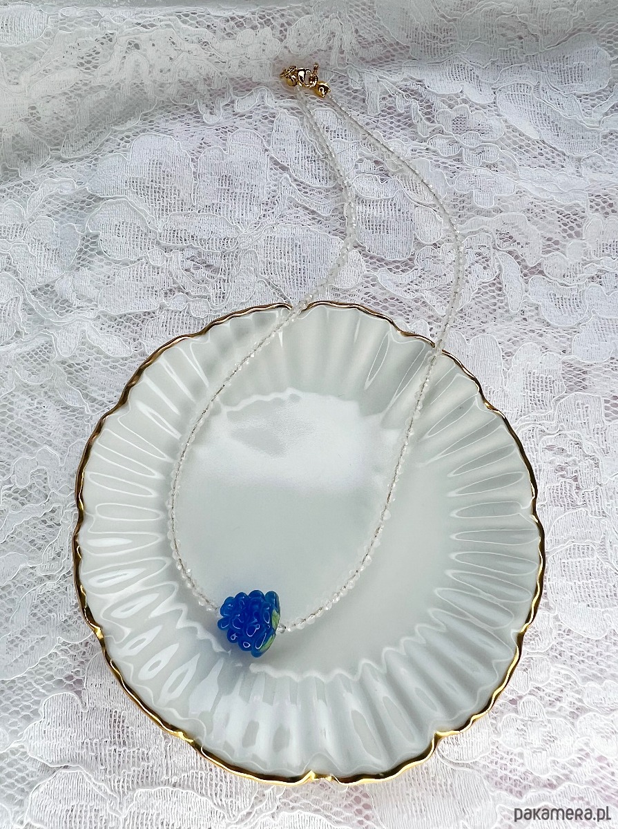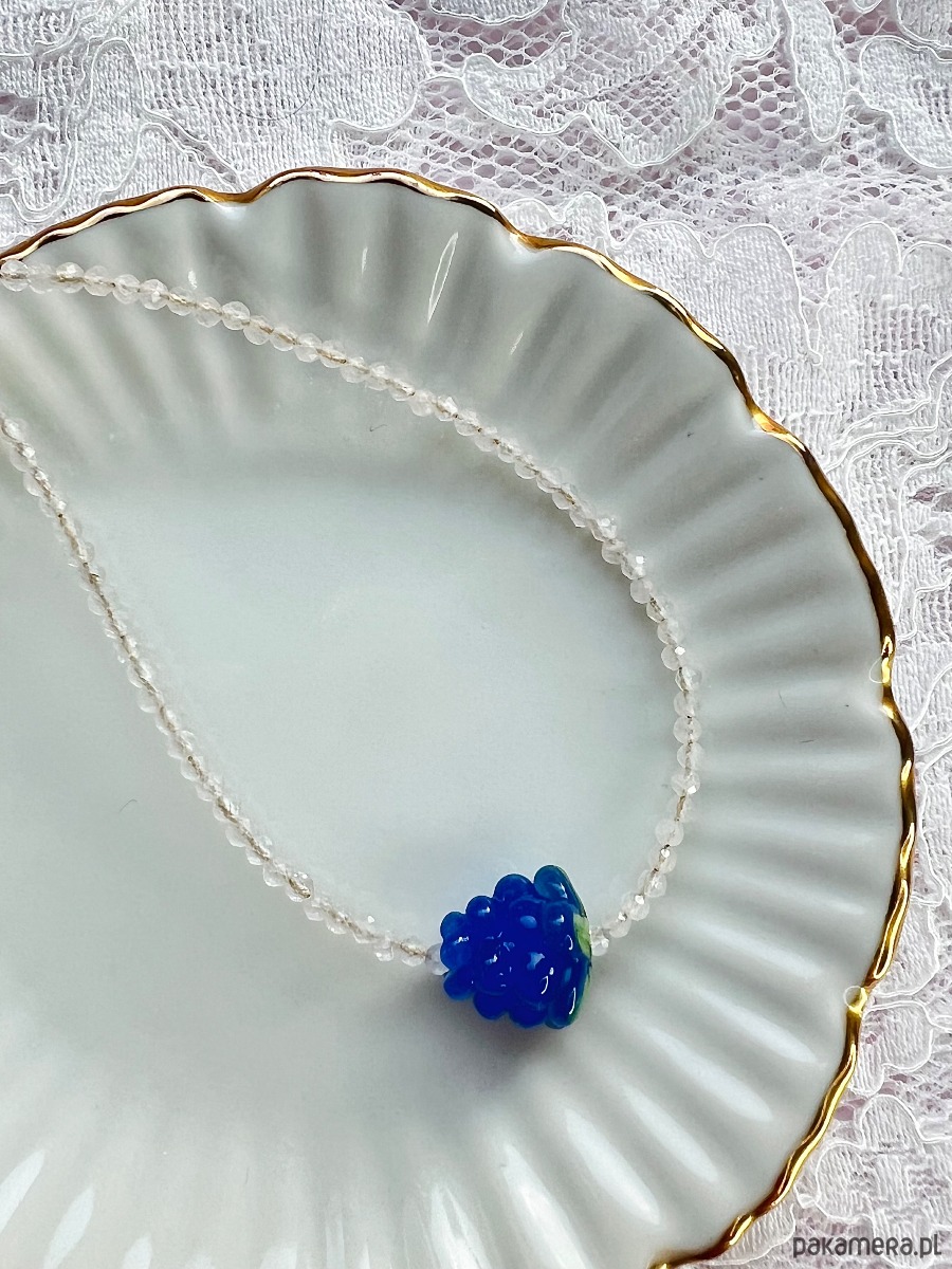 Wykonany jest z fasetowanych, drobniutkich koralików z białego, transparentnego jadeitu, a główną rolę gra tutaj piękna malinka w modnym niebieskim kolorze, wykonana ze szkła.