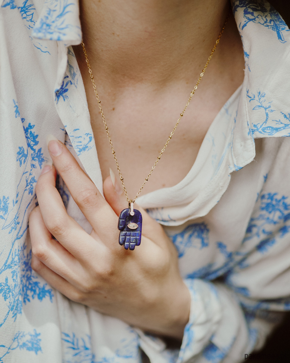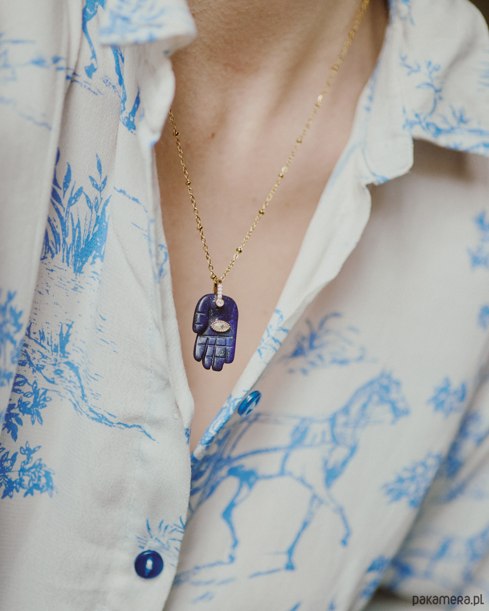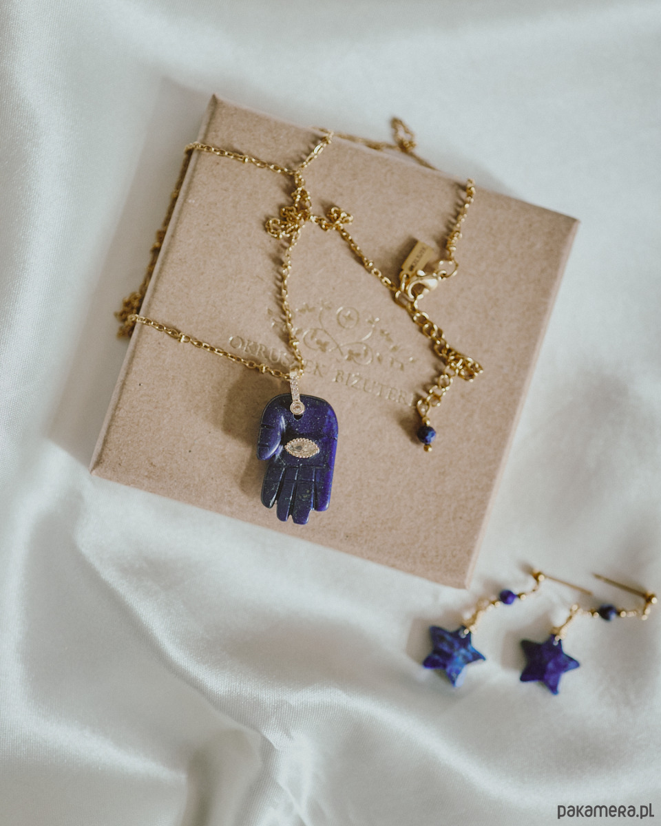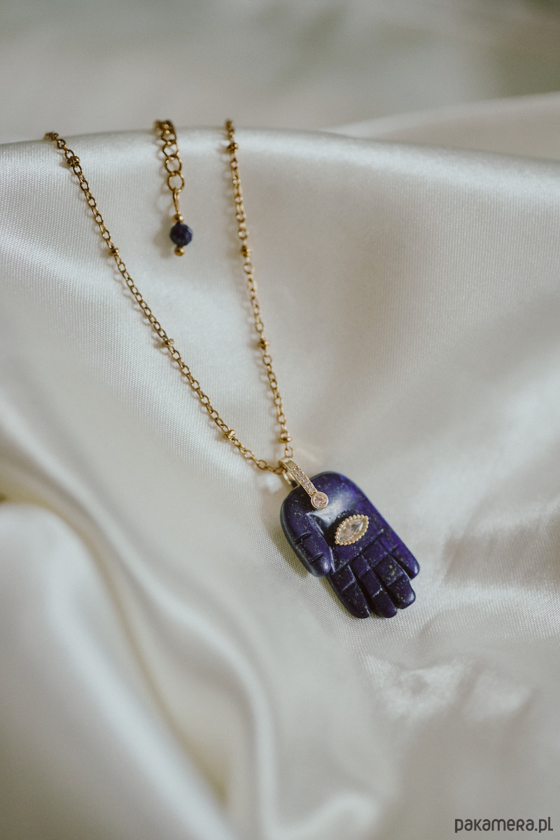 Długi naszyjnik z zawieszką z lapis lazuli w kształcie dłoni z oczkiem. Napełni użytkowniczkę pierwotną mocą 🧿