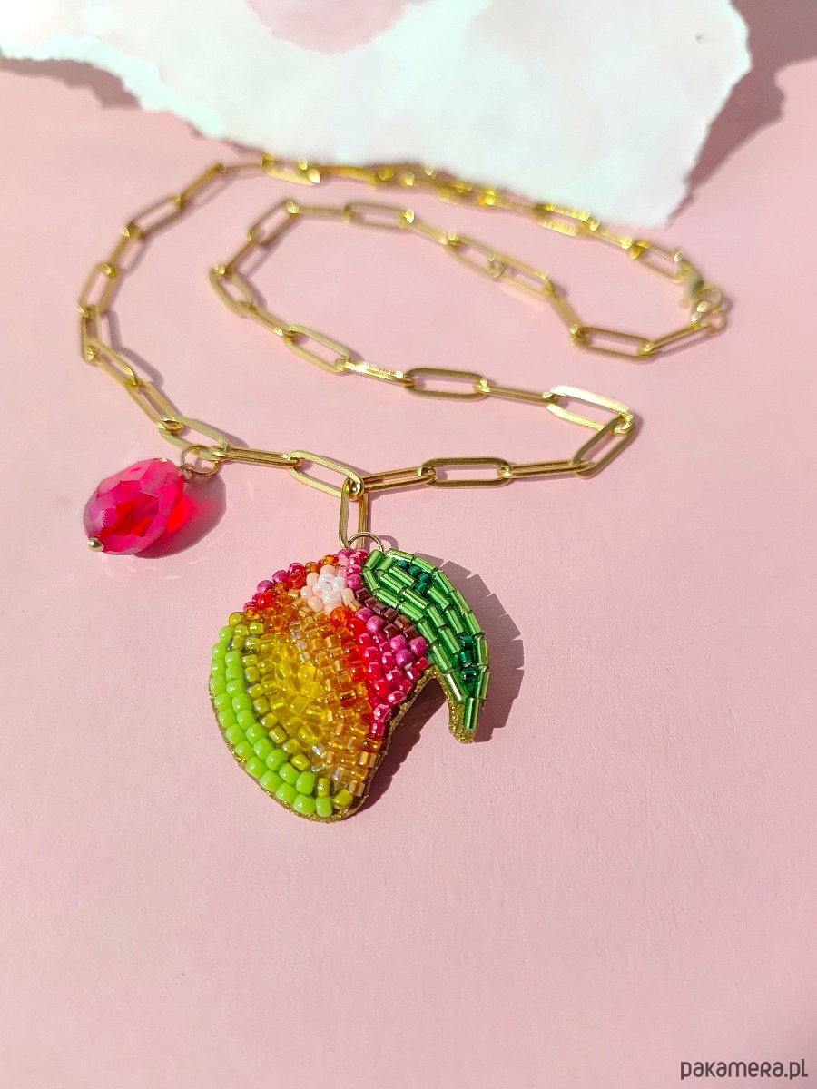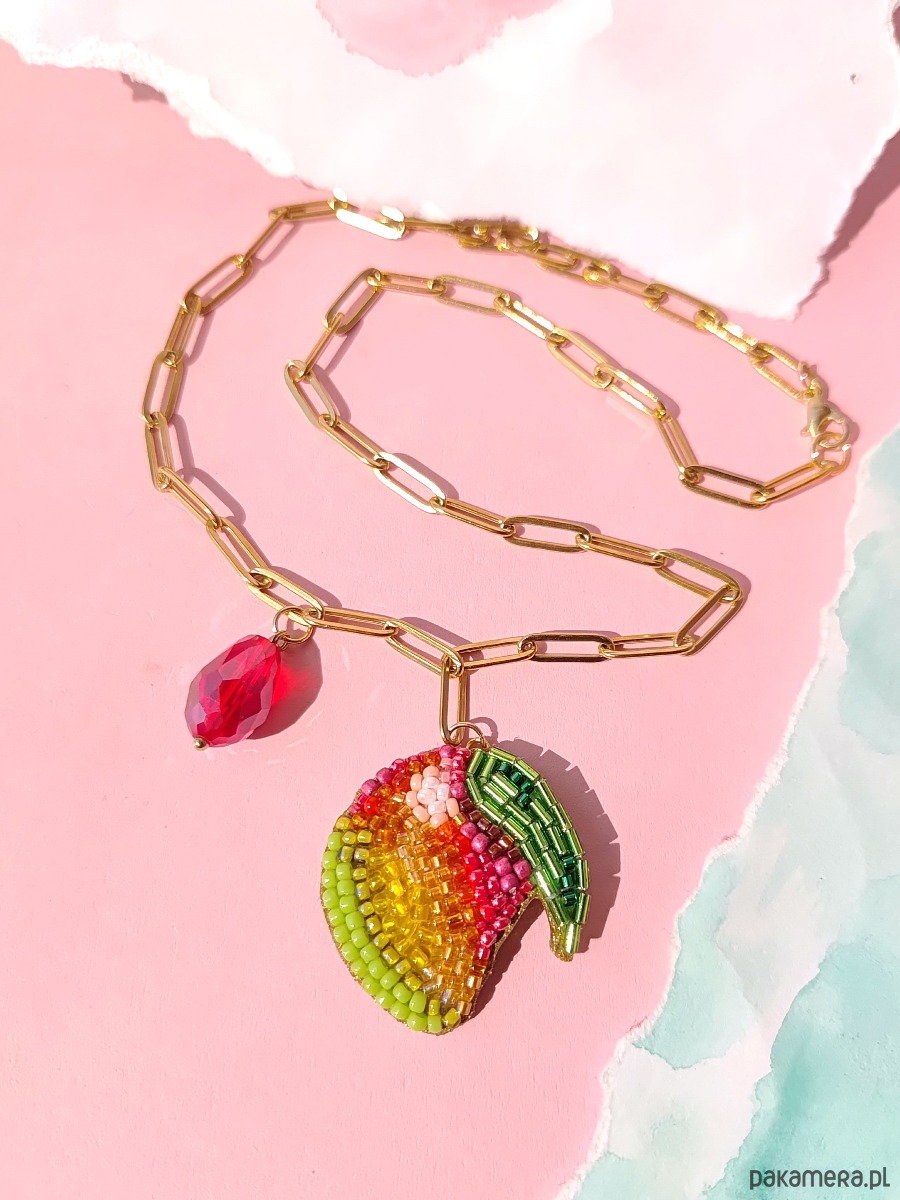 Kawałek tropików zawsze przy Tobie! Ten soczysty naszyjnik wygląda tak apetycznie, że aż chciałoby się go zjeść (ale lepiej nie 😉). Ręcznie wyszywany wisiorek z kolorowych szklanych koralików przypomina słodkie, dojrzałe mango – w odcieniach żółci, różu i zieleni.