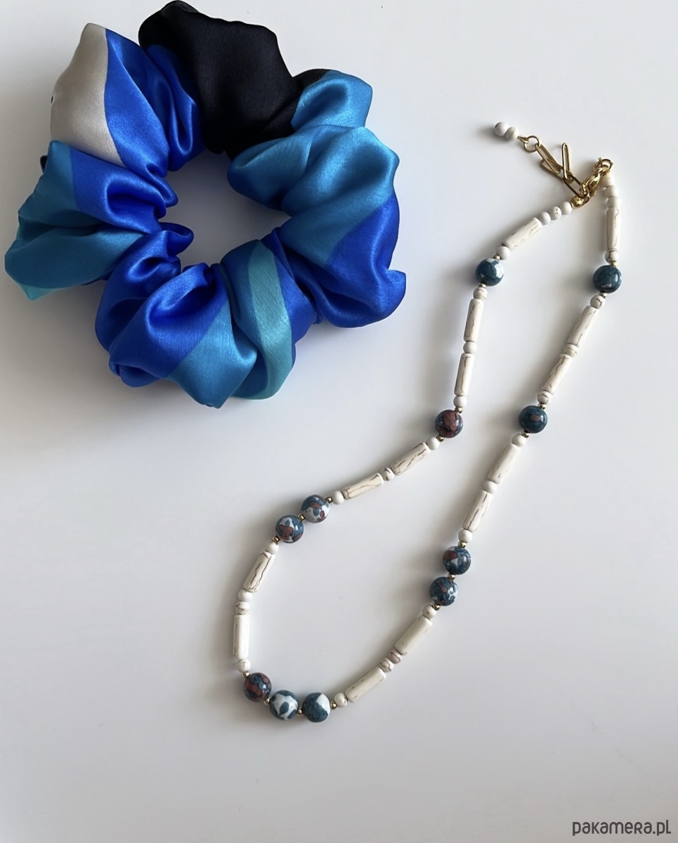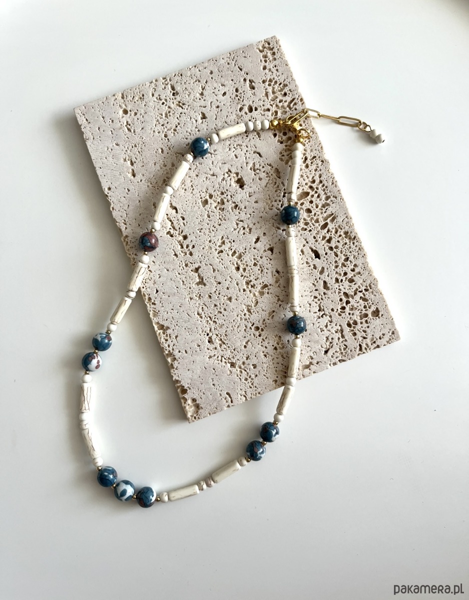 Delikatny, ręcznie wykonany naszyjnik z howlitu w dwóch odsłonach: Jasny howlit ecru o subtelnych, beżowo-brązowych żyłkach wprowadza harmonię i spokój, stanowiąc doskonałą bazę kompozycji. Howlit w odcieniach niebieskiego i granatu z nutą rdzawego brązu i bieli dodaje wyrazistości i głębi. Każda kulka ma unikatowy wzór.