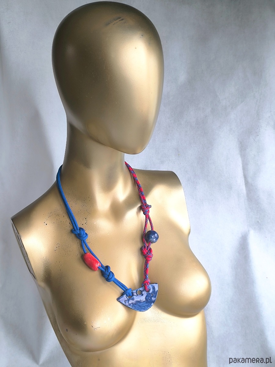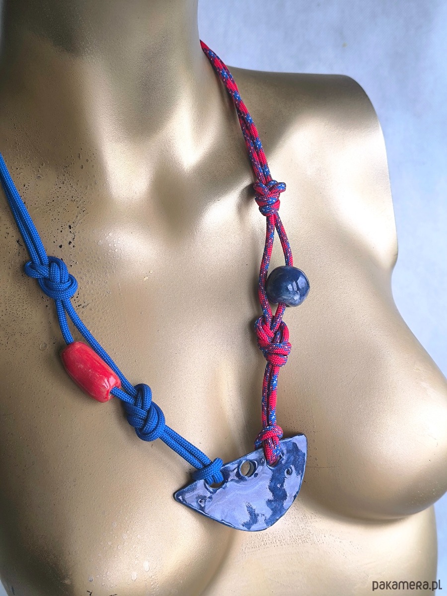 Ceramiczna zawieszka wykonana przeze mnie w zaprzyjaznionym studiu ceramicznym. Zawieszona na linkach paracord w kolorze granatowym i czerwono granatowym. Wykończenie stał szlachetna.