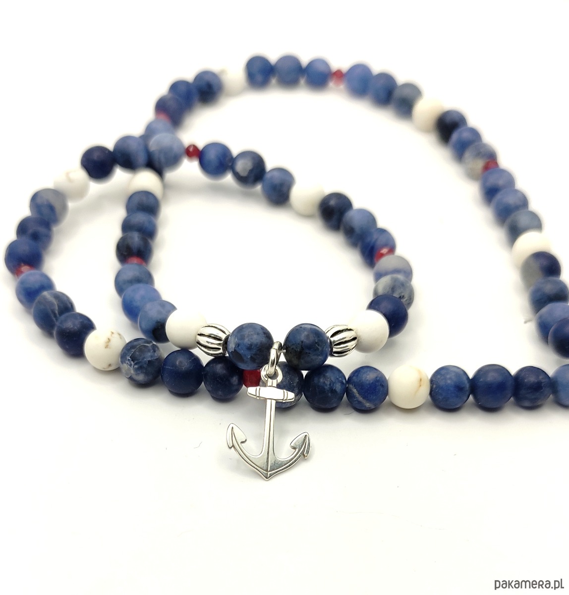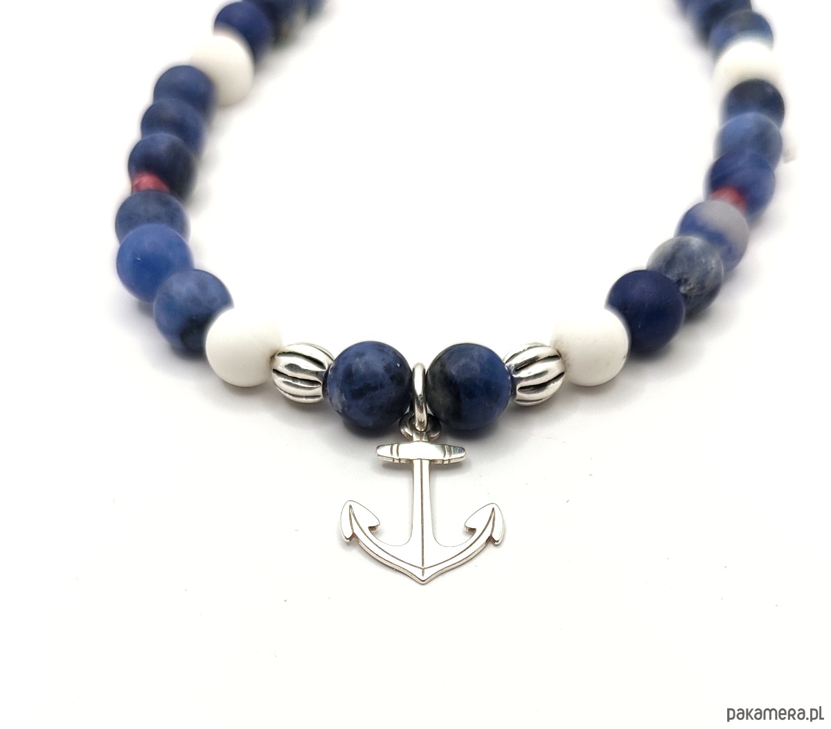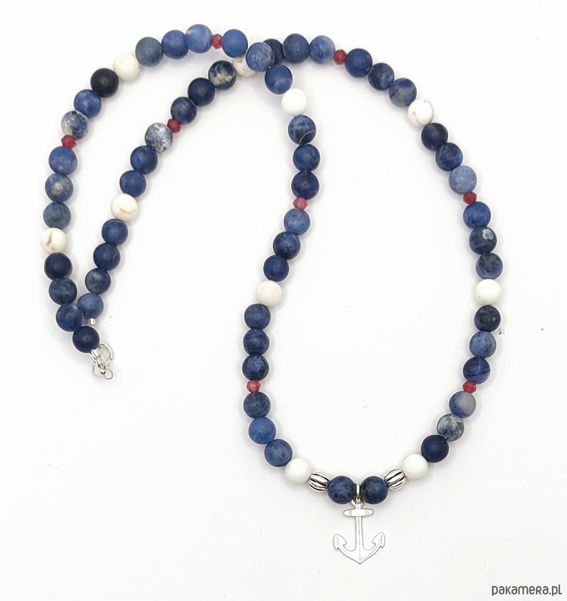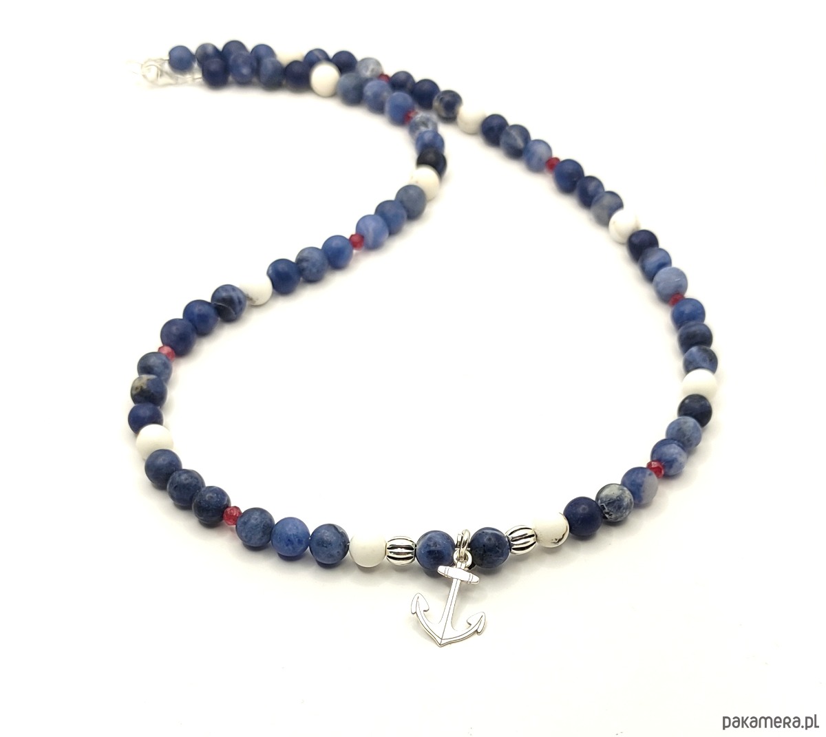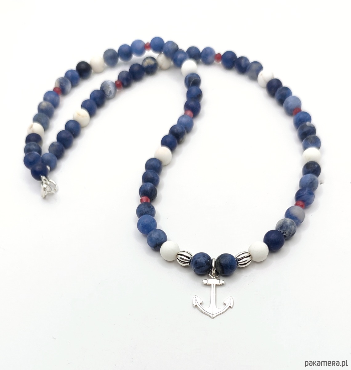Naszyjnik męski pod szyję w marynistycznych kolorach, wykonany z naturalnych kamieni sodalitu, howlitu oraz jadeitu. W morskiej tonacji. Użyte w kompozycji kamienie są matowe, surowe, kojarzące się z wygładzoną przez wiatr skałą. Naszyjnik został wykończony srebrnymi dodatkami, w tym precyzyjnie ciętą kotwicą, dla tych, którzy kiedyś chcą dobić do jakiejś przystani... ⚓