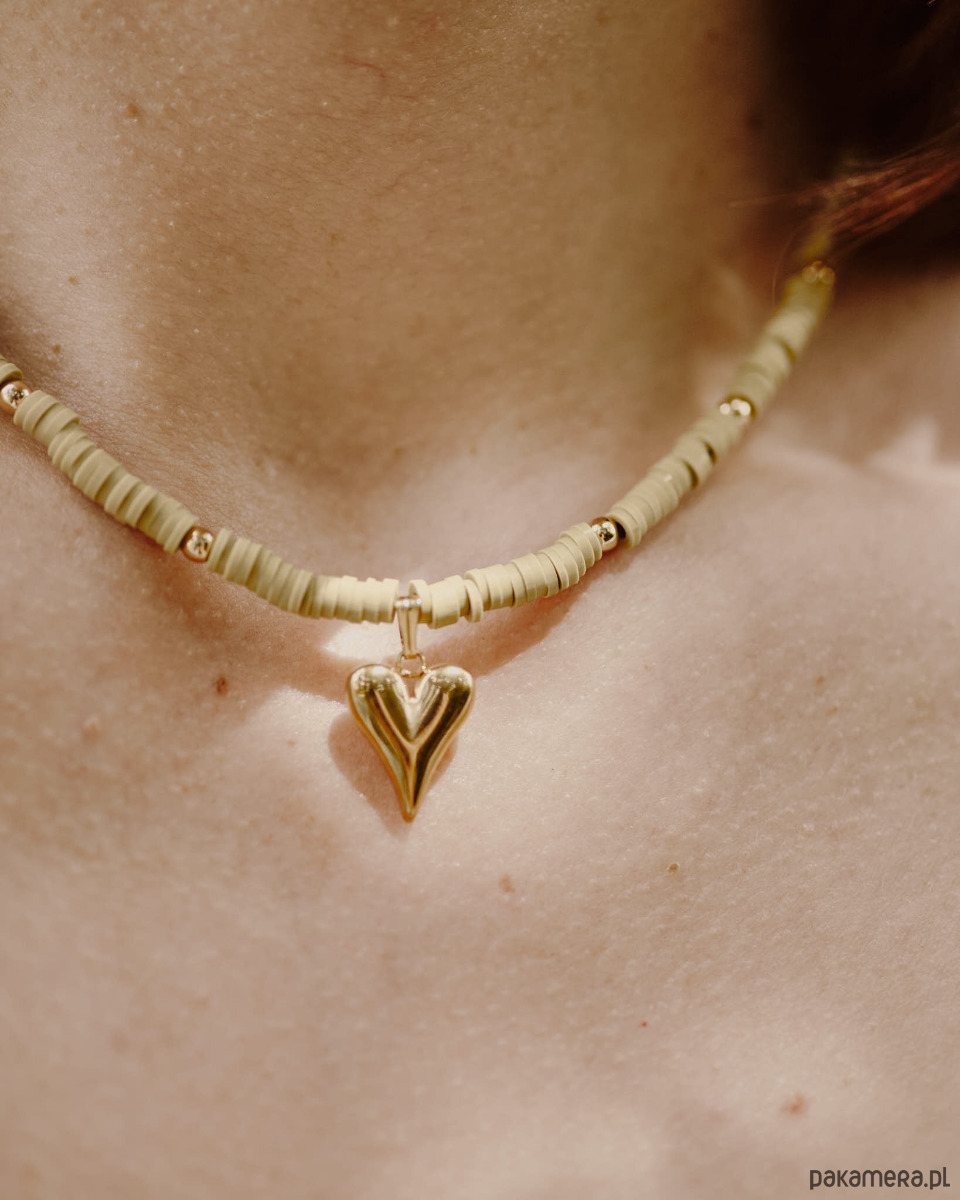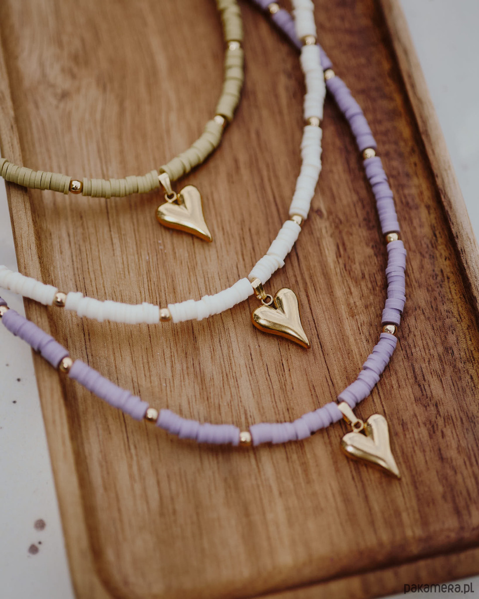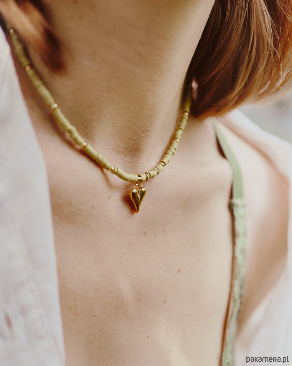 Wykonany jest z koralików katsuki w kolorze jasnej zieleni, przełożonych kulkami hematytu. Wykończony jest eleganckim sercem zwieszonym na krawatce.