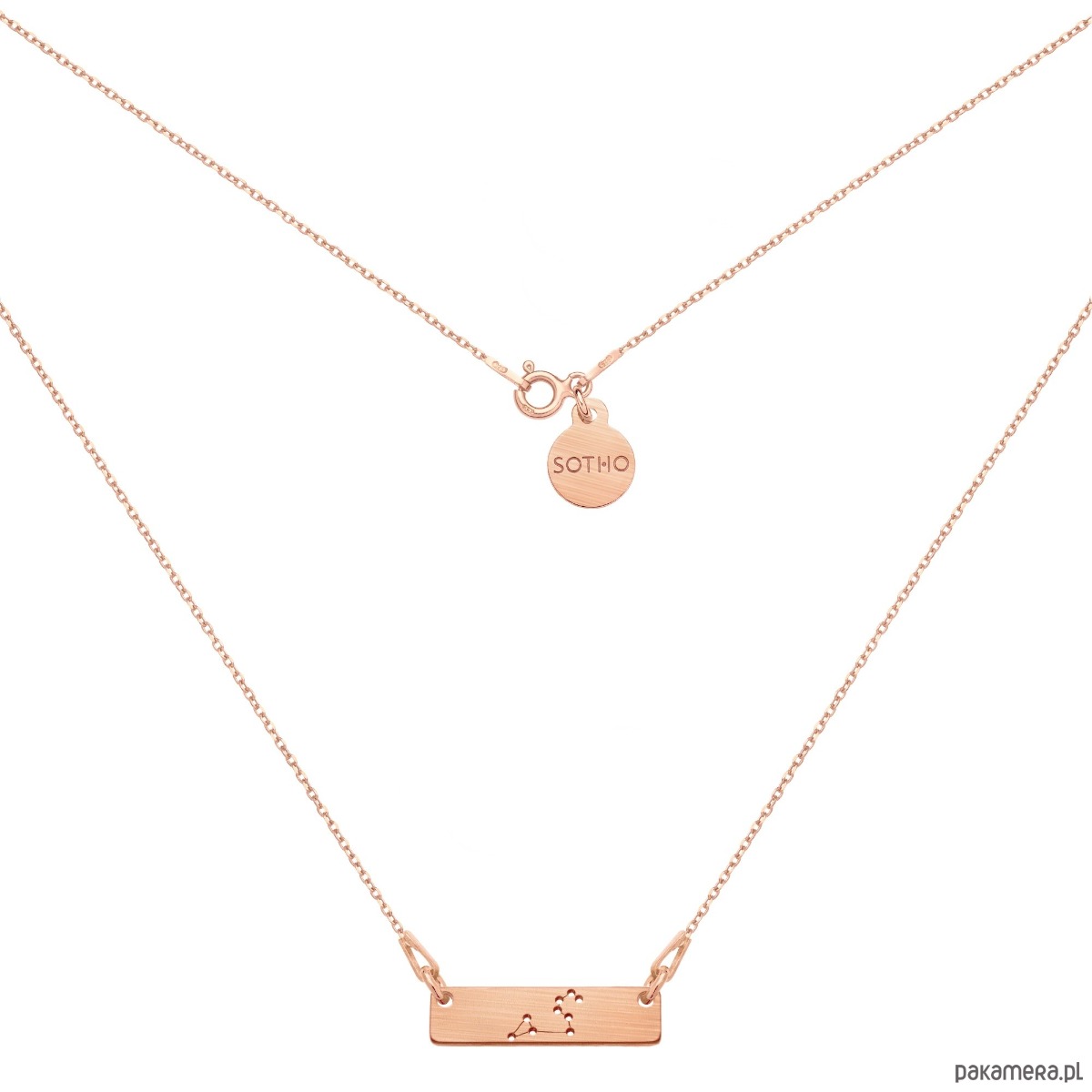 Złoty matowy naszyjnik łańcuszkowy zdobiony konstelacją zodiakalną Lwa i zawieszką z logo marki. Całość wykonana ze srebra 925 powlekanego 18 karatowym różowym złotem.
