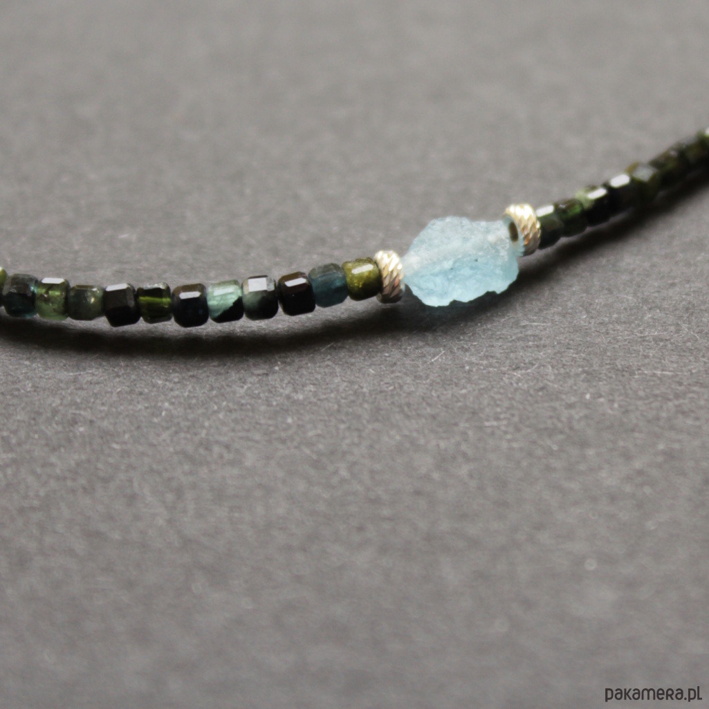Unikatowy naszyjnik zostały wykonany z kosteczek niebieskiego i zielonego turmalinu wielkości 0,4 cm, fasetowanego spinelu wielkości 0,25 cm oraz błękitnych akwamarynów wielkości 0,6 cm.