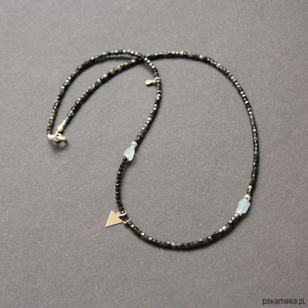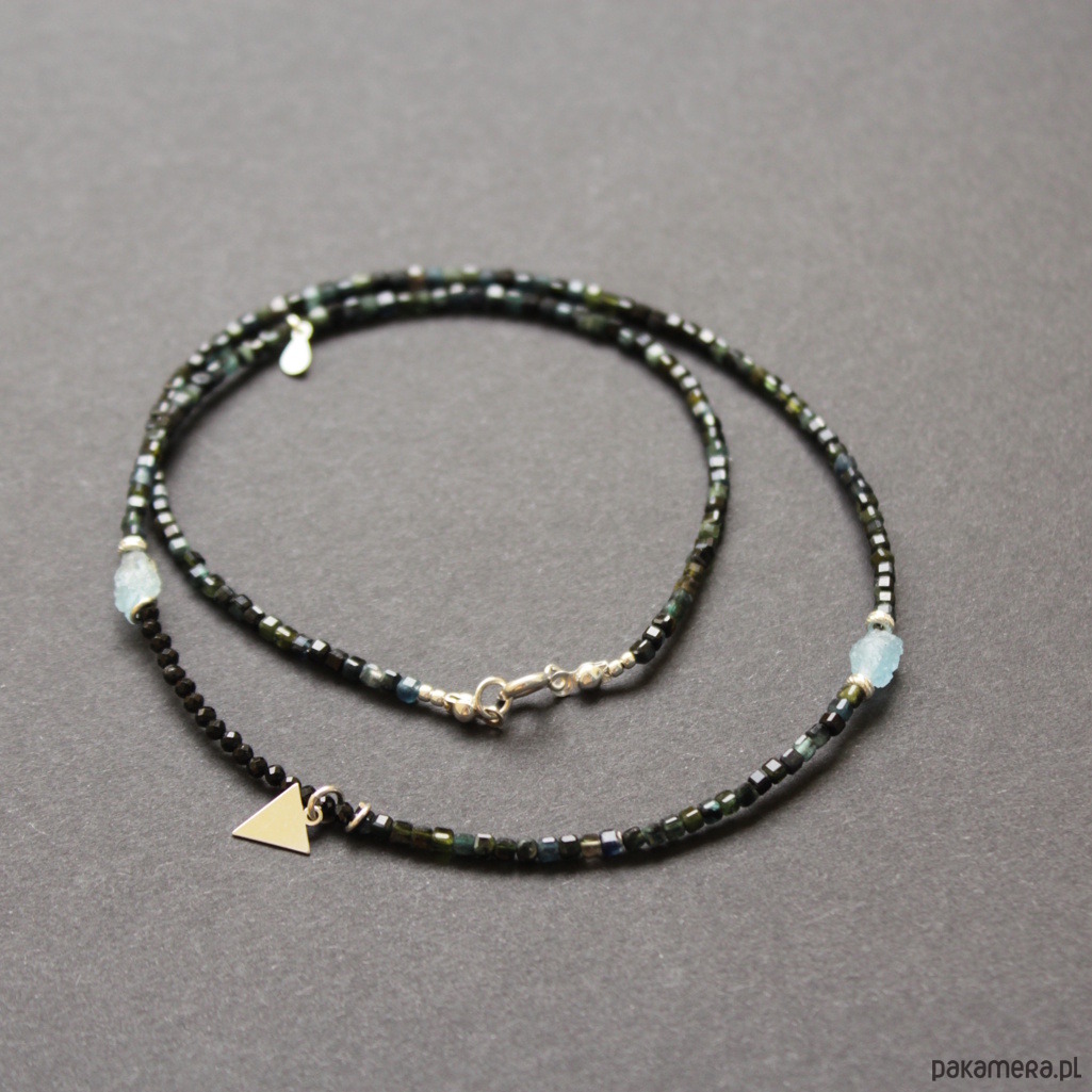 Unikatowy naszyjnik zostały wykonany z kosteczek niebieskiego i zielonego turmalinu wielkości 0,4 cm, fasetowanego spinelu wielkości 0,25 cm oraz błękitnych akwamarynów wielkości 0,6 cm.