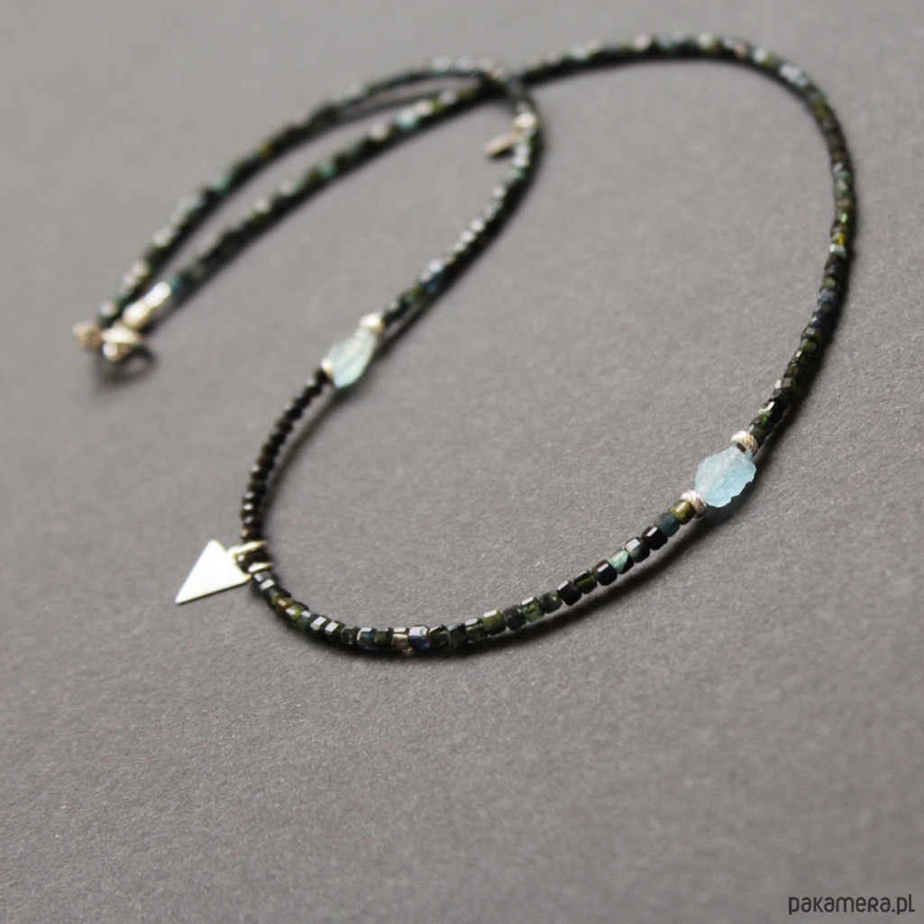 Unikatowy naszyjnik zostały wykonany z kosteczek niebieskiego i zielonego turmalinu wielkości 0,4 cm, fasetowanego spinelu wielkości 0,25 cm oraz błękitnych akwamarynów wielkości 0,6 cm.
