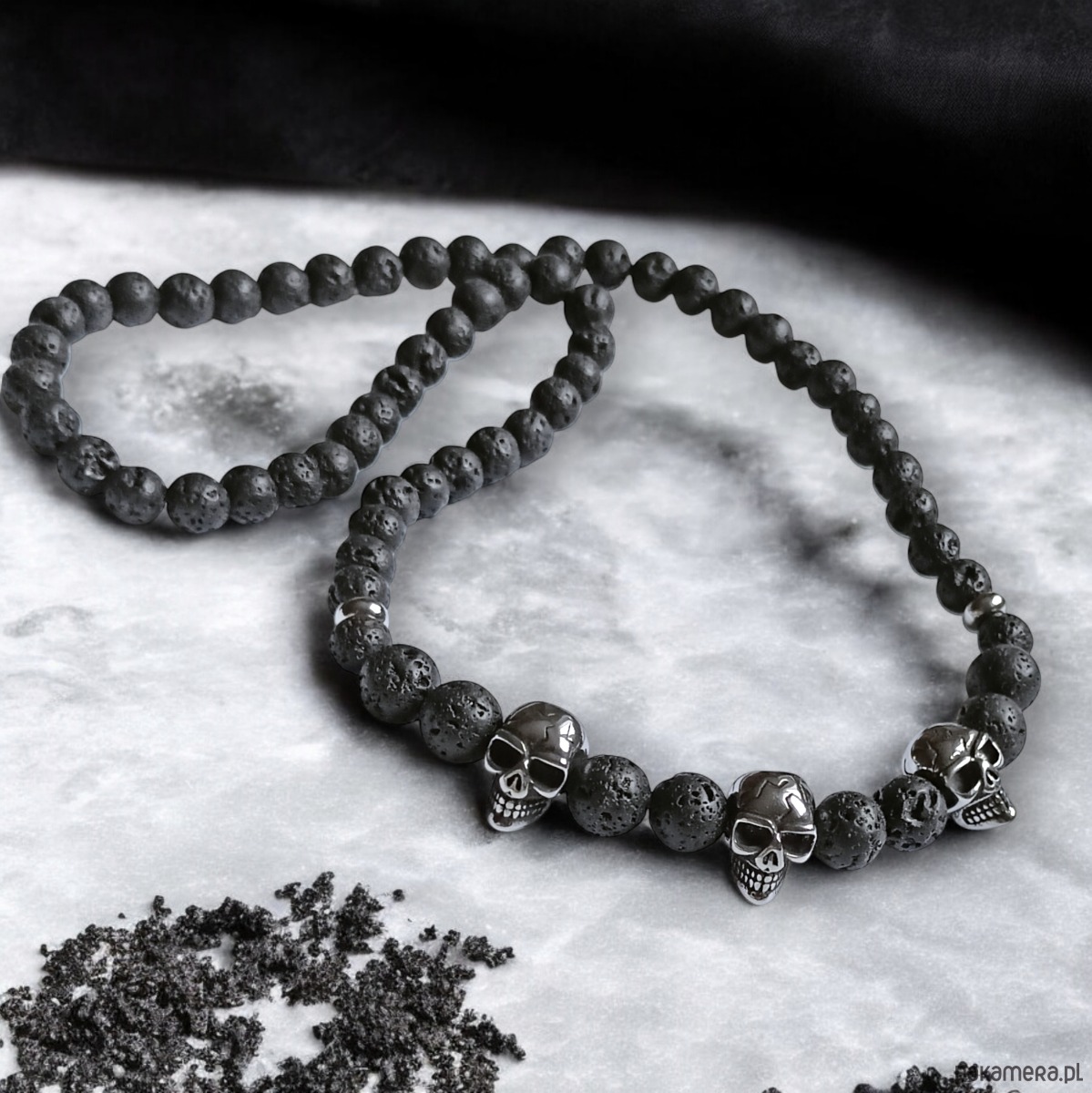...lawa wulkaniczna czarna 6mm z dodatkiem kul 8mm oraz 3 przestrzennych, oksydowanych czach i pierścieni - elementy metalowe wykonane ze stali szlachetnej (nie uczula, kolor się nie ściera) ...