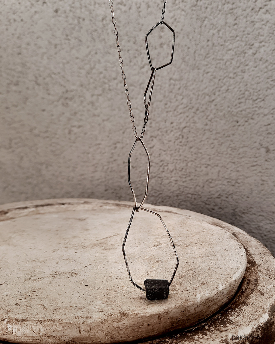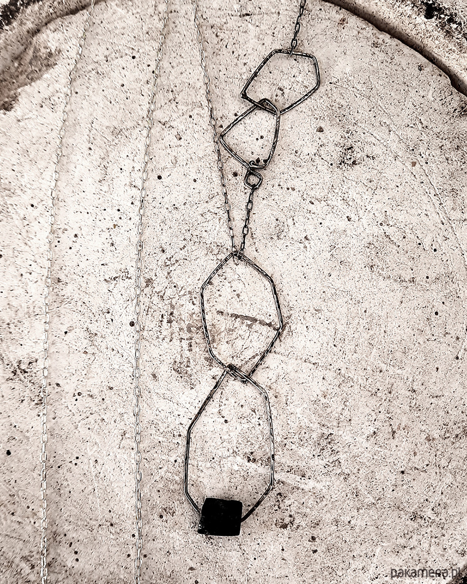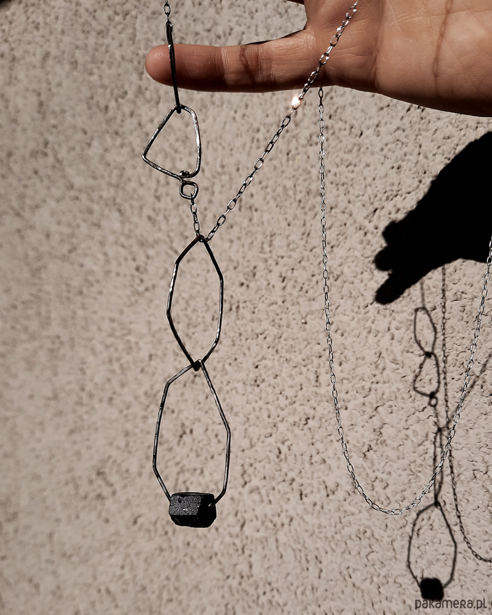 Nowoczesna, geometryczna forma naszyjnika przyciąga nietypowym kształtem i surowością.