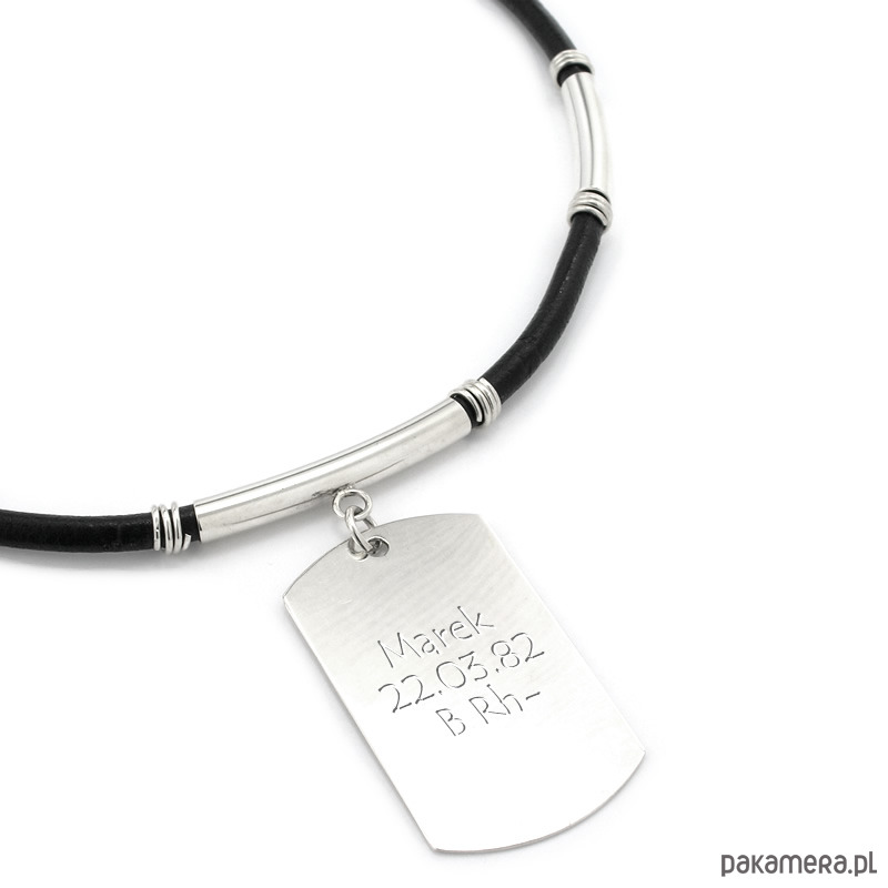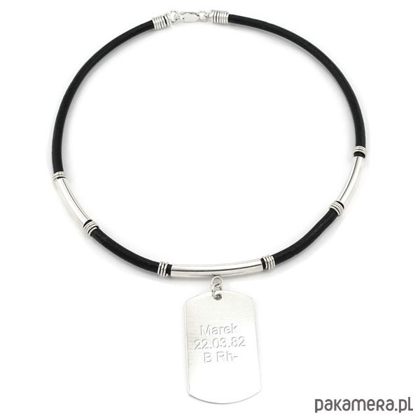 Naszyjnik wykonany z czarnego, skórzanego rzemienia o grubości 4 mm i zdobiony oryginalnymi wstawkami ze srebra. Do naszyjnika doczepiony jest srebrny nieśmiertelnik, srebrna blaszka przygotowana do wygrawerowania np. imienia, grupy krwi lub daty.