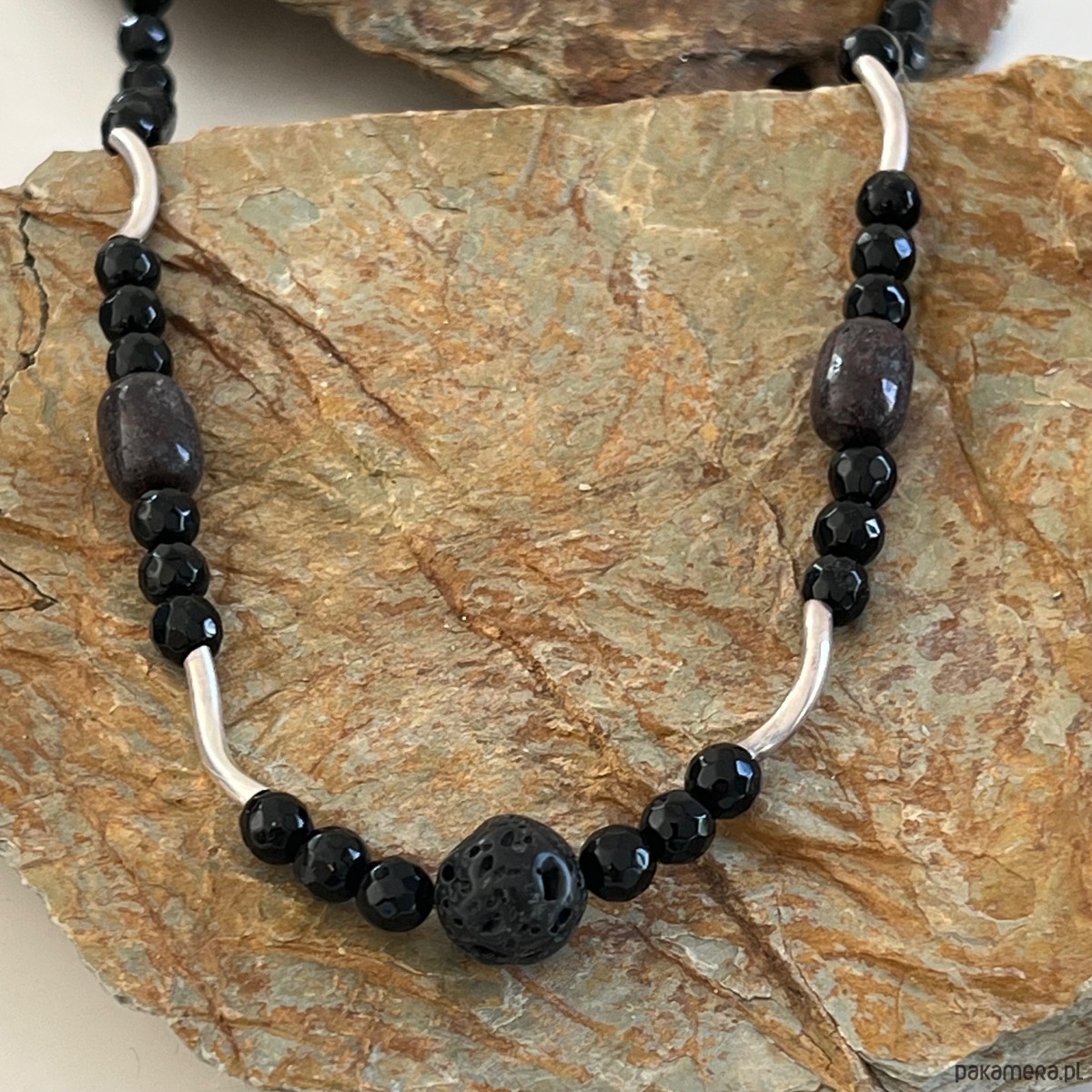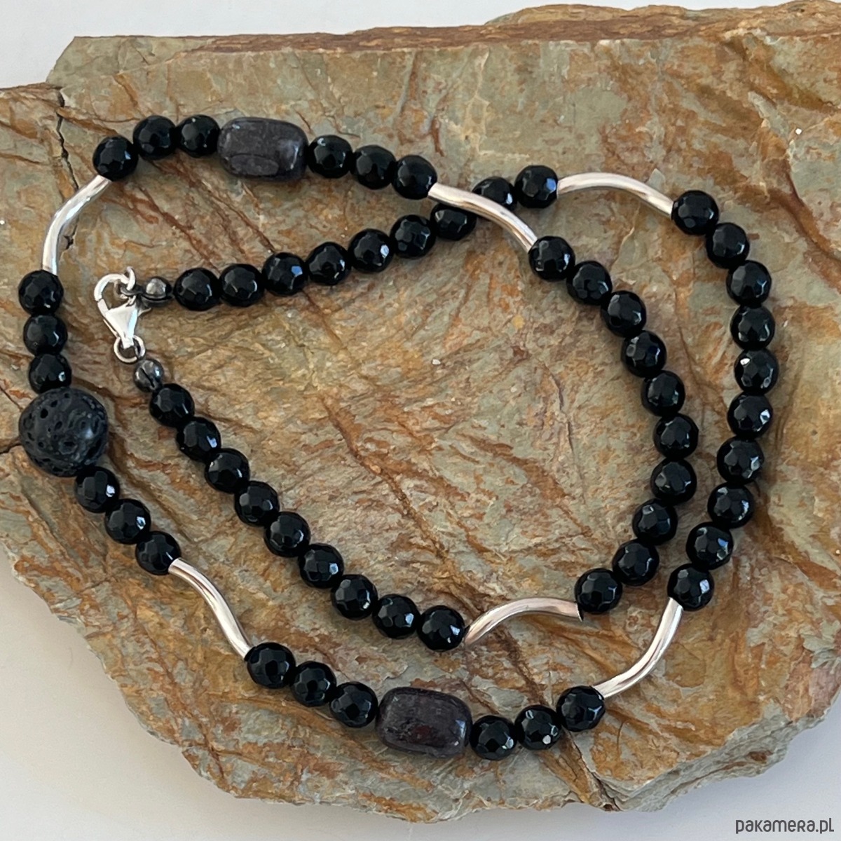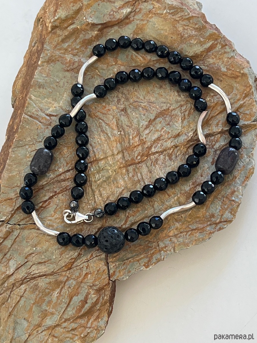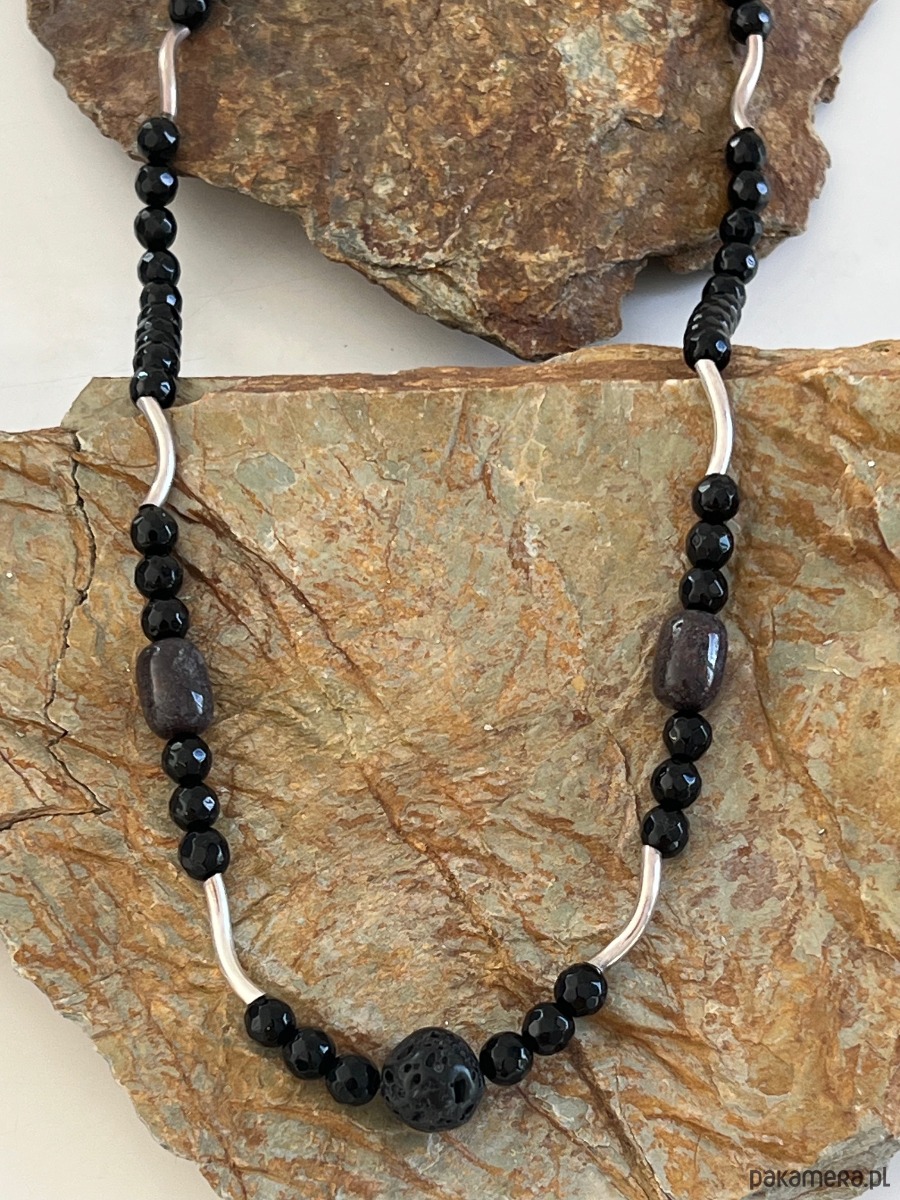 Naszyjnik męski z elementami srebrnymi, onyksów, lawą wulkaniczną i jadeitami.