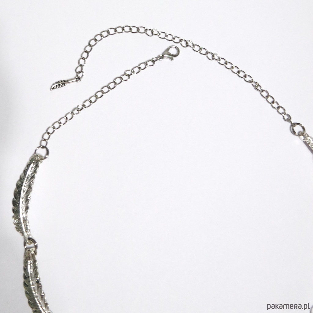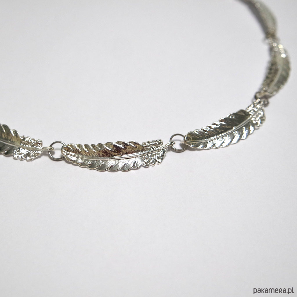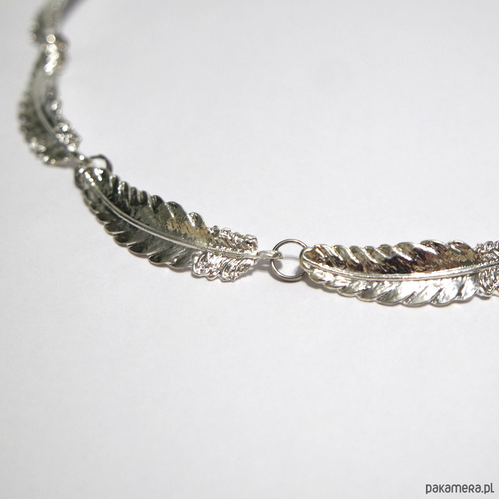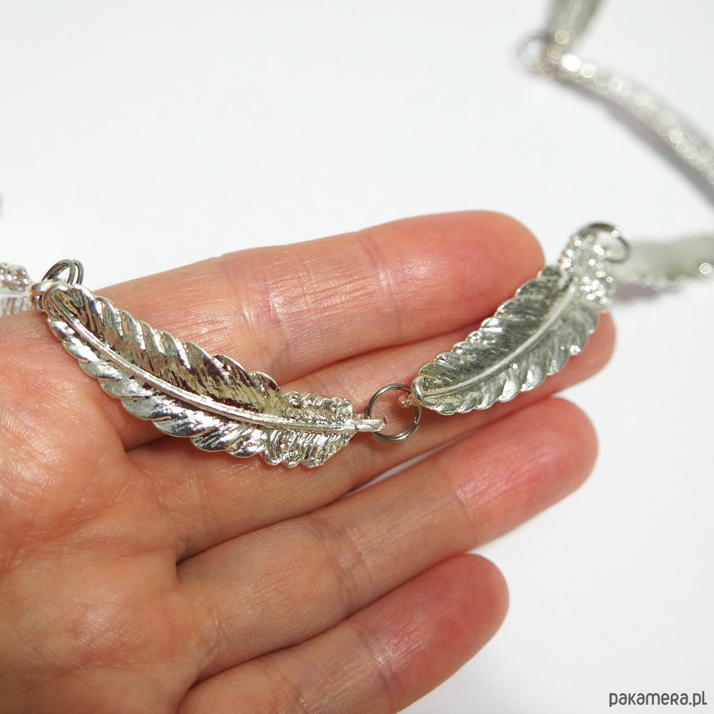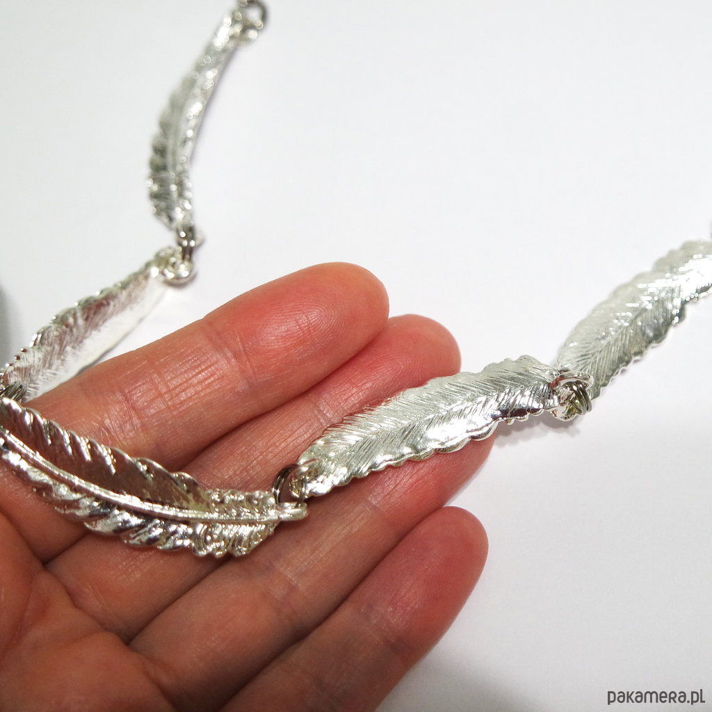 Naszyjnik zrobiony jest z metalowych piórek i łańcuszka.
