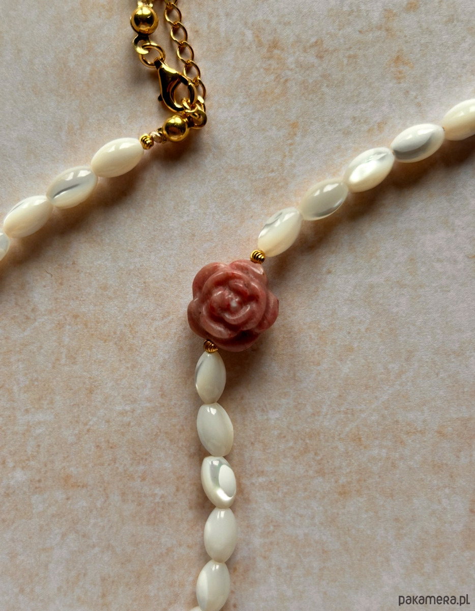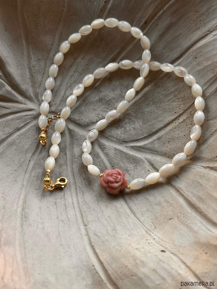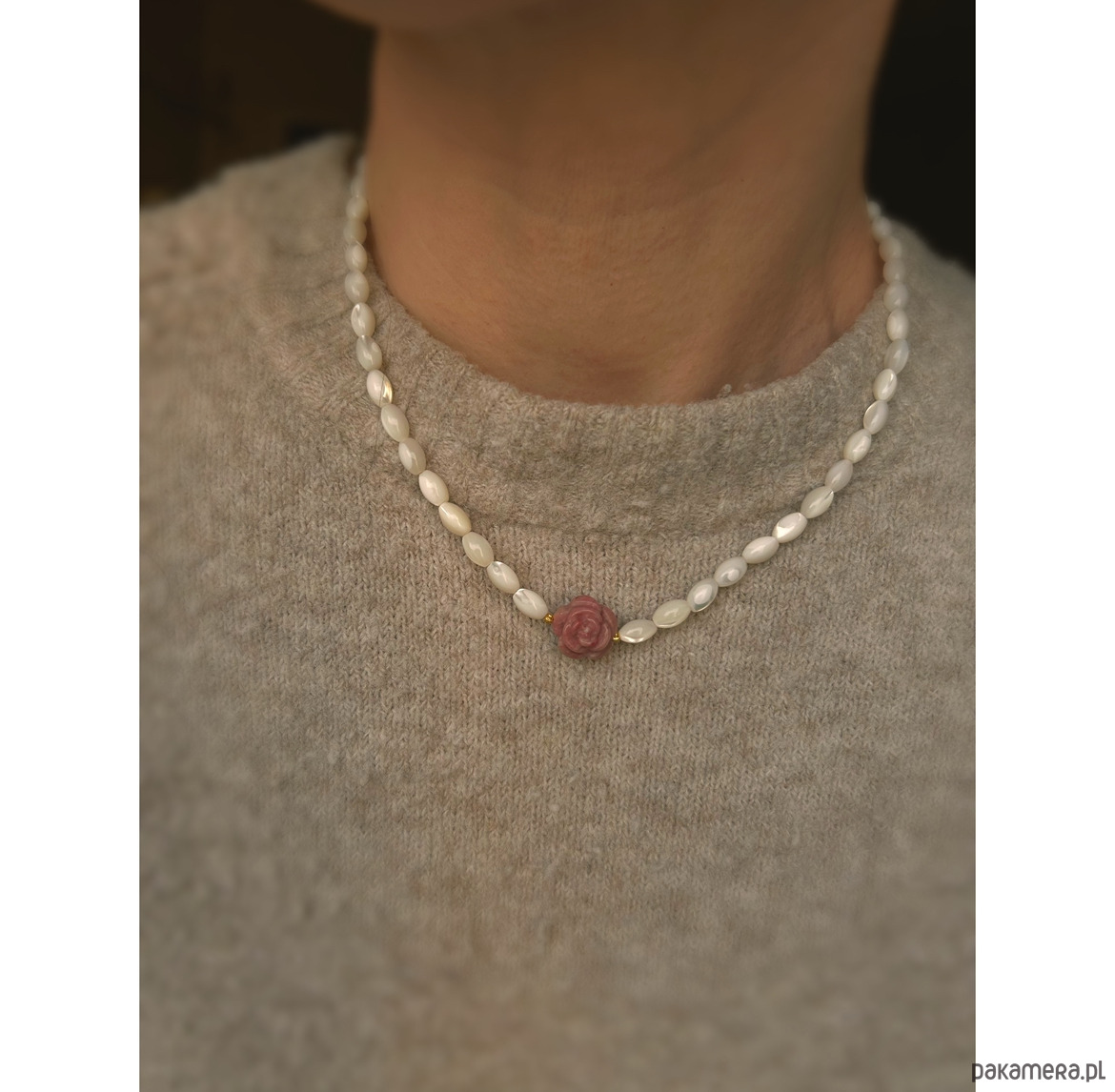 Naszyjnik choker z masy perłowej i różą z Rodonitu.