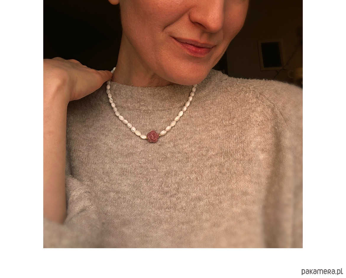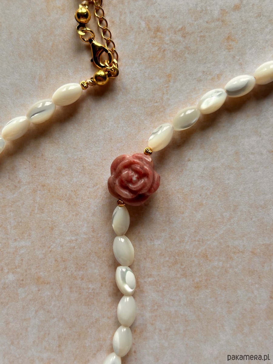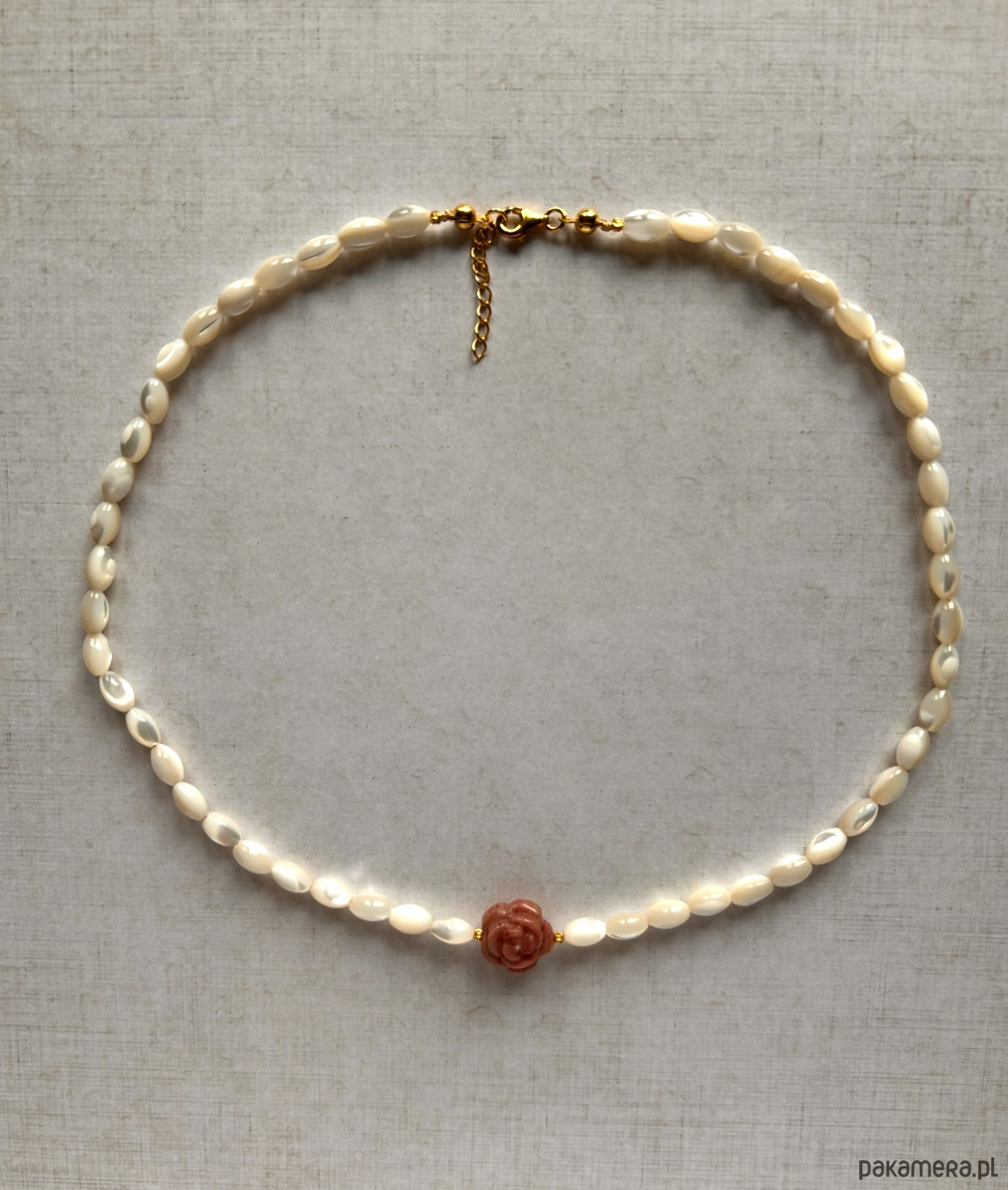 Naszyjnik choker z masy perłowej i różą z Rodonitu.