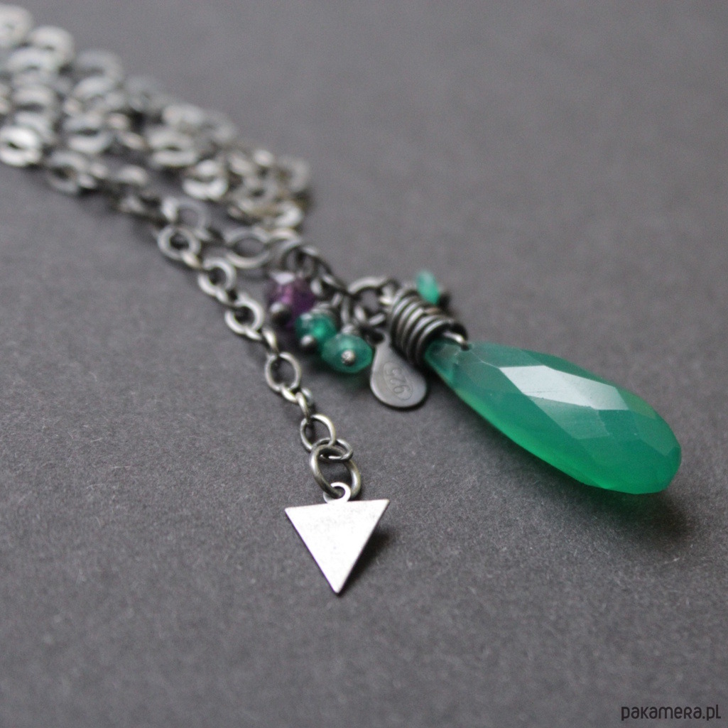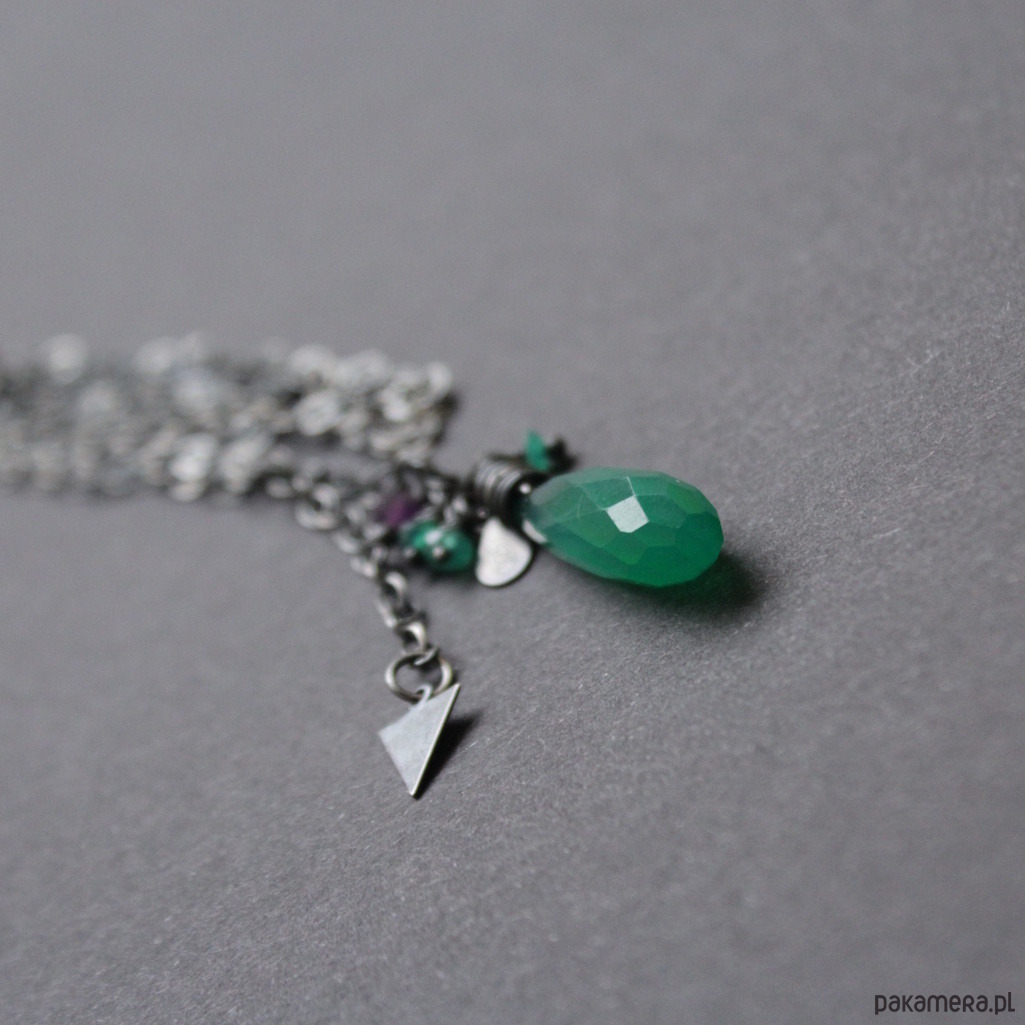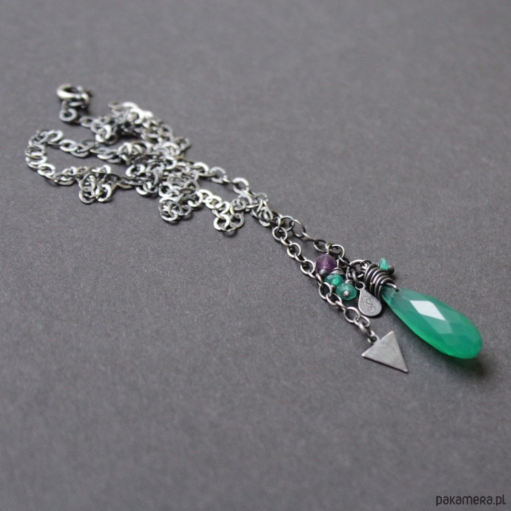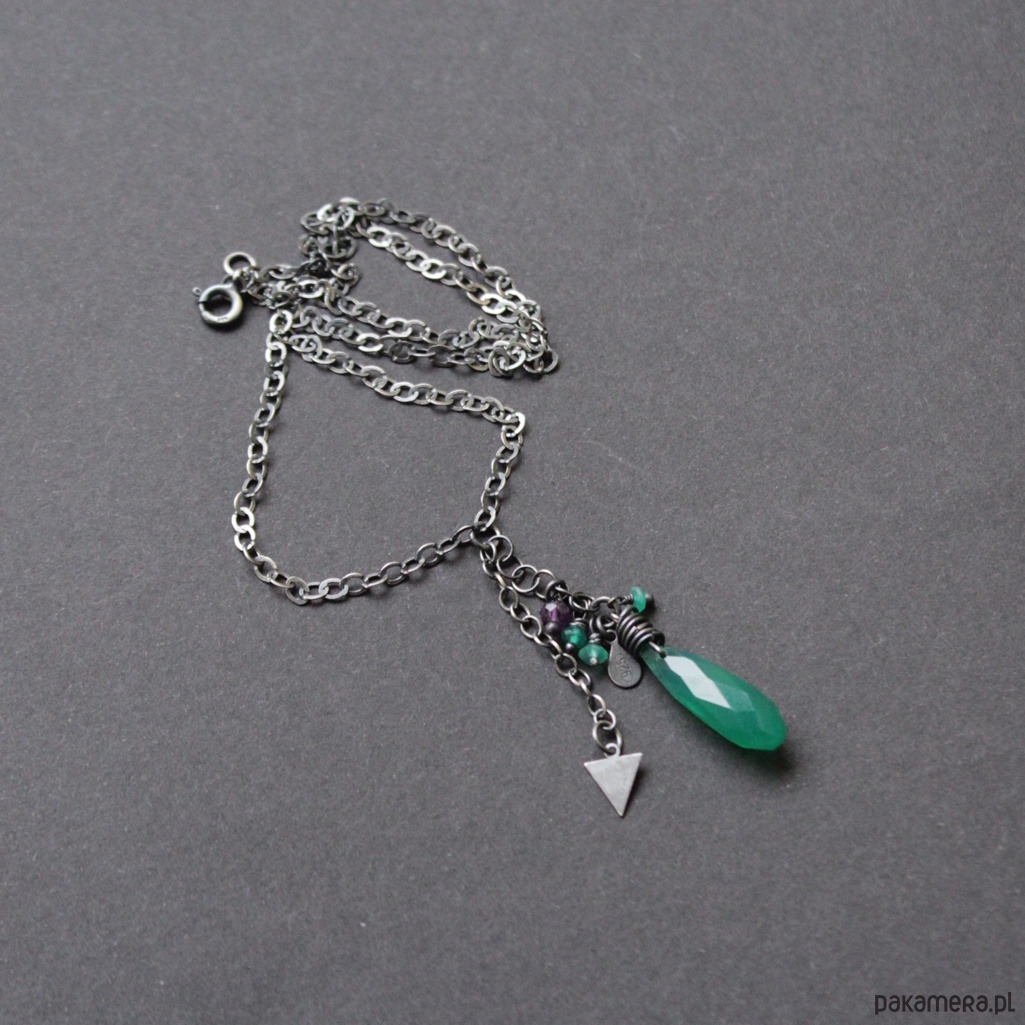 Na srebrnym łańcuchu zawieszony został piękny zielony onyks wielkości 2,2 cm w towarzystwie fasetoanych onysków oraz ametystu wielkosci 0,2 cm .
