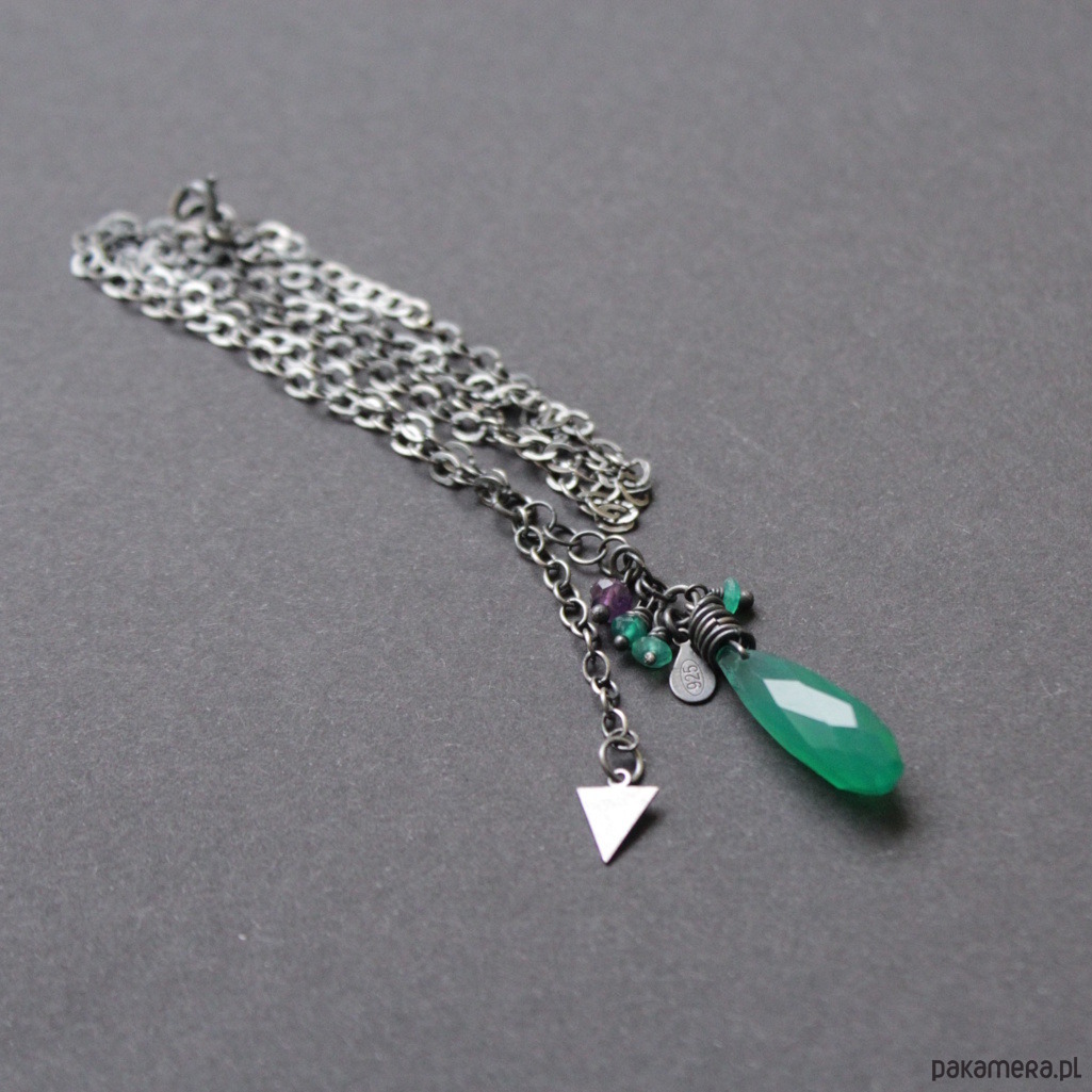Na srebrnym łańcuchu zawieszony został piękny zielony onyks wielkości 2,2 cm w towarzystwie fasetoanych onysków oraz ametystu wielkosci 0,2 cm .