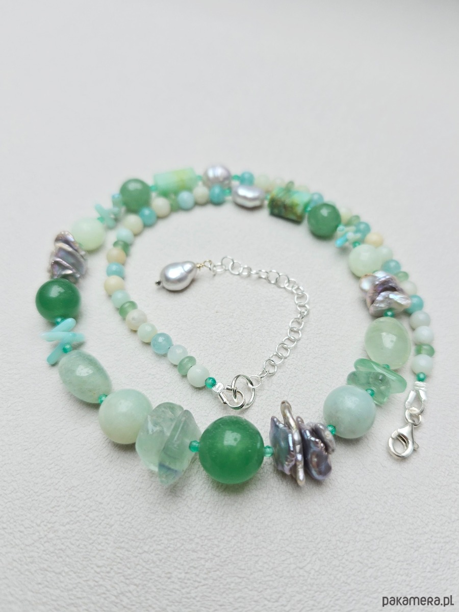 Wykorzystane kamienie: amazonit, awenturyn, morganit, fluoryt, jadeit, zielony onyks, koral, perły