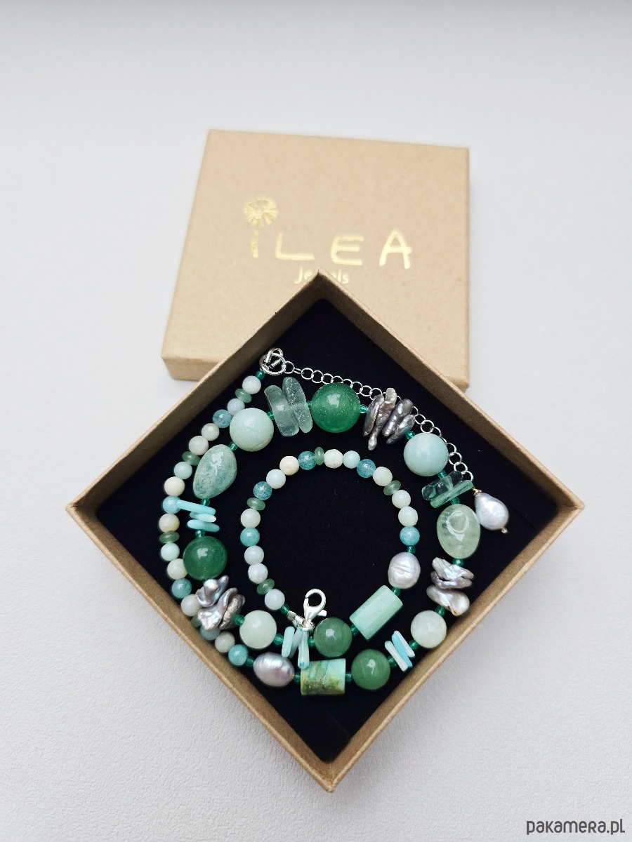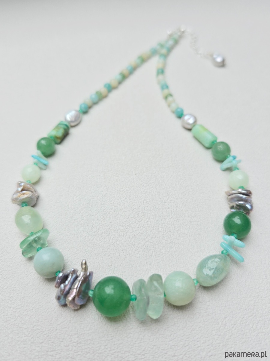 Wykorzystane kamienie: amazonit, awenturyn, morganit, fluoryt, jadeit, zielony onyks, koral, perły