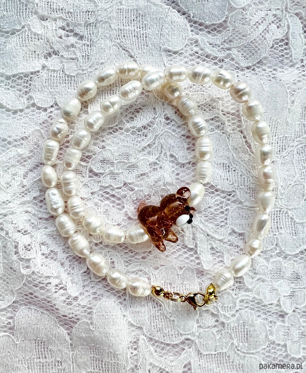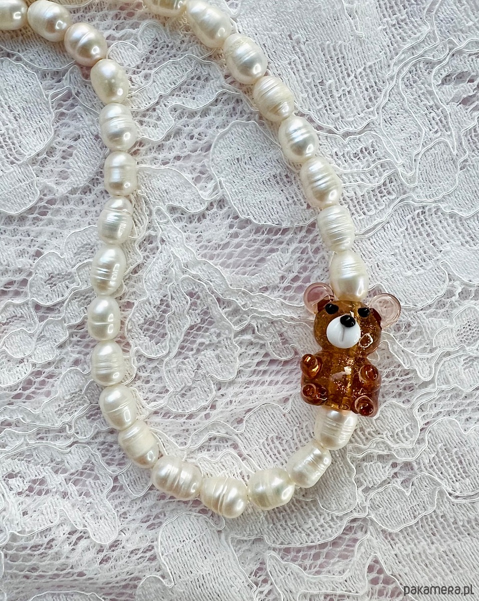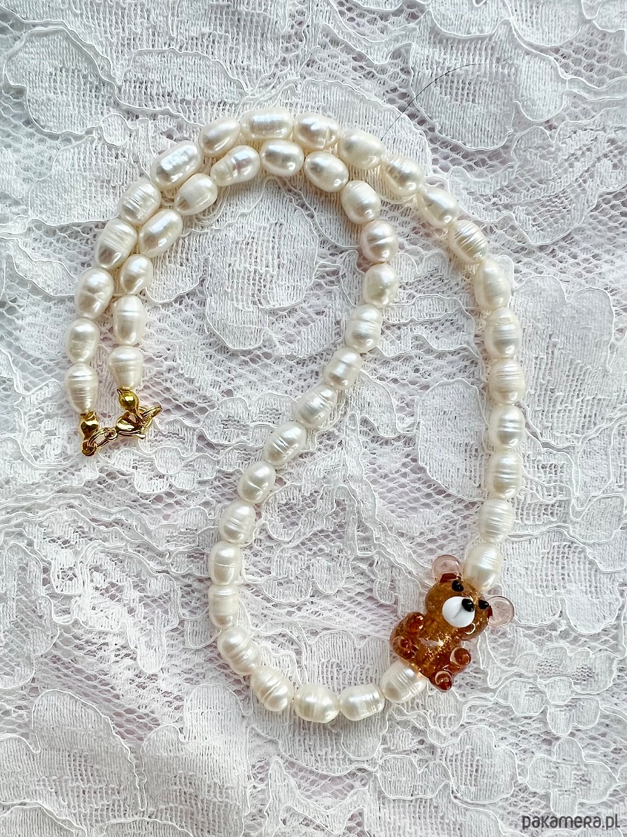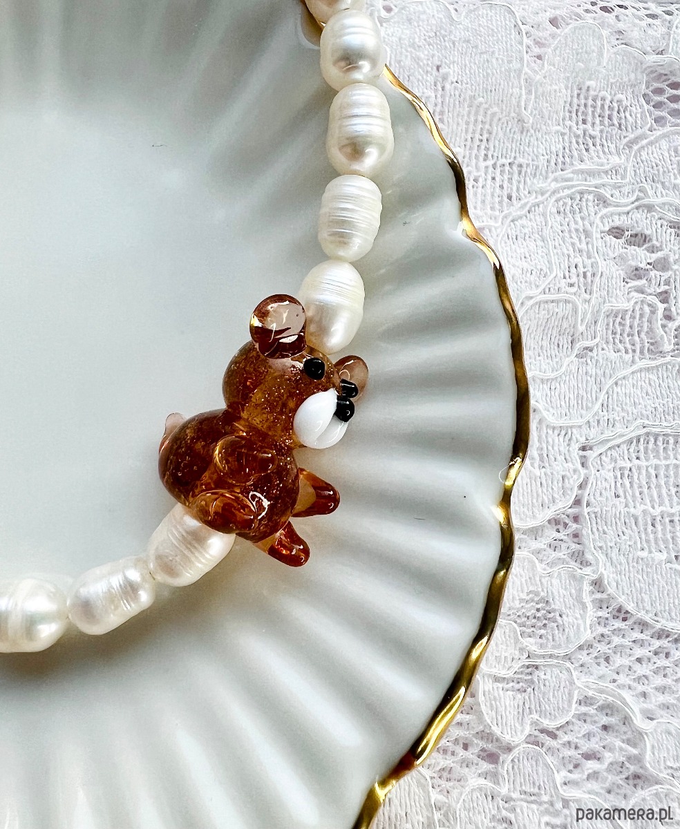 Wyjątkowy naszyjnik choker z pereł naturalnych hodowlanych, które zestawione są ze słodkim, brązowym misiem wykonanym ręcznie ze szkła. Naszyjnik wykończony jest stalą chirurgiczną.