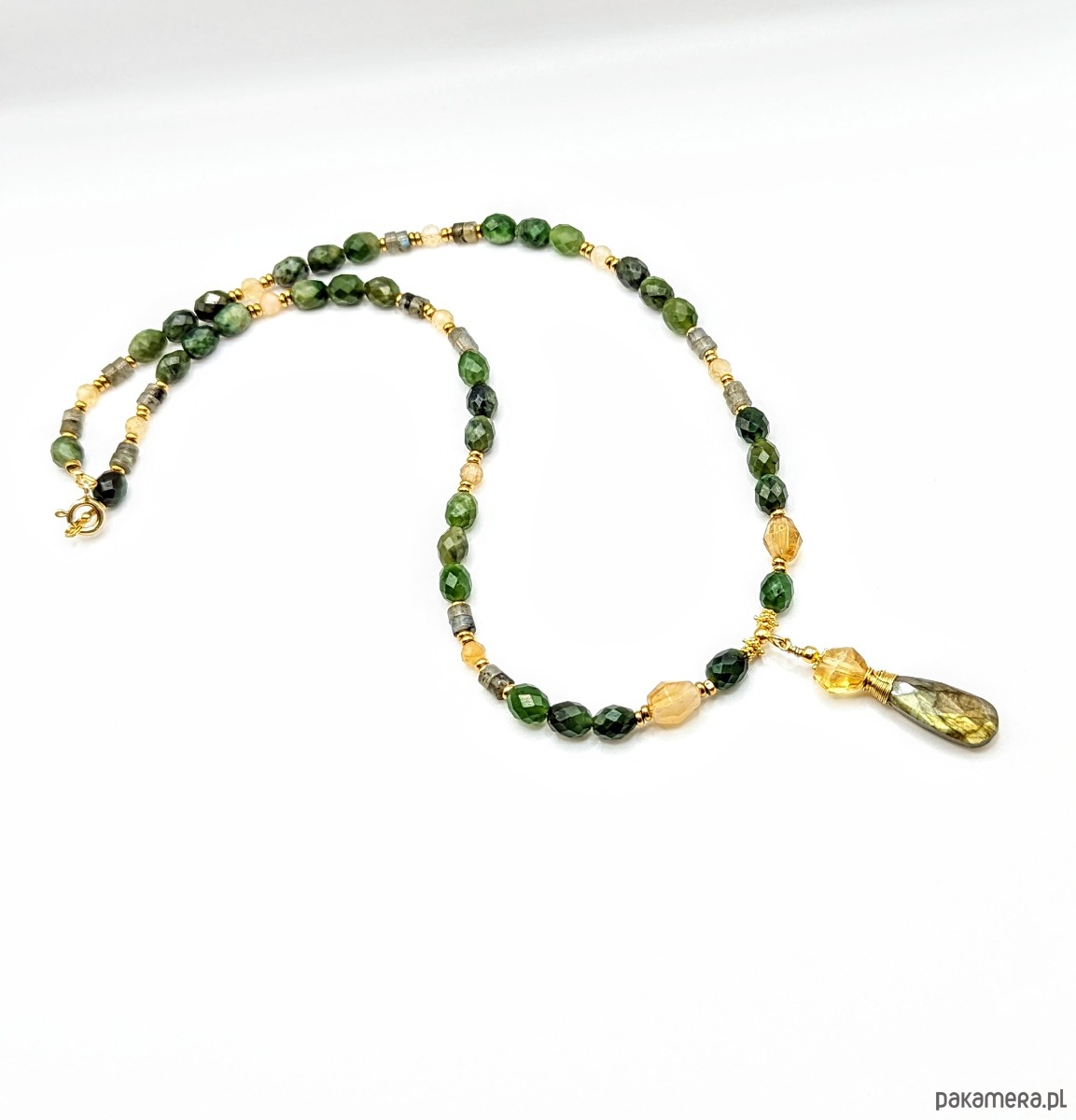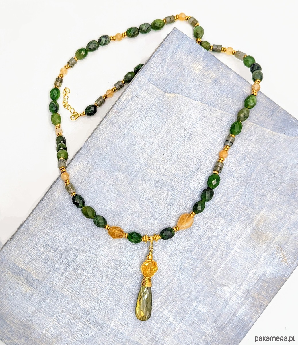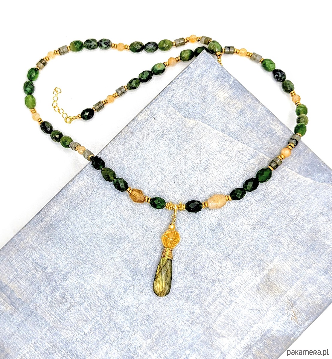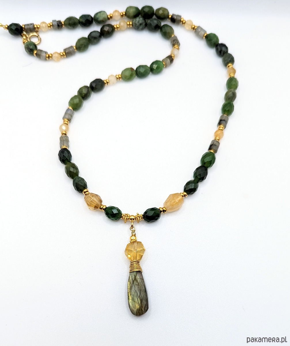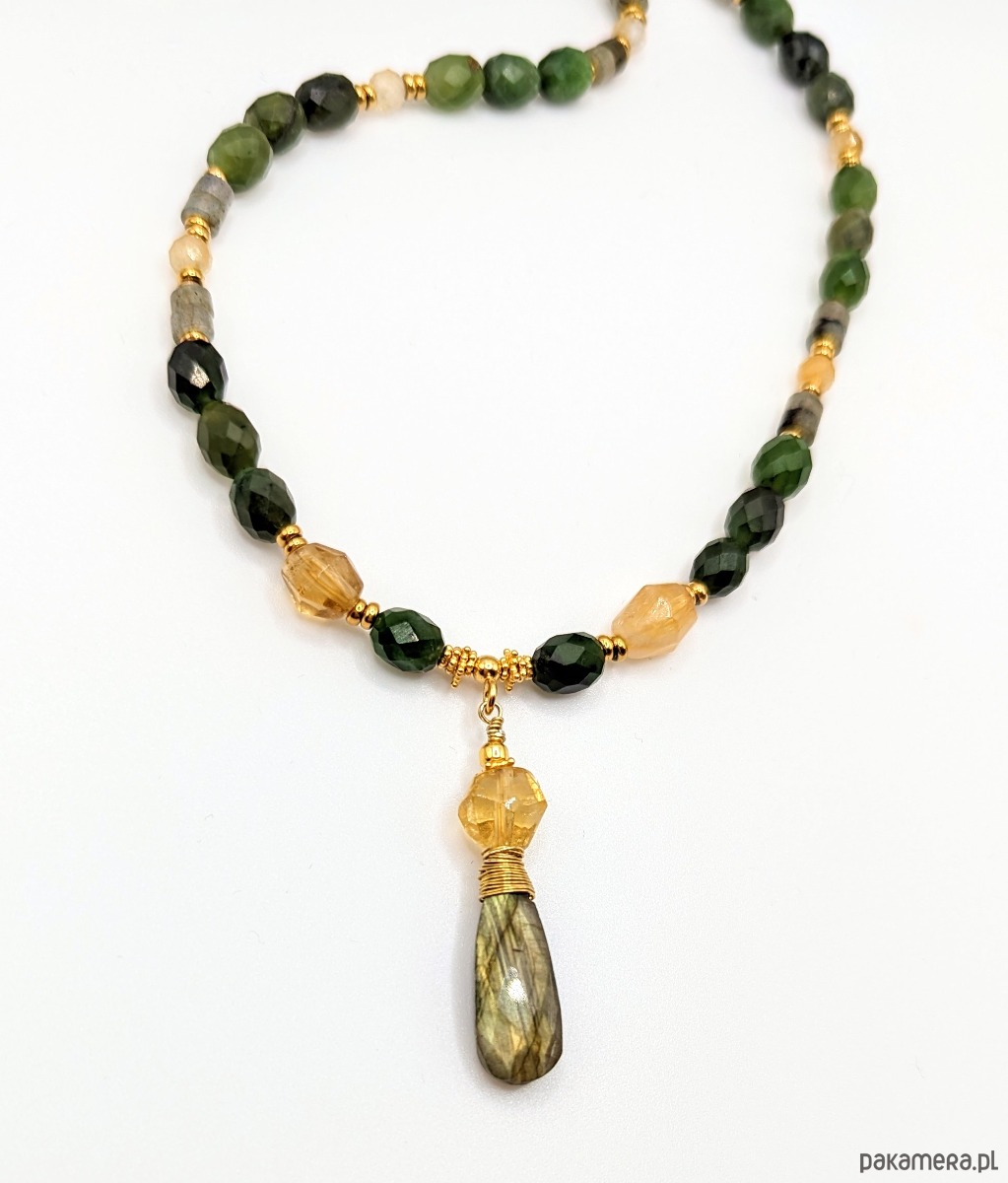W tym naszyjniku jest moc - intensywne barwy, opalizacja, piękny szlif kamieni. Dość odważny, pięknie eksponuje dekolt. Wykonany na bazie nefrytu, znanego jako ulubiony kamień chińskich cesarzowych. Rozświetlony cytrynami i labradorytami. Zawieszka emanuje złotym blaskiem, jest efektowna i wyrazista.