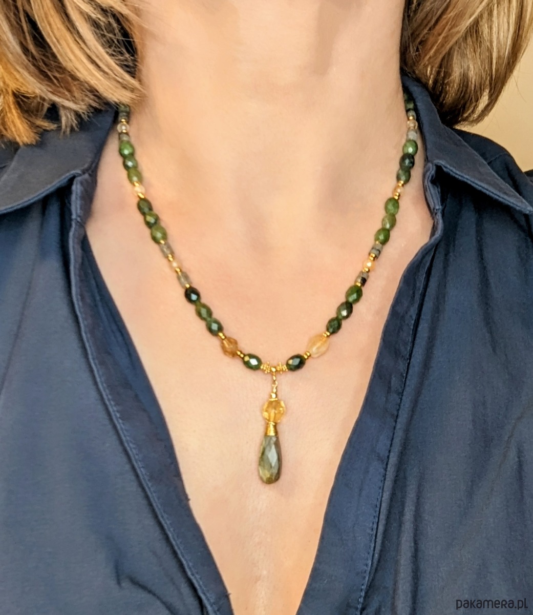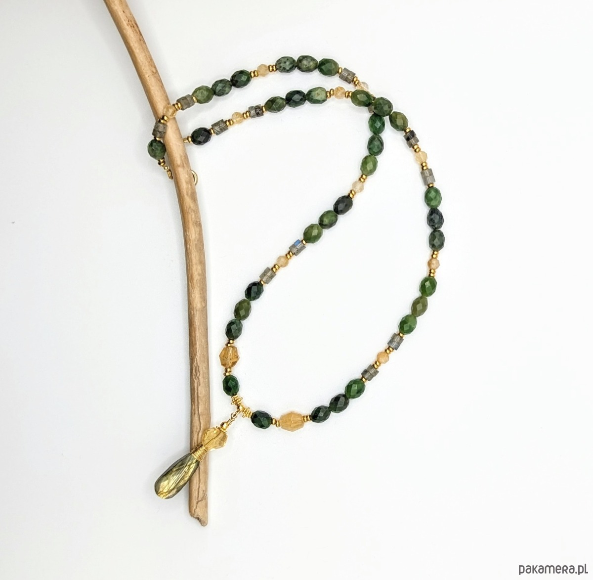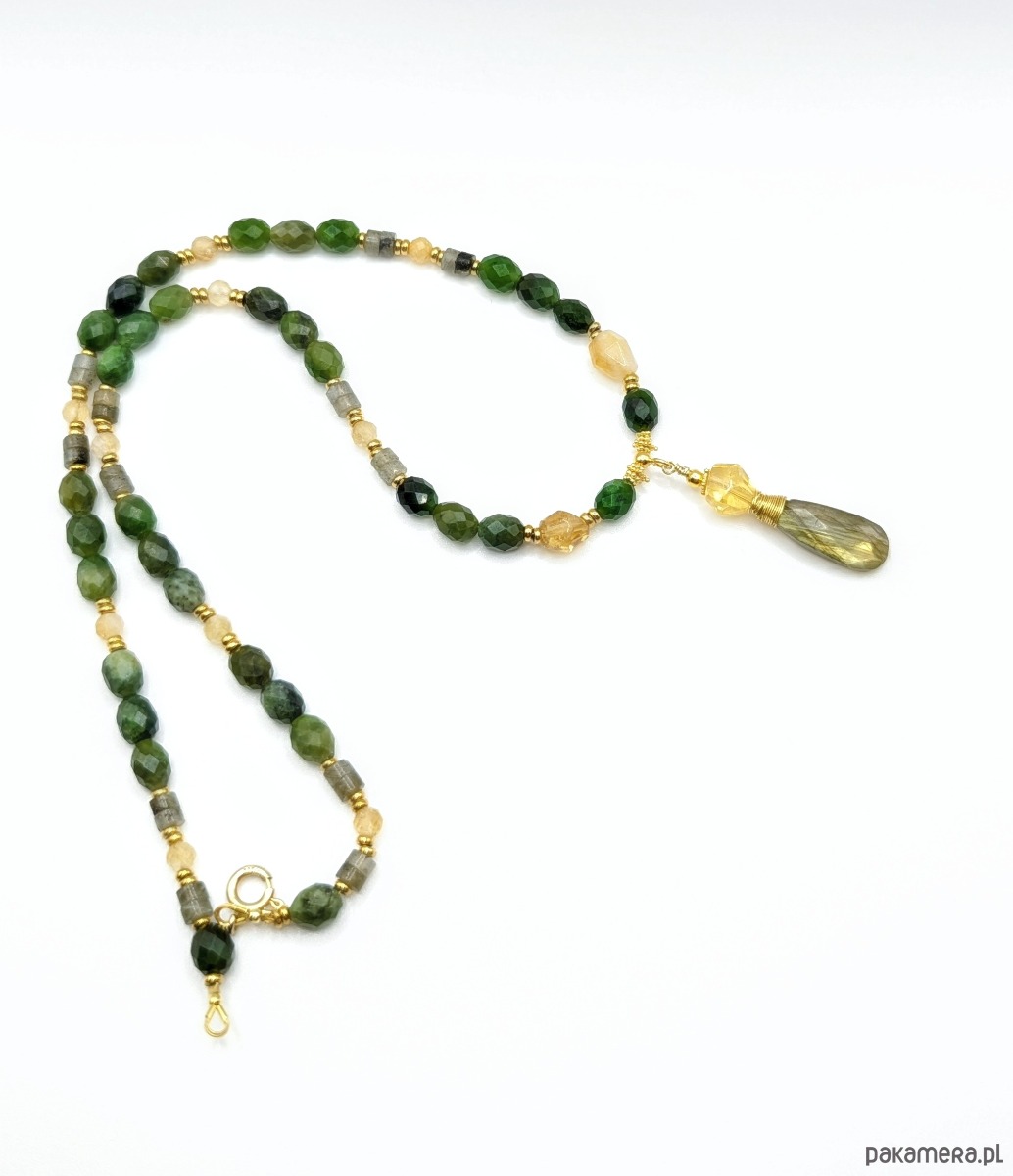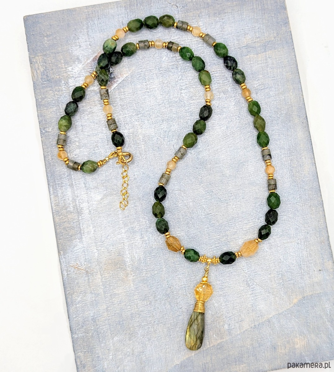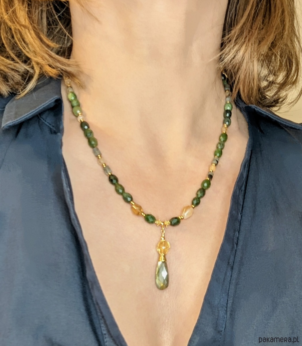 W tym naszyjniku jest moc - intensywne barwy, opalizacja, piękny szlif kamieni. Dość odważny, pięknie eksponuje dekolt. Wykonany na bazie nefrytu, znanego jako ulubiony kamień chińskich cesarzowych. Rozświetlony cytrynami i labradorytami. Zawieszka emanuje złotym blaskiem, jest efektowna i wyrazista.