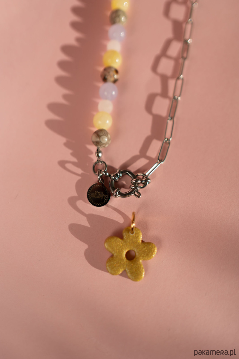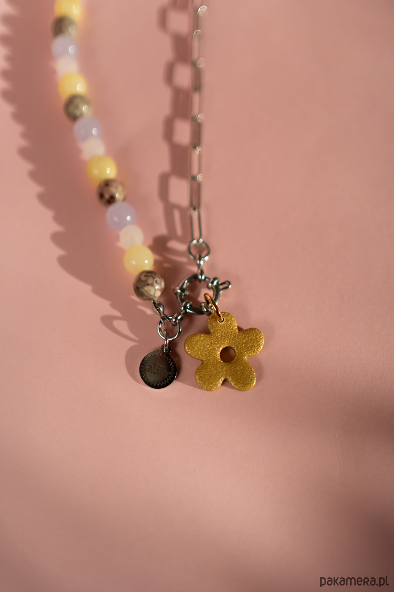 Naszyjnik mix koraliki i łańcuszek z zawieszką kwiatek