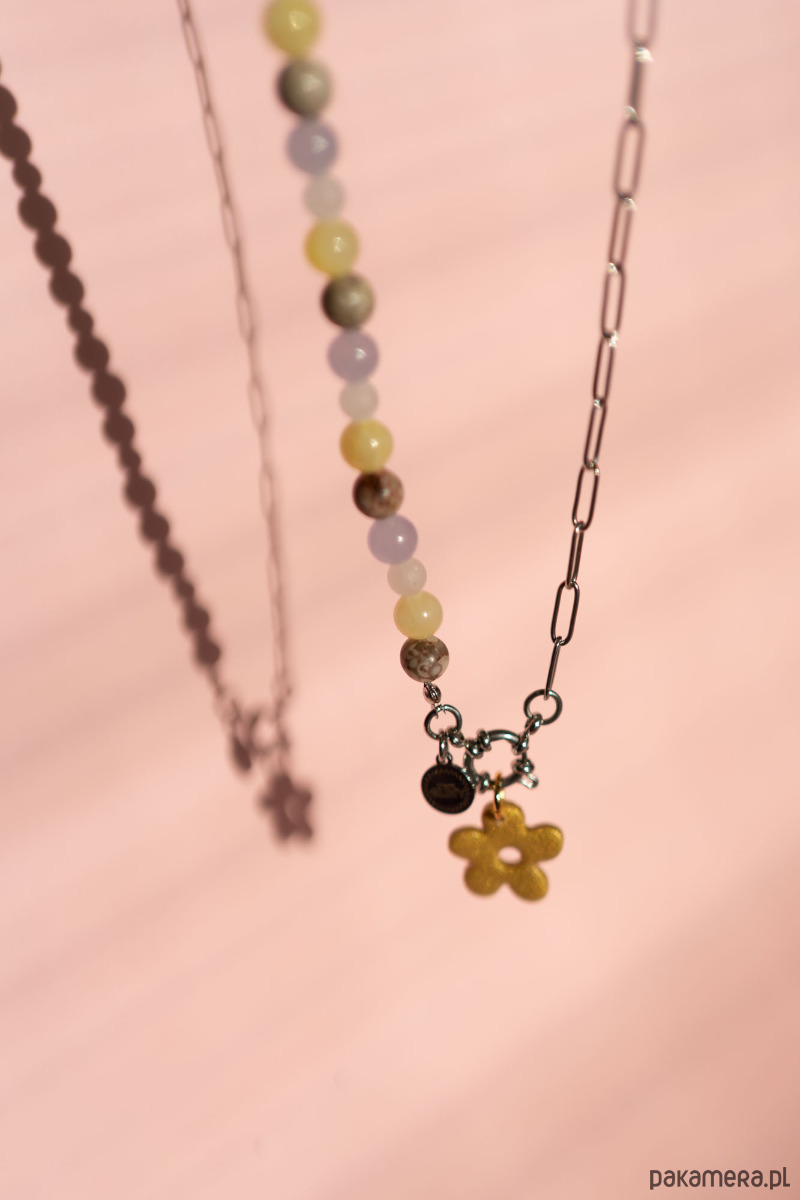 Krótki naszyjnik zapinany z przodu. Składa się z miksu kamieni naturalnych i łańcuszka ze stali chirurgicznej oraz zawieszki kwiatek w kolorze złotym. Idealny do noszenia na co dzień lub kiedy masz na to ochotę! Jedyny w swoim rodzaju, ręcznie robiony! Jest lekki i łatwy w zapinaniu. Naszyjnik możesz nosić na dwa sposoby z zawieszką lub bez, albo powiesić swoją ulubioną zawieszkę.