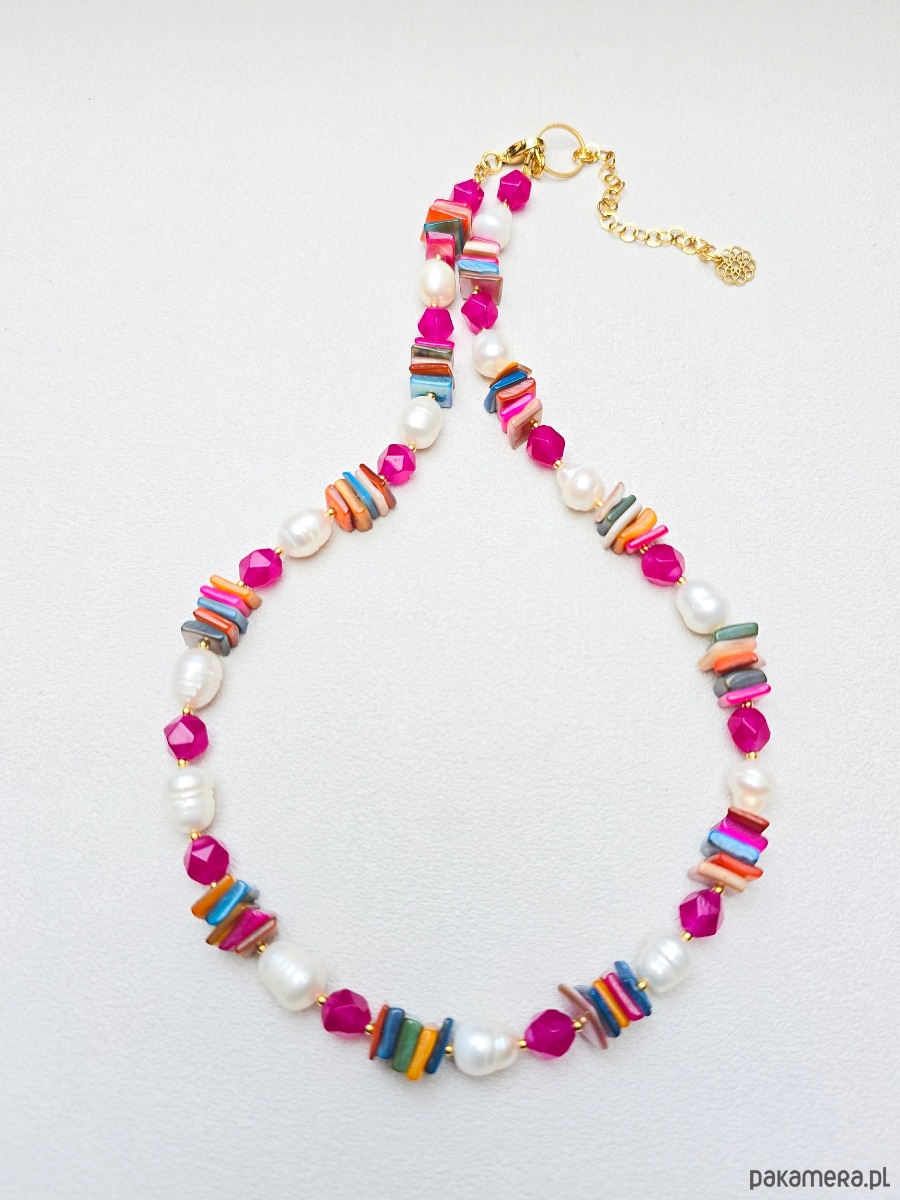 Wykorzystane kamienie: kolorowa masa perłowa, perły naturalne, jadeit, zawieszka z rubinem i złocony hematyt.