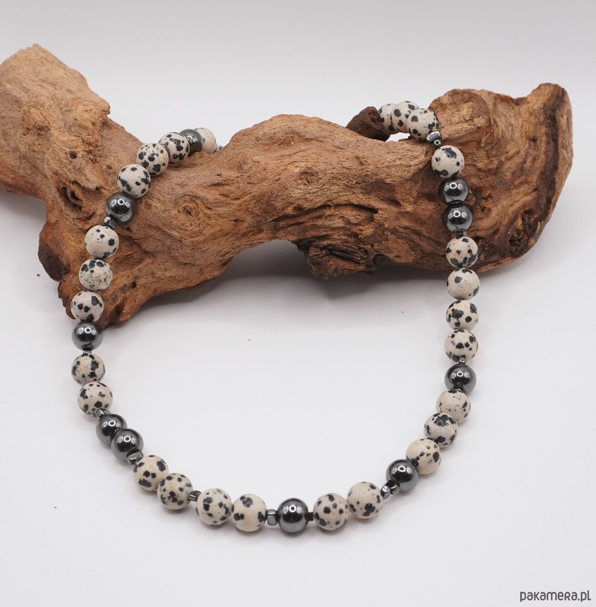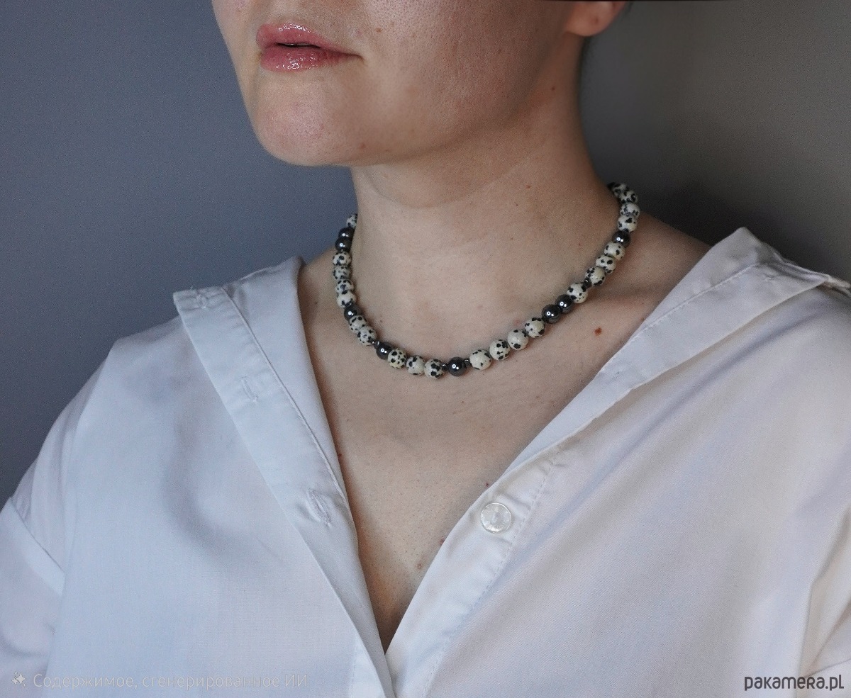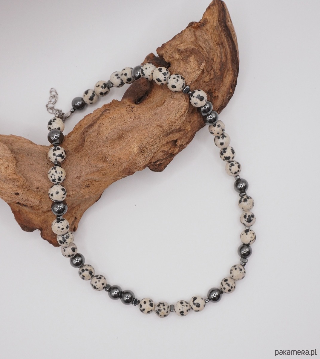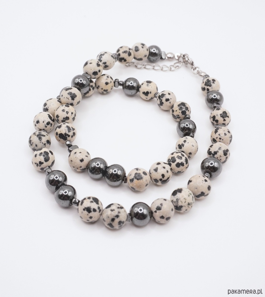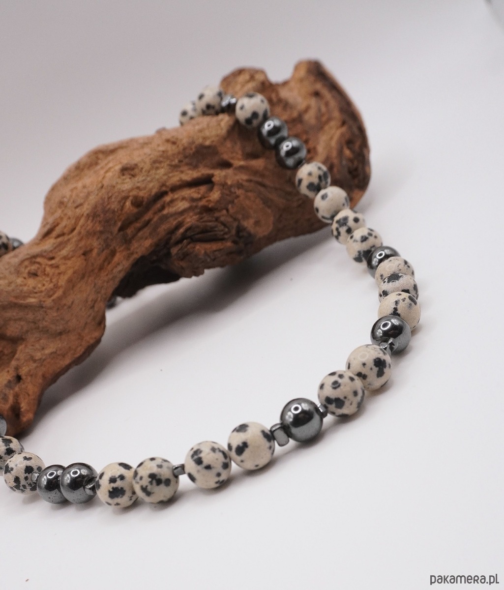 Głównym motywem jest jaspis dalmatyńczyk, zachwycający swoimi naturalnymi, czarnymi plamkami na jasnym tle. Kompozycja została przełamana błyszczącymi kulkami ciemnego hematytu, które nadają całości elegancji i biżuteryjnego blasku. To idealny wybór dla osób, które kochają monochromatyczne zestawy i stylizacje oparte na bieli, czerni i szarościach.