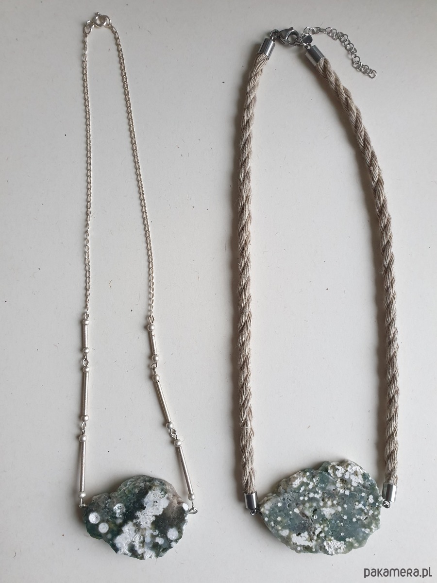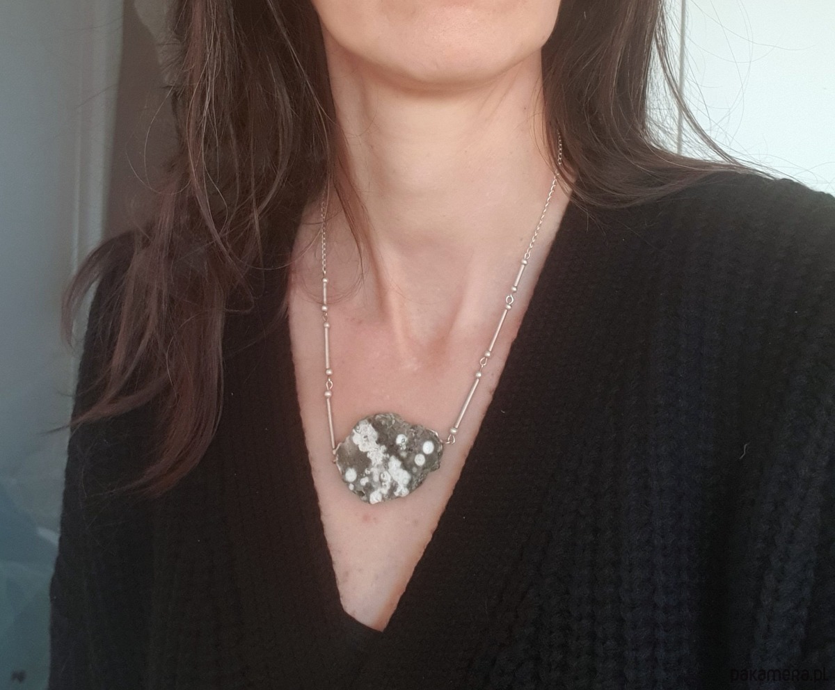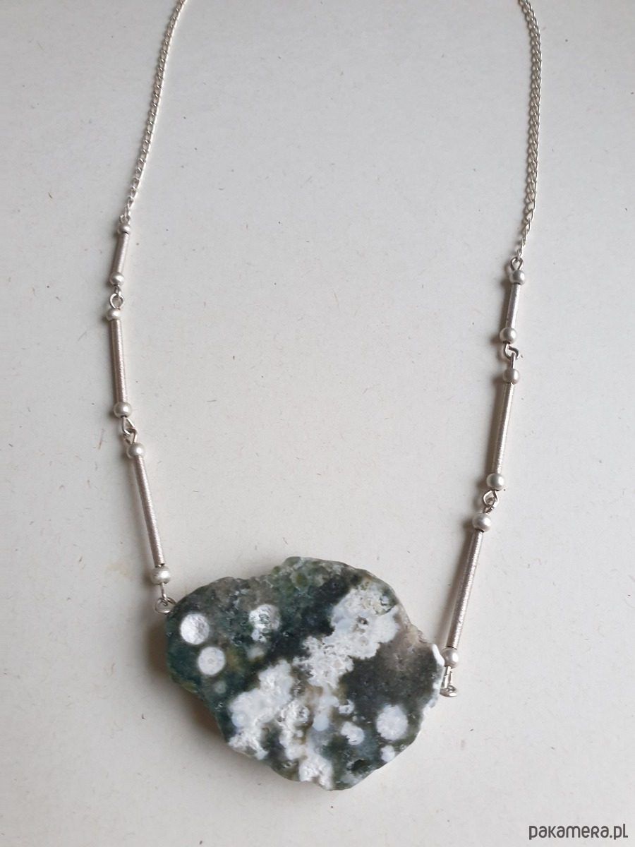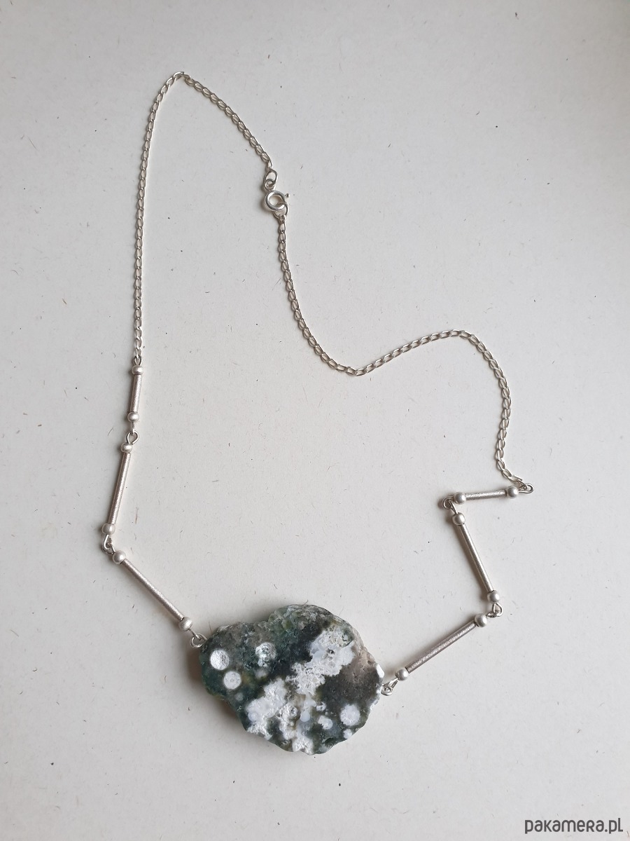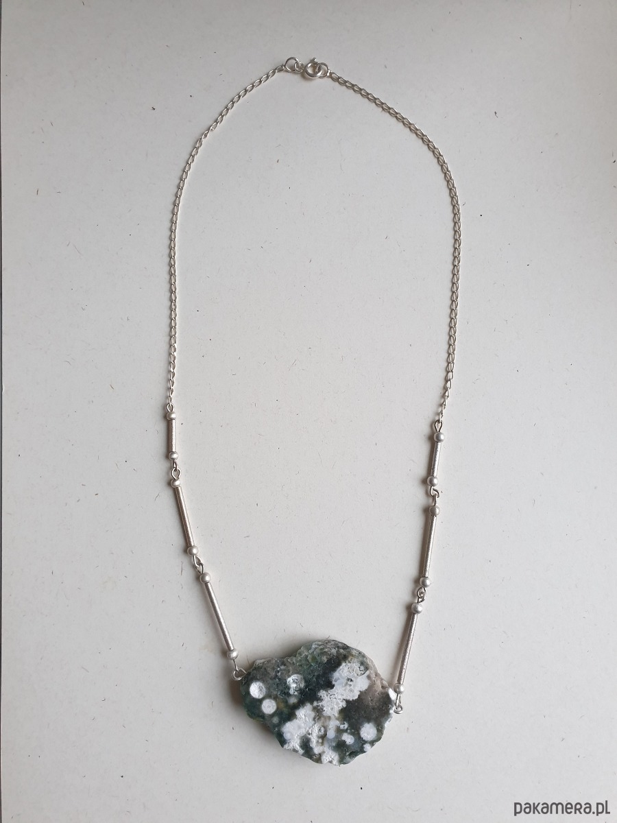 Naszyjnik z wyjątkowej kolekcji MOON z jaspisem oceanicznym i srebrem (próba 925). Każdy naszyjnik z tej kolekcji jest pojedynczym egzemplarzem, nie do powtórzenia.Ten ozdobny naszyjnik na pewno jest na specjalne okazje, świetnie wygląda z czarną, beżową sukienką czy lnianą bluzką.