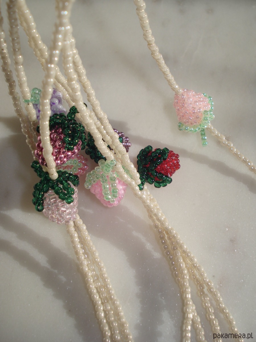 Owoce są ręcznie szyte z najwyższej jakości japońskich, szklanych koralików.