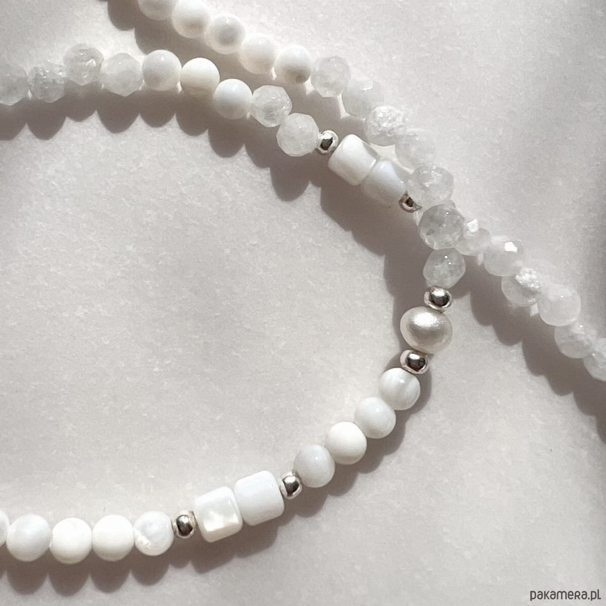 Naszyjnik MORZE to wyjątkowe połączenie naturalnego agatu, masy perłowej i delikatnej perły hodowlanej, tworzące harmonijną kompozycję o klasycznym, a zarazem świeżym charakterze. Całość została oprawiona w srebro najwyższej próby 925, które dodaje lekkości i subtelnego blasku.