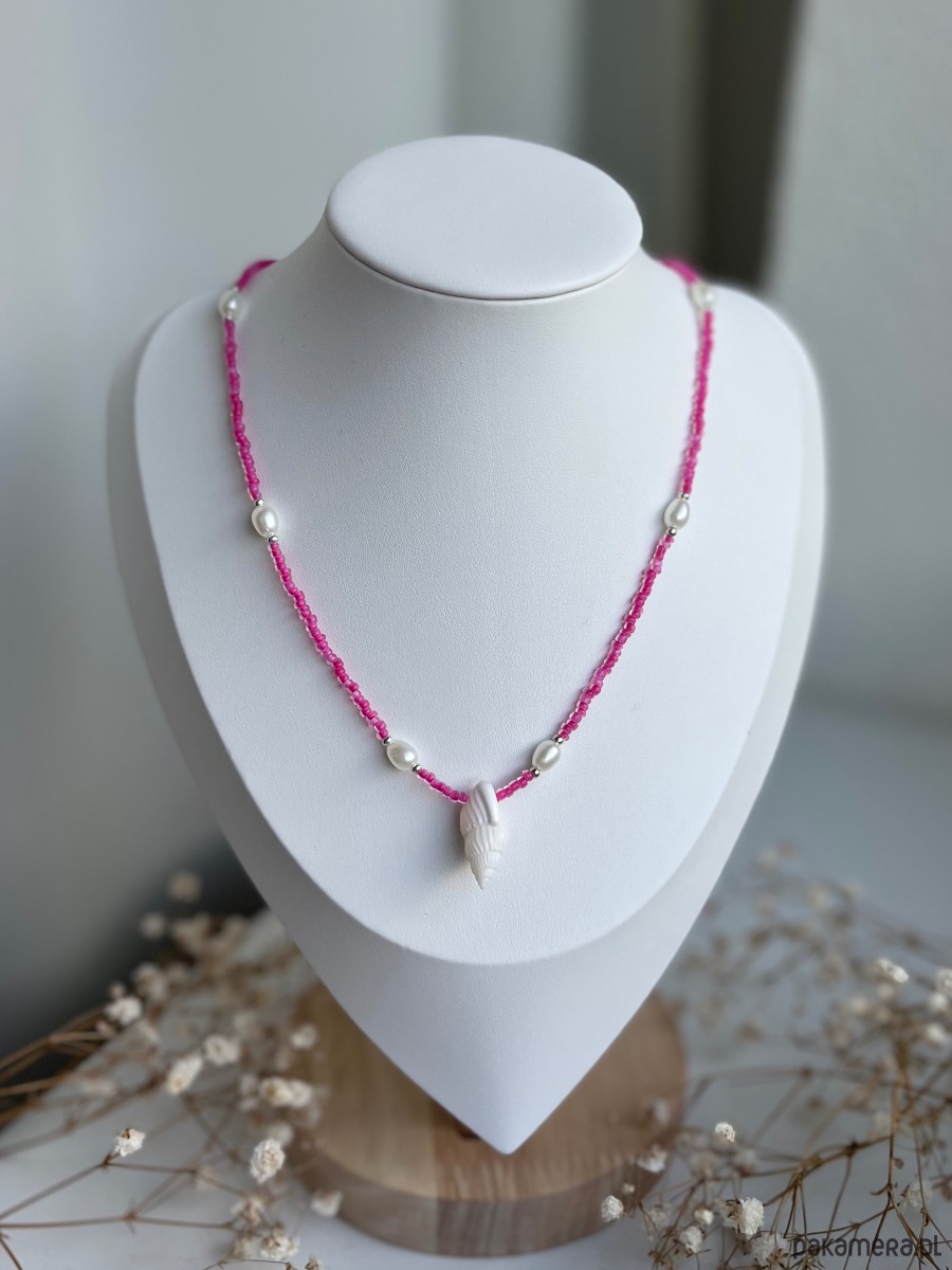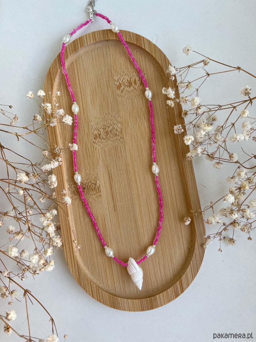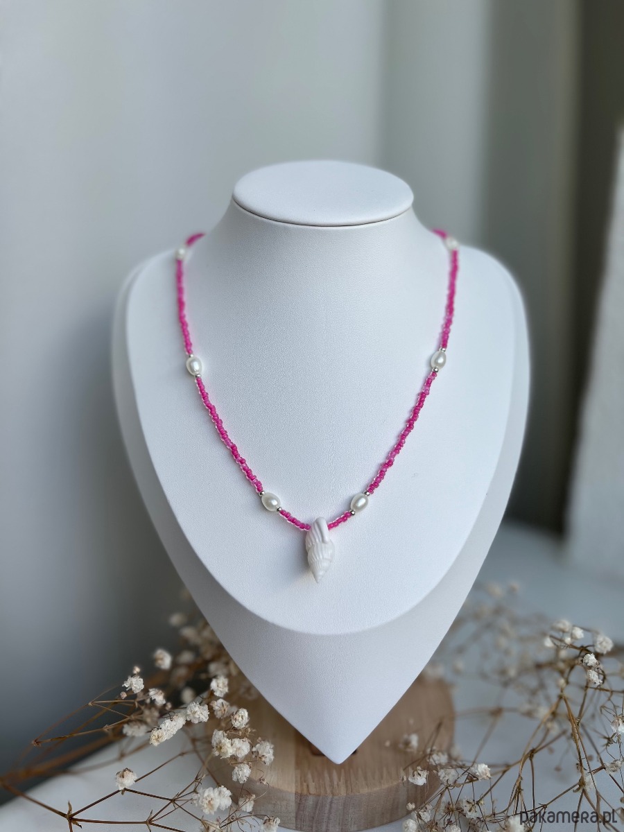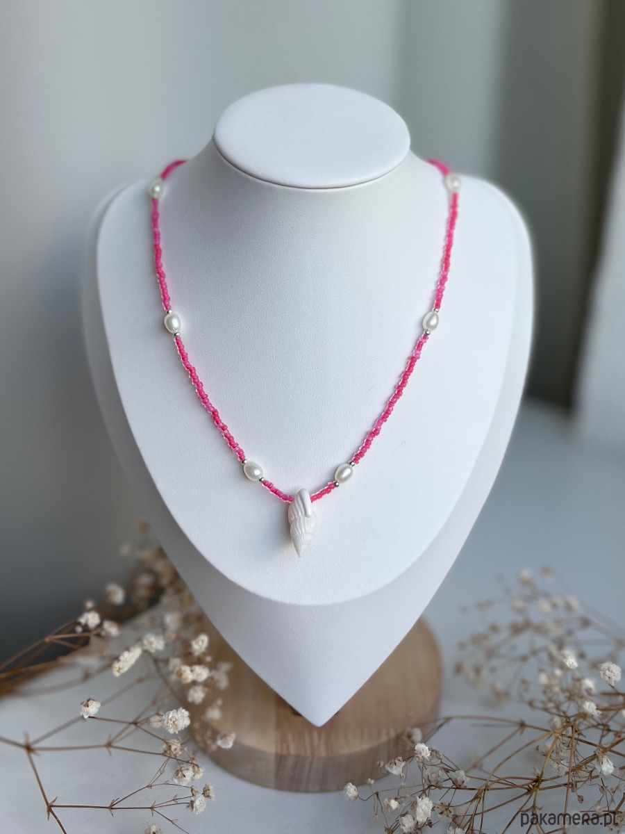 Naszyjnik ręcznie wykonany ze szklanych koralików oraz sztucznych pereł.