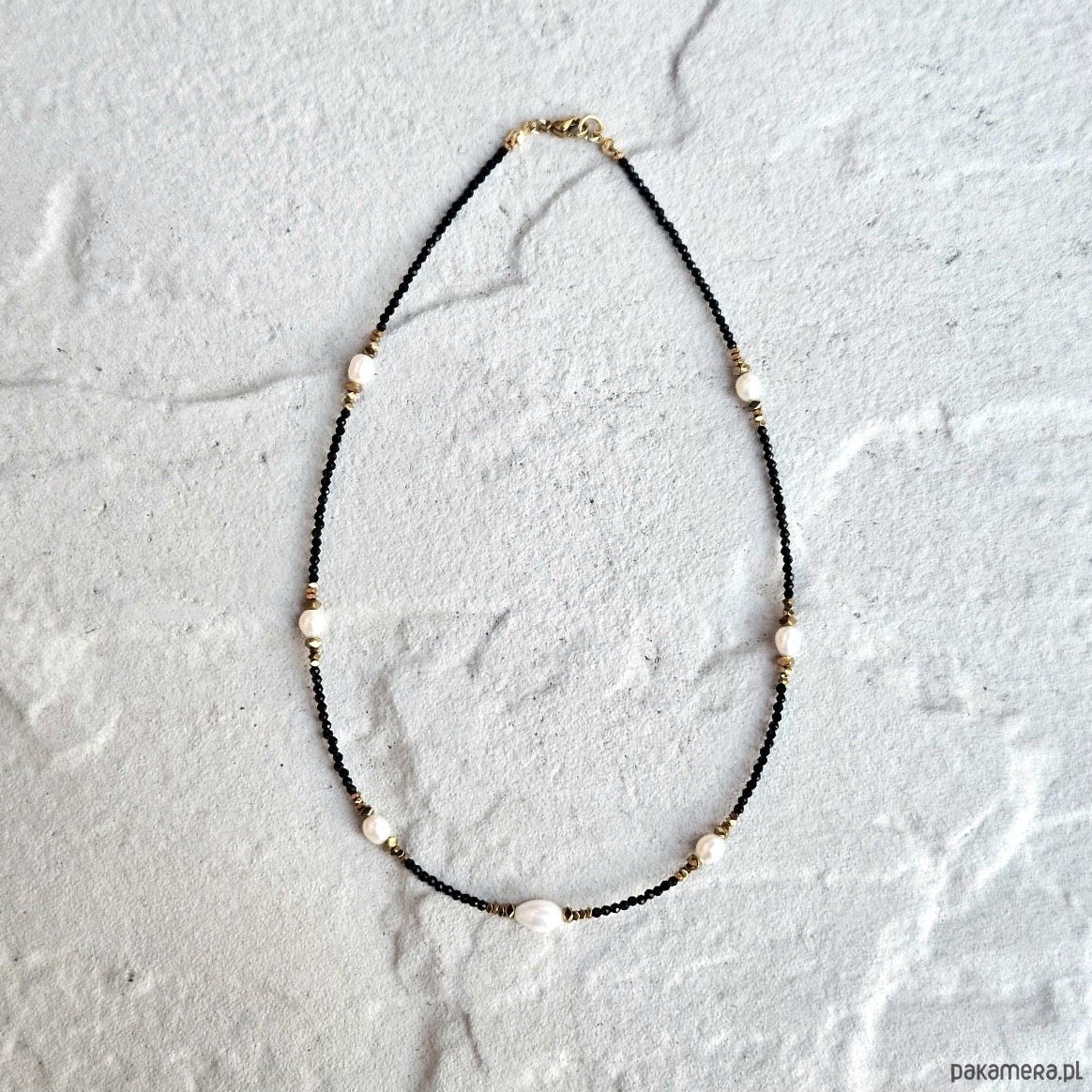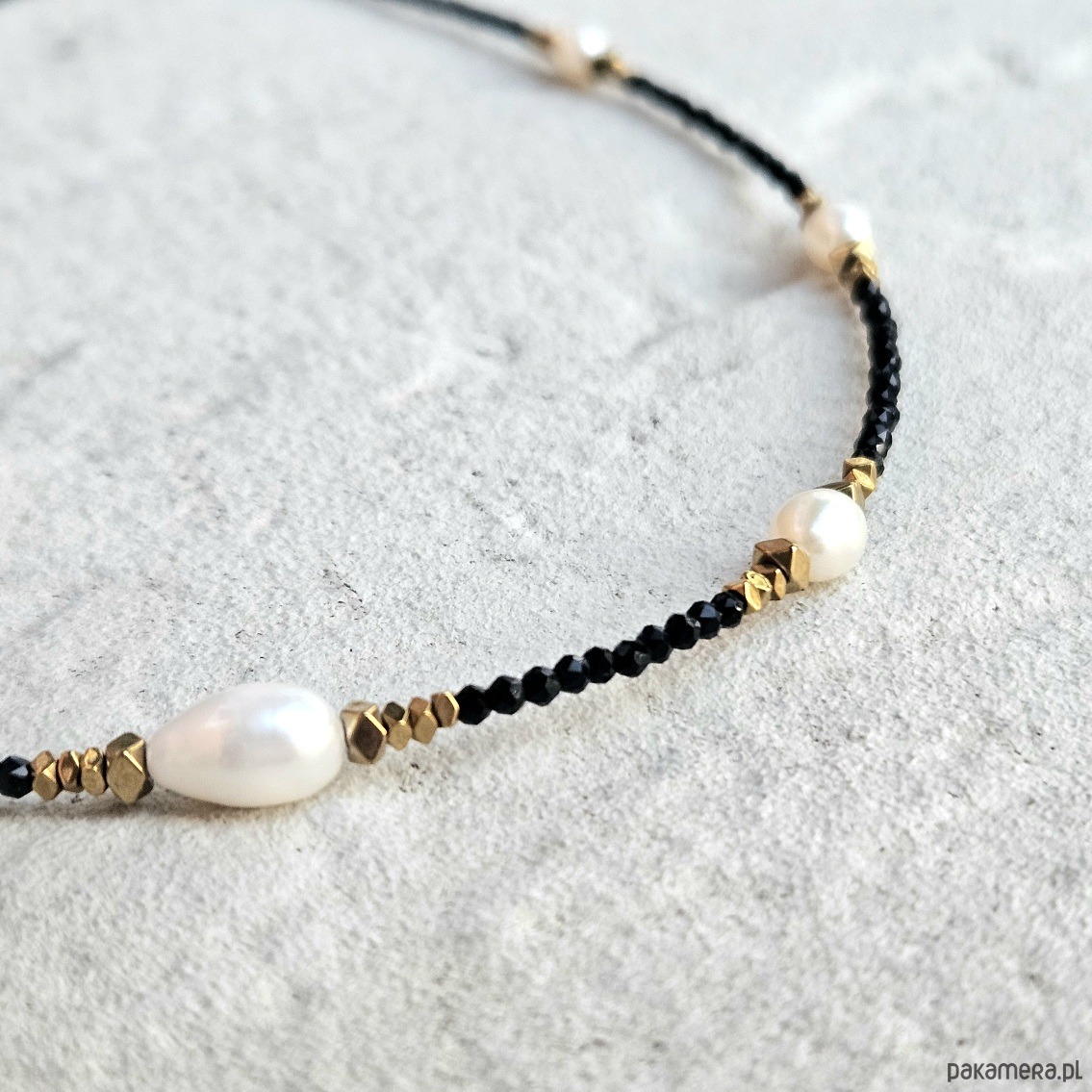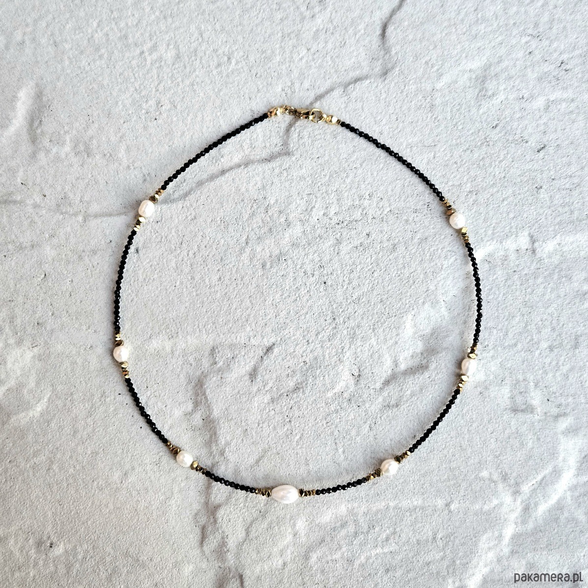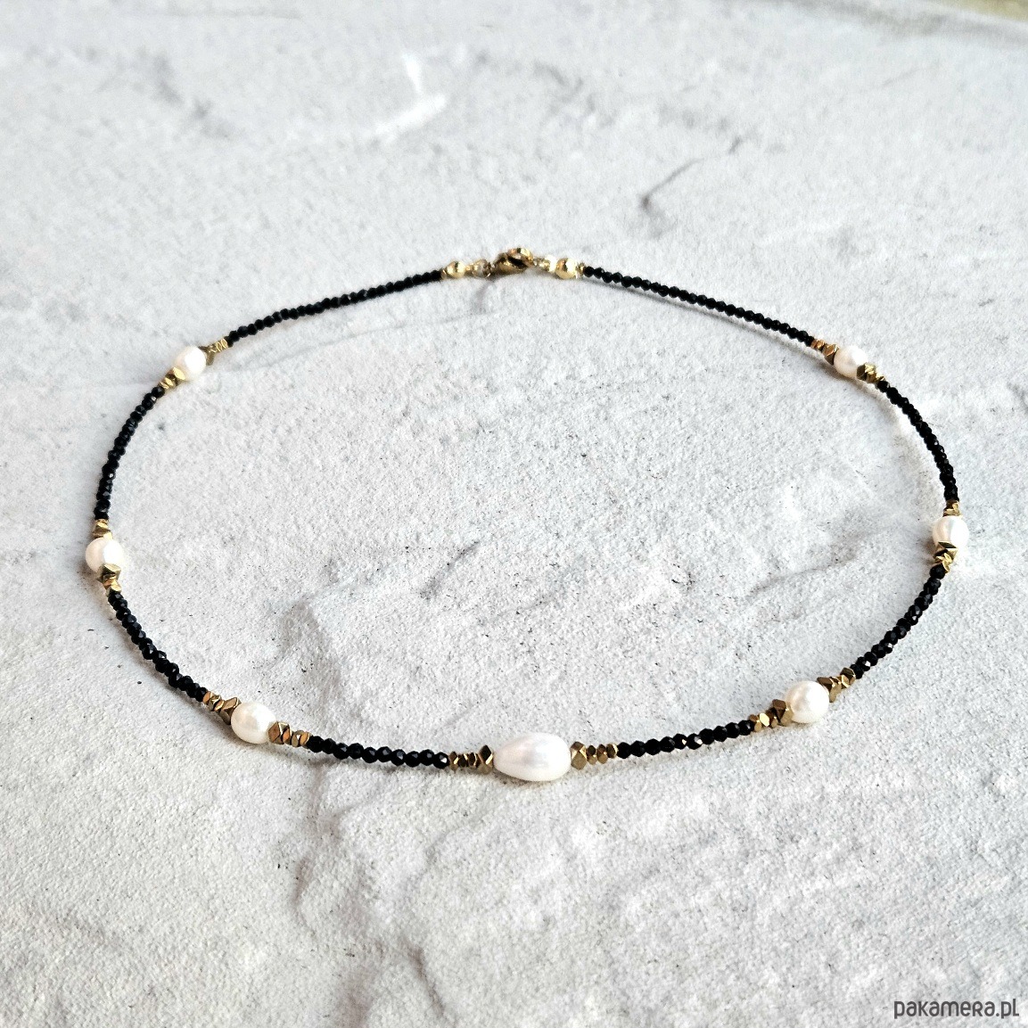 Ten delikatny choker łączy w sobie subtelność pereł słodkowodnych, blask spineli oraz elegancję złotych hematytów. Fasetowane spinele o głębokiej czerni nadają biżuterii wyrafinowanego charakteru, podkreślając jej unikalność. Perły słodkowodne wprowadzają harmonię i łagodność, symbolizując czystość i duchową równowagę. Z kolei złote hematyty dodają całości nuty luksusu, wzmacniając energię pewności siebie i wewnętrznej stabilności.