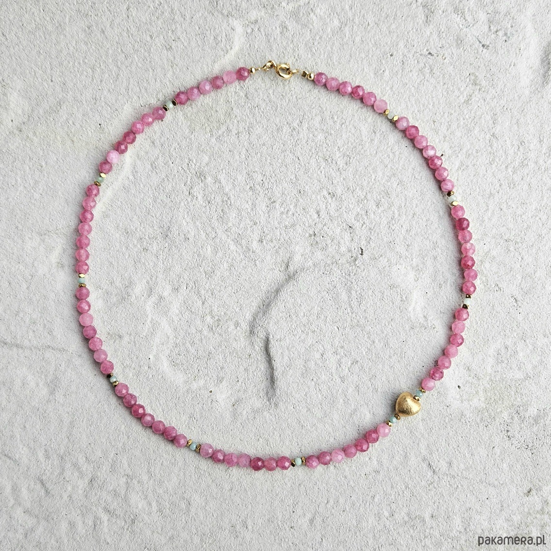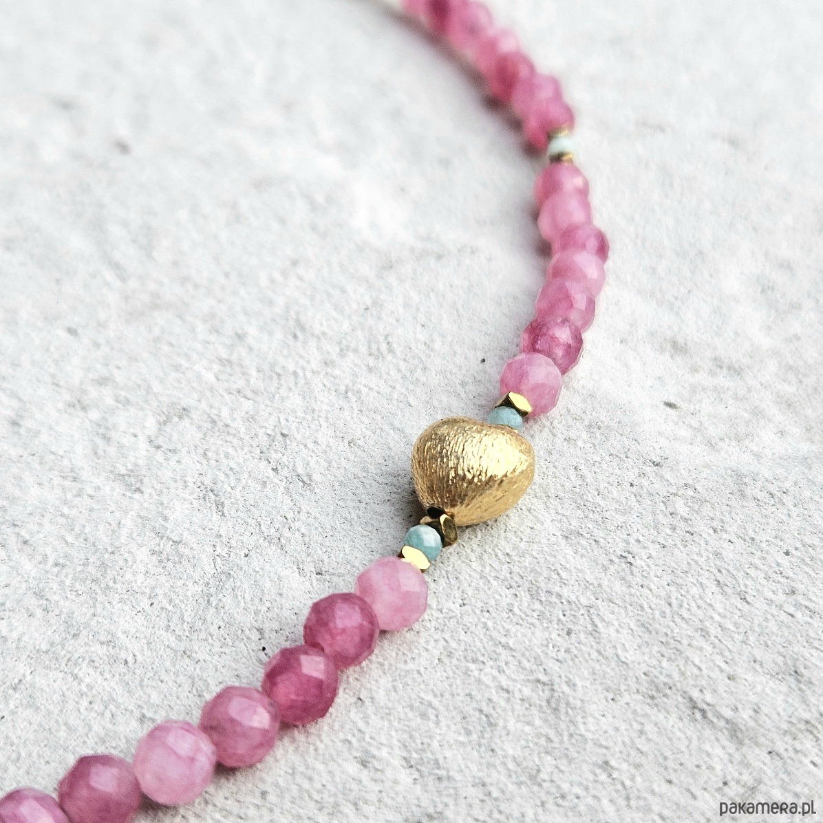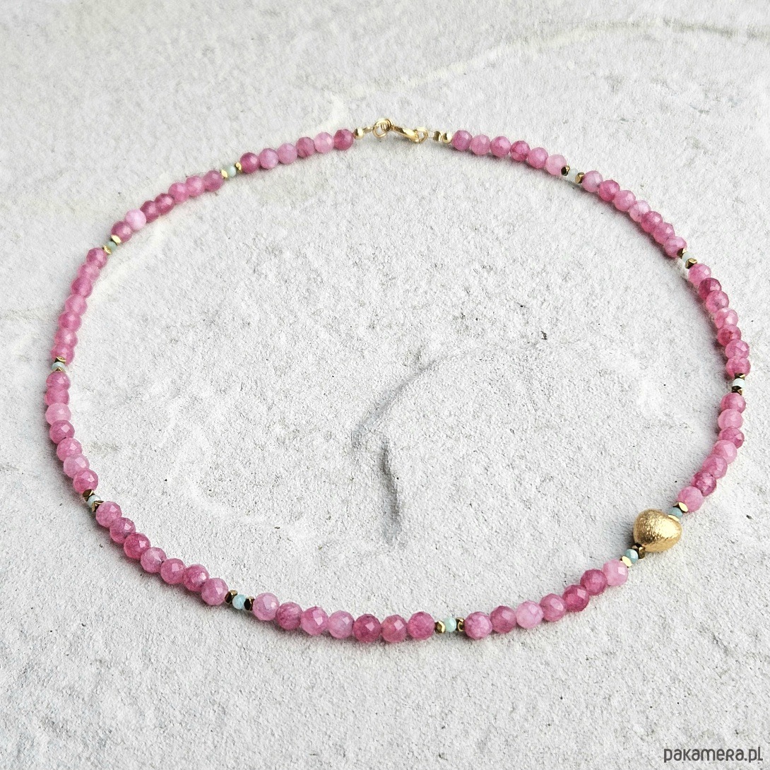 Choker z turmalinu różowego i amazonitu to połączenie subtelnej kobiecości z energią spokoju i harmonii. Fasetowane 4 mm kulki turmalinu otulają swoją delikatną barwą, wspierając otwarcie serca i równowagę emocjonalną, natomiast drobne, 2 mm kuleczki amazonitu wnoszą świeżość i lekkość. Całość przeplatana złotymi hematytami, podkreślającymi blask kamieni, zwieńczona została asymetrycznie umieszczonym sercem ze złoconego srebra. Choker doskonale współgra z energią Byka, Wagi i Ryb, harmonizując czakrę serca i wprowadzając uczucie bezpieczeństwa oraz wewnętrznego ciepła. To biżuteria stworzona dla osób, które cenią delikatność, ale jednocześnie chcą podkreślić swoją siłę i niezależność. Połączenie pastelowych odcieni z eleganckim złotem sprawia, że choker pasuje zarówno do codziennych, jak i bardziej wyjątkowych stylizacji.