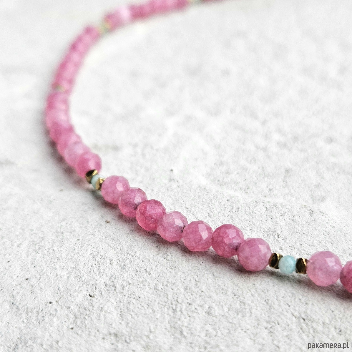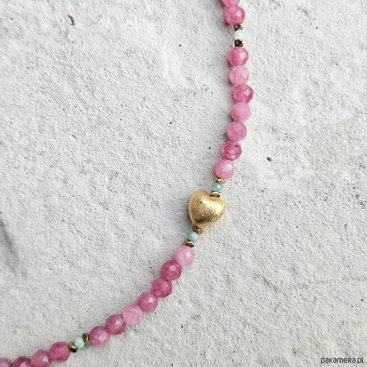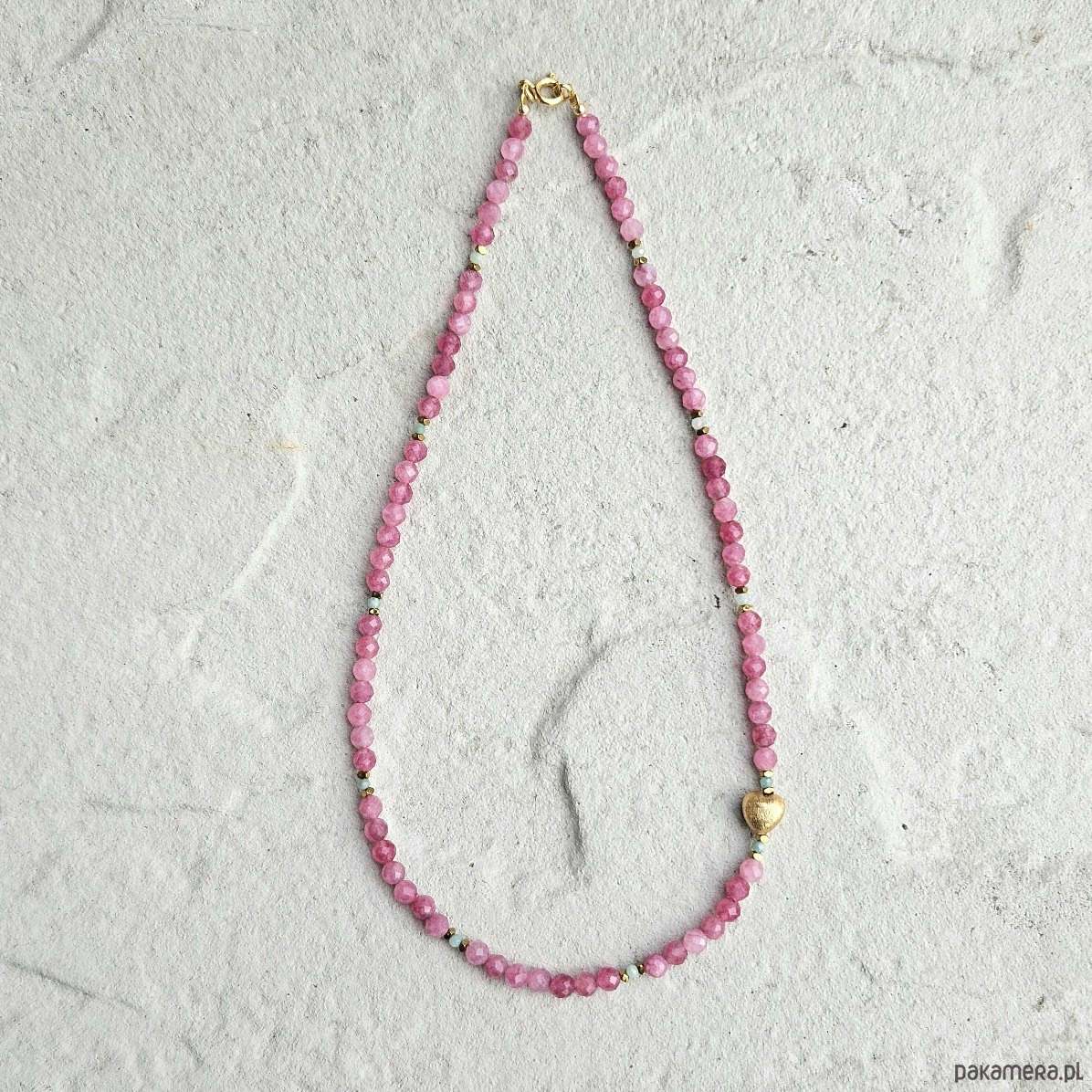 Choker z turmalinu różowego i amazonitu to połączenie subtelnej kobiecości z energią spokoju i harmonii. Fasetowane 4 mm kulki turmalinu otulają swoją delikatną barwą, wspierając otwarcie serca i równowagę emocjonalną, natomiast drobne, 2 mm kuleczki amazonitu wnoszą świeżość i lekkość. Całość przeplatana złotymi hematytami, podkreślającymi blask kamieni, zwieńczona została asymetrycznie umieszczonym sercem ze złoconego srebra. Choker doskonale współgra z energią Byka, Wagi i Ryb, harmonizując czakrę serca i wprowadzając uczucie bezpieczeństwa oraz wewnętrznego ciepła. To biżuteria stworzona dla osób, które cenią delikatność, ale jednocześnie chcą podkreślić swoją siłę i niezależność. Połączenie pastelowych odcieni z eleganckim złotem sprawia, że choker pasuje zarówno do codziennych, jak i bardziej wyjątkowych stylizacji.