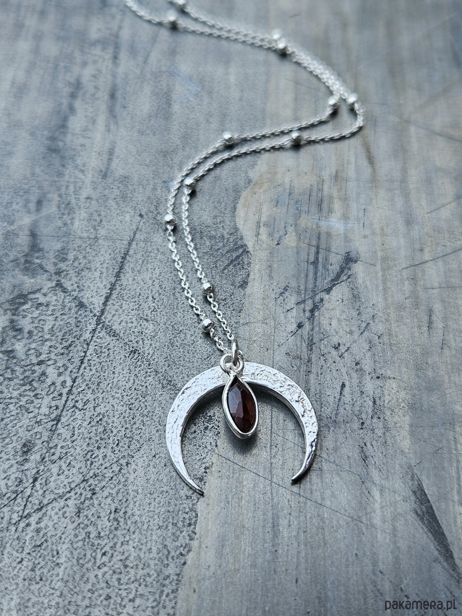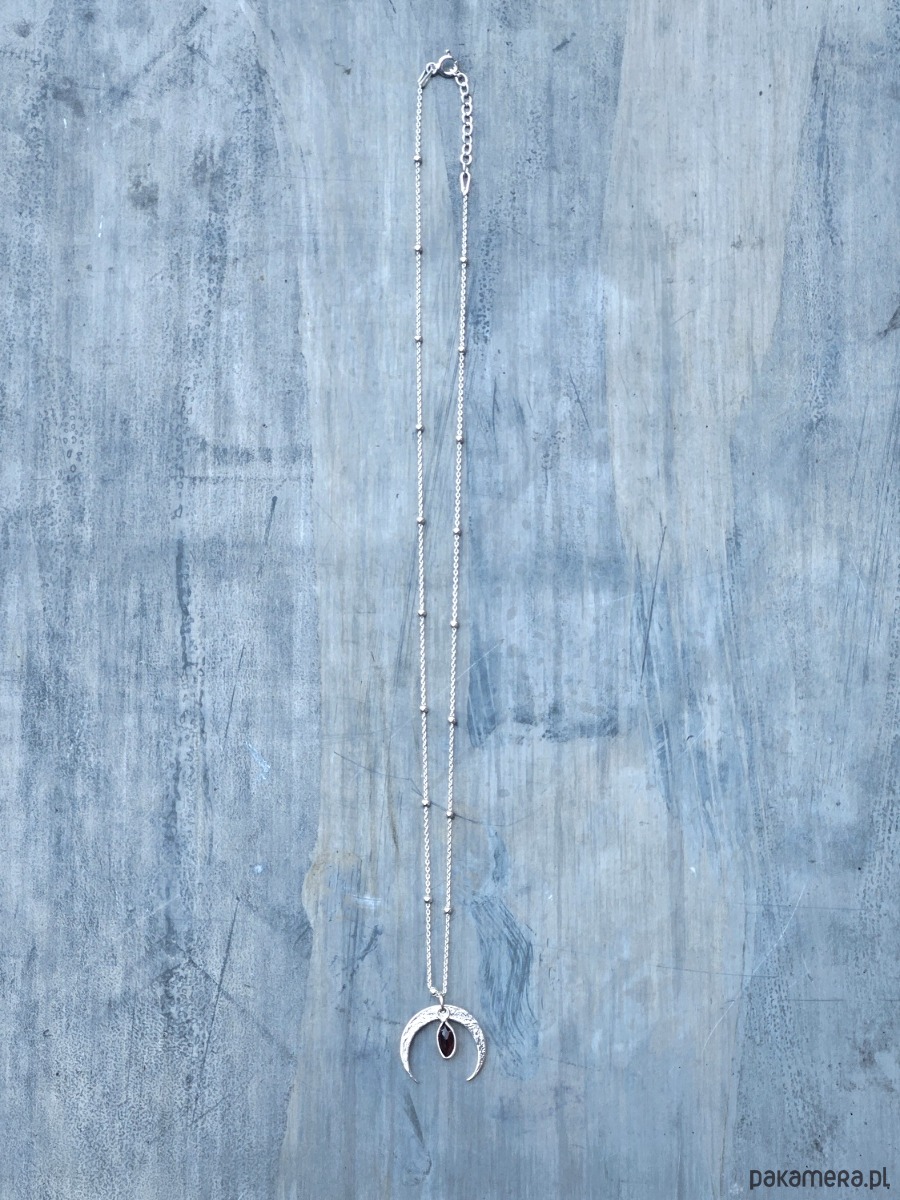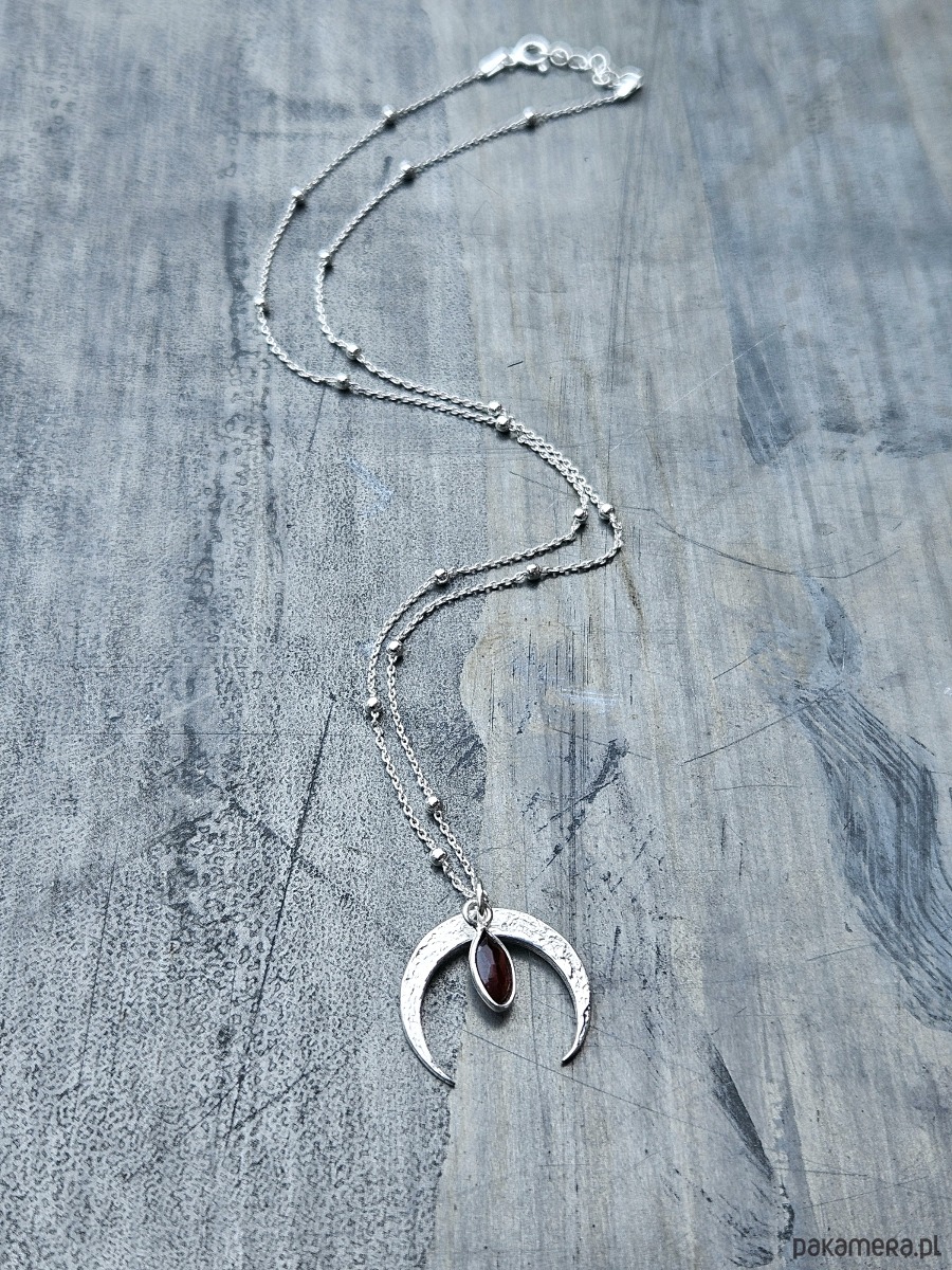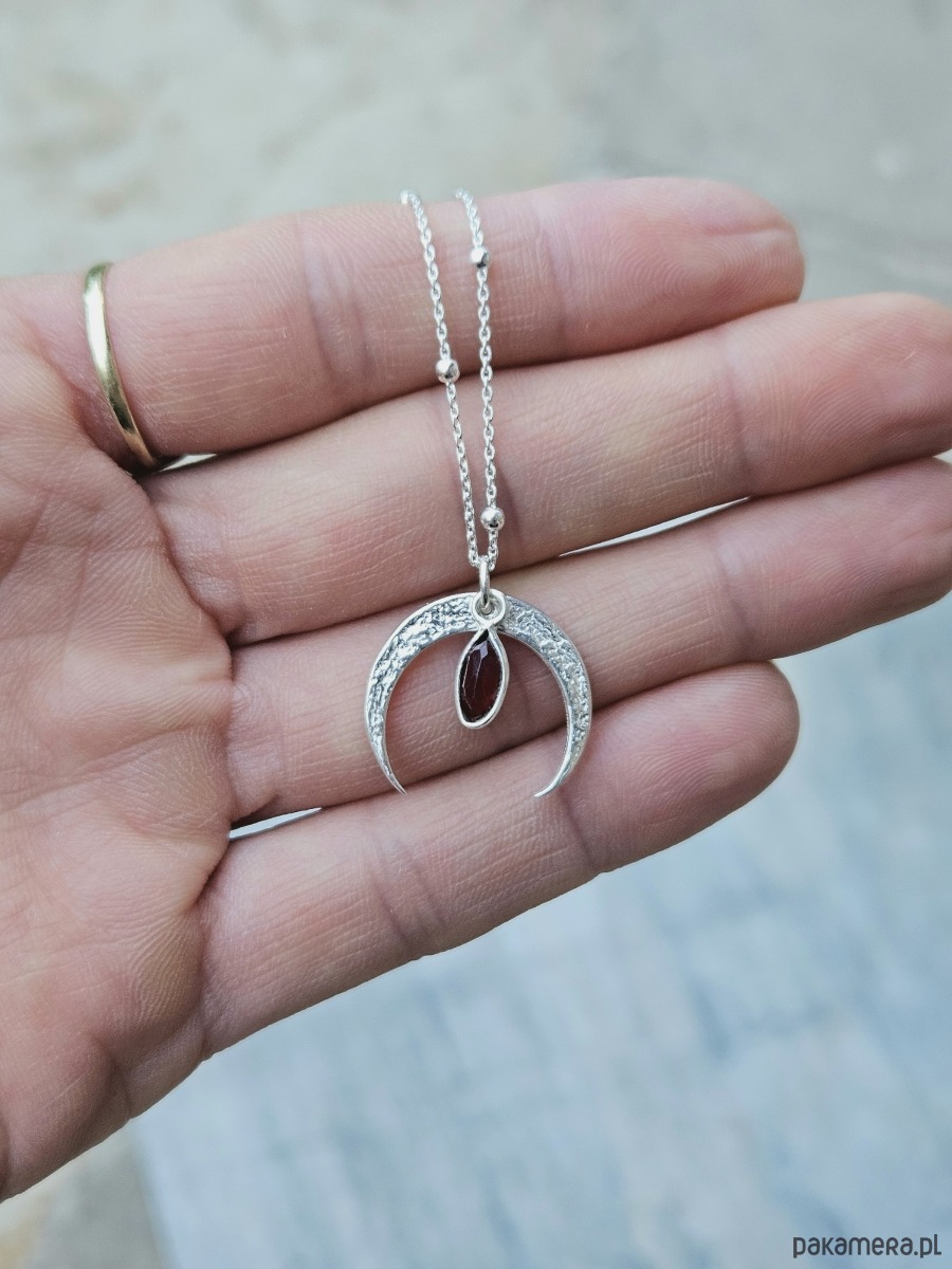 Delikatny, ale wyrazisty naszyjnik wykonany ze srebra próby 925 to połączenie subtelnego łańcuszka typu "simple" z kuleczkami i dwóch zawieszek: granatu w kształcie łezki oraz młotkowanej lunuli – symbolu kobiecej siły, cykliczności i harmonii z naturą. Granat to kamień odwagi, pasji i transformacji. Wzmacnia silną wolę i pomaga ruszyć naprzód, szczególnie wtedy, gdy życie wymaga od nas odważnych decyzji. Symbolizuje też głębokie uczucia, namiętność i zaangażowanie.